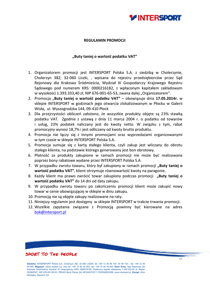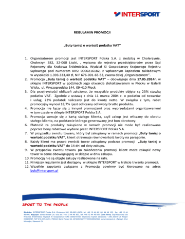 REGULAMIN PROMOCJI „Buty taniej o wartość podatku VAT” 1. Organizatorem promocji jest INTERSPORT Polska S.A. z siedzibą w Cholerzynie, Cholerzyn 382, 32-060 Liszki, , wpisana do rejestru przedsiębiorców przez Sąd Rejonowy dla Krakowa Śródmieścia, Wydział XI Gospodarczy Krajowego Rejestru Sądowego pod numerem KRS: 0000216182, z wpłaconym kapitałem zakładowym w wysokości 1.393.333,40 zł, NIP 676-001-65-53, zwana dalej „Organizatorem”. 2. Promocja „Buty taniej o wartość podatku VAT” – obowiązuje dnia 17.05.2014r. w sklepie INTERSPORT w godzinach jego otwarcia zlokalizowanym w Płocku w Galerii Wisła, ul. Wyszogrodzka 144, 09-410 Płock 3. Dla przejrzystości obliczeo założono, że wszystkie produkty objęte są 23% stawką podatku VAT. Zgodnie z ustawą z dnia 11 marca 2004 r. o podatku od towarów i usług, 23% podatek naliczany jest do kwoty netto. W związku z tym, rabat promocyjny wynosi 18,7% i jest odliczany od kwoty brutto produktu. 4. Promocja nie łączy się z innymi promocjami oraz wyprzedażami organizowanymi w tym czasie w sklepie INTERSPORT Polska S.A. 5. Promocja sumuje się z kartą stałego klienta, czyli zakup jest wliczany do obrotu stałego klienta, na podstawie którego generowany jest bon obrotowy. 6. Płatnośd za produkty zakupione w ramach promocji nie może byd realizowana poprzez bony rabatowe wydane przez INTERSPORT Polska S.A. 7. W przypadku zwrotu towaru, który był zakupiony w ramach promocji „Buty taniej o wartość podatku VAT”, klient otrzymuje równowartośd kwoty na paragonie. 8. Każdy klient ma prawo zwrócid towar zakupiony podczas promocji „Buty taniej o wartość podatku VAT” do 14 dni od daty zakupu. 9. W przypadku zwrotu towaru po zakooczeniu promocji klient może zakupid nowy towar w cenie obowiązującej w sklepie w dniu zakupu. 10. Promocją nie są objęte zakupy realizowane na raty. 11. Niniejszy regulamin jest dostępny w sklepie INTERSPORT w trakcie trwania promocji. 12. Wszelkie zapytania związane z Promocją powinny byd kierowane na adres [email protected] 1/1 Siedziba: INTERSPORT Polska S.A. Cholerzyn 382, 32-060 LISZKI, tel: +48 12 44 48 100, 44 48 103, fax: +48 12 44 48 000, Magazyn: adres dostaw j.w. oraz tel: +48 12 44 48 853, fax: +48 12 44 48 850. Dane firmy: Sąd Rejonowy dla Krakowa Śródmieścia Wydział XI Gospodarczy KRS 0000216182, Wpłacony kapitał zakładowy 1.393.333,40 zł; Regon 003900187, NIP 676-001-65-53, PEKAO Bank Pekao SA 48124047221111000048552358, www.intersport.pl. Zarząd: Artur Mikołajko, Sławomir Gil