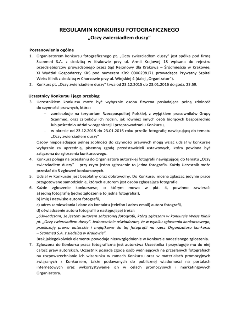 REGULAMIN KONKURSU FOTOGRAFICZNEGO „Oczy zwierciadłem duszy” Postanowienia ogólne 1. Organizatorem konkursu fotograficznego pt. „Oczy zwierciadłem duszy” jest spółka pod firmą Scanmed S.A. z siedzibą w Krakowie przy ul. Armii Krajowej 18 wpisana do rejestru przedsiębiorców prowadzonego przez Sąd Rejonowy dla Krakowa – Śródmieścia w Krakowie, XI Wydział Gospodarczy KRS pod numerem KRS: 0000298171 prowadząca Prywatny Szpital Weiss Klinik z siedzibą w Chorzowie przy ul. Wiejskiej 4 (dalej „Organizator”). 2. Konkurs pt. „Oczy zwierciadłem duszy” trwa od 23.12.2015 do 23.01.2016 do godz. 23.59. Uczestnicy Konkursu i jego przebieg 3. Uczestnikiem konkursu może być wyłącznie osoba fizyczna posiadająca pełną zdolność do czynności prawnych, która: zamieszkuje na terytorium Rzeczpospolitej Polskiej, z wyjątkiem pracowników Grupy Scanmed, oraz członków ich rodzin, jak również innych osób biorących bezpośrednio lub pośrednio udział w organizacji i przeprowadzaniu Konkursu, w okresie od 23.12.2015 do 23.01.2016 roku prześle fotografię nawiązującą do tematu „Oczy zwierciadłem duszy” Osoby nieposiadające pełnej zdolności do czynności prawnych mogą wziąć udział w konkursie wyłącznie za uprzednią, pisemną zgodą przedstawicieli ustawowych, która powinna być załączona do zgłoszenia konkursowego. 4. Konkurs polega na przesłaniu do Organizatora autorskiej fotografii nawiązującej do tematu „Oczy zwierciadłem duszy” – przy czym jedno zgłoszenie to jedna fotografia. Każdy Uczestnik może przesłać do 5 zgłoszeń konkursowych. 5. Udział w Konkursie jest bezpłatny oraz dobrowolny. Do Konkursu można zgłaszać jedynie prace przygotowane samodzielnie, których autorem jest osoba zgłaszająca fotografie. 6. Każde zgłoszenie konkursowe, o którym mowa w pkt. 4, powinno zawierać: a) jedną fotografię (jedno zgłoszenie to jedna fotografia!), b) imię i nazwisko autora fotografii, c) adres zamieszkania i dane do kontaktu (telefon i adres email) autora fotografii, d) oświadczenie autora fotografii o następującej treści: „Oświadczam, że jestem autorem załączonej fotografii, którą zgłaszam w konkursie Weiss Klinik pt. „Oczy zwierciadłem duszy”. Jednocześnie oświadczam, że w wyniku zgłoszenia konkursowego, przekazuję prawa autorskie i majątkowe do tej fotografii na rzecz Organizatora konkursu – Scanmed S.A. z siedzibą w Krakowie”. Brak jakiegokolwiek elementu powoduje nieuwzględnienie w Konkursie nadesłanego zgłoszenia. 7. Zgłoszona do Konkursu praca fotograficzna jest autorstwa Uczestnika i przysługuje mu do niej całość praw autorskich. Uczestnik posiada zgodę osób widniejących na przesłanych fotografiach na rozpowszechnianie ich wizerunku w ramach Konkursu oraz w materiałach promocyjnych związanych z Konkursem, także podawanych do publicznej wiadomości na portalach internetowych oraz wykorzystywanie ich w celach promocyjnych i marketingowych Organizatora. 8. Poprzez wysłanie zgłoszenia konkursowego, autor fotografii (Uczestnik konkursu) oświadcza, że zapoznał się z niniejszym regulaminem i go akceptuje 9. Uczestnik konkursu poprzez zgłoszenie udziału w konkursie wyraża zgodę na przetwarzanie danych osobowych. Administratorem danych osobowych jest Scanmed S.A. z siedzibą w Krakowie przy ul. Armii Krajowej 18 wpisana do rejestru przedsiębiorców prowadzonego przez Sąd Rejonowy dla Krakowa – Śródmieścia w Krakowie, XI Wydział Gospodarczy KRS pod numerem KRS: 0000298171. Dane osobowe są przetwarzane w celu przeprowadzeniu konkursu „Oczy zwierciadłem duszy”. Uczestnik ma prawo do dostępu do swoich danych i ich poprawiania. Podanie danych osobowych jest w pełni dobrowolne. Uczestnik ma prawo żądać usunięcia swoich danych osobowych. 10. Zgłoszenia konkursowe należy przesłać w nieprzekraczalnym terminie do 23.01.2016 r. do godz. 23.59 (w przypadku zgłoszeń pocztą tradycyjną liczy się data stempla pocztowego): a) pocztą elektroniczną – na adres: [email protected] (w temacie wiadomości: „Konkurs fotograficzny”), b) pocztą tradycyjną – na adres: Prywatny Szpital Weiss Klinik, ul. Wiejska 4, 41-503 Chorzów (z dopiskiem: „Konkurs fotograficzny”), c) pozostawić w Biurze Obsługi Pacjenta w wybranej placówce Weiss Klinik – w Chorzowie (ul. Wiejska 4) lub w Gliwicach (ul. Zygmunta Starego 34). 11. Niedopuszczalne są zgłoszenia prac: a) nie swojego autorstwa, b) naruszające jakiekolwiek dobra innych osób i podmiotów, c) sprzeczne z prawem i dobrymi obyczajami. 12. Organizator zastrzega sobie prawo do usunięcia zdjęć, które nie spełniają warunków Konkursu. W takiej sytuacji zgłaszającemu nie przysługują żadne roszczenia wobec Organizatora. 13. Spośród wszystkich przesłanych fotografii (zgłoszeń), Organizator wybierze jedną jego zdaniem najciekawszą, a jej autora uhonoruje bonem o wartości 500 zł na usługi dostępne w Weiss Klinik (badania, zabiegi, oferta salonu Weiss Optic). Zwycięzca konkursu sam decyduje o wyborze usług z oferty Weiss Klinik. Bon nie podlega wymianie na gotówkę i nie może być przedmiotem obrotu. 14. Organizator zastrzega sobie prawo do przyznania wyróżnień i nagrodzenia ich autorów innymi upominkami. Przyznane upominki nie podlegają wymianie na gotówkę. 15. Wyniki konkursu i Laureaci zostaną ogłoszeni w dniu 31.01.2016 r. na fanpage Weiss Klinik w serwisie Facebook (www.facebook.com/WeissKlinik) oraz na stronie internetowej Weiss Klinik (www.weissklinik.pl). 16. Laureaci zostaną powiadomieni o przyznanych nagrodach w terminie 7 dni roboczych od daty rozstrzygnięcia Konkursu, na adres e-mail i telefonicznie. 17. Nagrody zostaną przekazane Laureatom Konkursu w terminie nieprzekraczającym 30 dni od daty ogłoszenia wyników. Nagrodzony Uczestnik Konkursu może zrzec się Nagrody, ale w zamian nie przysługuje mu ekwiwalent pieniężny, ani jakakolwiek inna nagroda. 1