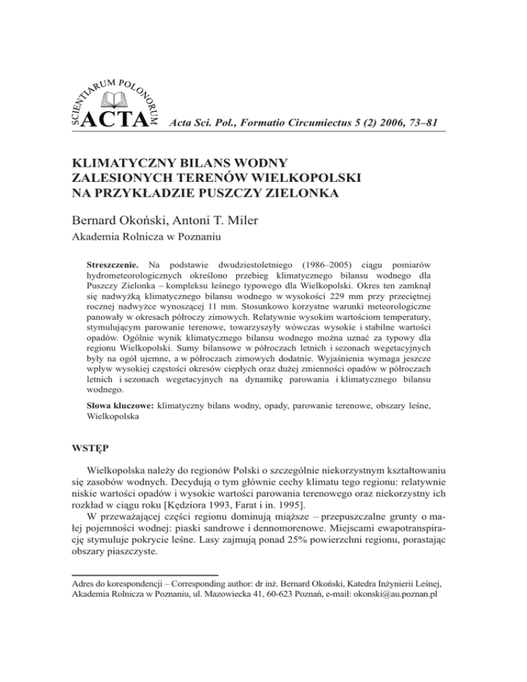 Acta Sci. Pol., Formatio Circumiectus 5 (2) 2006, 73–81 KLIMATYCZNY BILANS WODNY ZALESIONYCH TERENÓW WIELKOPOLSKI NA PRZYKŁADZIE PUSZCZY ZIELONKA Bernard Okoński, Antoni T. Miler Akademia Rolnicza w Poznaniu Streszczenie. Na podstawie dwudziestoletniego (1986–2005) ciągu pomiarów hydrometeorologicznych określono przebieg klimatycznego bilansu wodnego dla Puszczy Zielonka – kompleksu leśnego typowego dla Wielkopolski. Okres ten zamknął się nadwyżką klimatycznego bilansu wodnego w wysokości 229 mm przy przeciętnej rocznej nadwyżce wynoszącej 11 mm. Stosunkowo korzystne warunki meteorologiczne panowały w okresach półroczy zimowych. Relatywnie wysokim wartościom temperatury, stymulującym parowanie terenowe, towarzyszyły wówczas wysokie i stabilne wartości opadów. Ogólnie wynik klimatycznego bilansu wodnego można uznać za typowy dla regionu Wielkopolski. Sumy bilansowe w półroczach letnich i sezonach wegetacyjnych były na ogół ujemne, a w półroczach zimowych dodatnie. Wyjaśnienia wymaga jeszcze wpływ wysokiej częstości okresów ciepłych oraz dużej zmienności opadów w półroczach letnich i sezonach wegetacyjnych na dynamikę parowania i klimatycznego bilansu wodnego. Słowa kluczowe: klimatyczny bilans wodny, opady, parowanie terenowe, obszary leśne, Wielkopolska WSTĘP Wielkopolska należy do regionów Polski o szczególnie niekorzystnym kształtowaniu się zasobów wodnych. Decydują o tym głównie cechy klimatu tego regionu: relatywnie niskie wartości opadów i wysokie wartości parowania terenowego oraz niekorzystny ich rozkład w ciągu roku [Kędziora 1993, Farat i in. 1995]. W przeważającej części regionu dominują miąższe – przepuszczalne grunty o małej pojemności wodnej: piaski sandrowe i dennomorenowe. Miejscami ewapotranspirację stymuluje pokrycie leśne. Lasy zajmują ponad 25% powierzchni regionu, porastając obszary piaszczyste. Adres do korespondencji – Corresponding author: dr inż. Bernard Okoński, Katedra Inżynierii Leśnej, Akademia Rolnicza w Poznaniu, ul. Mazowiecka 41, 60-623 Poznań, e-mail: [email protected] 74 B. Okoński, A.T. Miler Powszechnie wiadomo, że dostępność wody jest czynnikiem współdecydującym o wielkości produkcji biomasy. Dlatego niekorzystny przebieg warunków pogodowych (głównie opadowych i termicznych) w typowych warunkach regionu ujemnie wpływa zarówno na agrocenozy, jak i na obszary leśne – w takich okresach pogarsza się produkcja roślinna, a także zmniejsza się przyrost drzewostanów oraz produkcyjność i zdrowotność lasu, przekształcają się też siedliska leśne [Czarnowski 1989, Słota 1992, Zielski 1996, Suliński 2002]. W kontekście przedstawionych uwarunkowań dużego znaczenia nabiera ustalenie, jak w warunkach typowych dla leśnych obszarów regionu kształtują się zasoby wodne w dłuższym okresie. Szczegółowe bilansy hydrologiczne są sporządzane stosunkowo rzadko. Na ogół brak pełnych danych hydrologicznych, które umożliwiałyby prześledzenie procesów zachodzących w ekosystemach na tle dynamiki warunków wodnych w okresach wieloletnich [Farat i in. 1995]. Klimatyczny bilans wodny jest jedną z miar wykorzystywanych do oceny kształtowania się warunków wilgotnościowych danego okresu, prawdopodobnie najpełniejszą, ponieważ uwzględnia zarówno opady, jak i ewapotranspirację. W praktyce stosuje się go często jako miarę do wyznaczania okresów susz oraz oceniania dostępności wody dla roślin w okresie wegetacji [Dubicki 2002]. W pracy przedstawiono klimatyczny bilans wodny obszaru zalesionego na tle warunków termiczno-opadowych w stosunkowo długim okresie oraz określono czynniki mające wpływ na ten bilans. Wybrano typowy dla Wielkopolski kompleks leśny Puszcza Zielonka o potencjalnie niekorzystnych warunkach wodnych. MATERIAŁ I METODY Badaniami objęto Puszczę Zielonka położoną w środkowej części Wielkopolski. Elementy klimatycznego bilansu wodnego – opady i parowanie terenowe – obliczano na podstawie dobowych sum opadów atmosferycznych, przeciętnych dobowych temperatur powietrza oraz prężności pary wodnej. Potrzebne dane pochodziły z pomiarów wykonywanych w latach 1986–2005 na stacji meteorologicznej Akademii Rolniczej w Poznaniu, zlokalizowanej w miejscowości Zielonka [Grodzki i Zientarski 1987–2006]. Parowanie terenowe (ewapotranspirację) obliczono metodą Konstantinowa [1963]. Metoda ta opiera się na założeniach teorii dyfuzji turbulentnej i jest stosowana do szacowania parowania terenowego w większych jednostkach przestrzennych, np. zlewniach. Na obszarze Wielkopolski metoda Konstantinowa została zweryfikowana dla małych zlewni o dużym stopniu lesistości [Miler 1997]. Do scharakteryzowania warunków termiczno-opadowych w Puszczy Zielonka w okresie 1986–2005 wykorzystano prawdopodobieństwo wystąpienia przeciętnych rocznych temperatur oraz sum opadów wraz z wyższymi w odniesieniu do okresu długiego 1848–2005. Dane termiczno-opadowe za lata 1948–1985 uzyskano z zależności korelacyjnej między danymi z Puszczy Zielonka i danymi z położonej najbliżej niej stacji meteorologicznej Instytutu Meteorologii i Gospodarki Wodnej Poznań-Ławica [Sumy opadów… 2006, Średnie temperatury… 2006]. Taka procedura określania brakujących danych wydaje się zasadna, ponieważ wykazano bardzo silną zależność linio- Acta Sci. Pol. Klimatyczny bilans wodny zalesionych terenów Wielkopolski... 75 wą między odpowiadającymi sobie danymi temperaturowymi (r = 0,9989) i opadowymi (r = 0,9244). Puszcza Zielonka jest zwartym obszarem leśnym położonym na wschód od rzeki Warty, w odległości 5 km na północny wschód od Poznania. Zajmuje ok. 15 tys. ha i stanowi jeden z większych zwartych obszarów leśnych w bezleśnej na ogół środkowej Wielkopolsce. Łącznie z Lasami Czerniejewskimi (ok. 12 tys. ha) na południowym wschodzie oraz lasami Puszczy Noteckiej (ok. 130 tys. ha) na