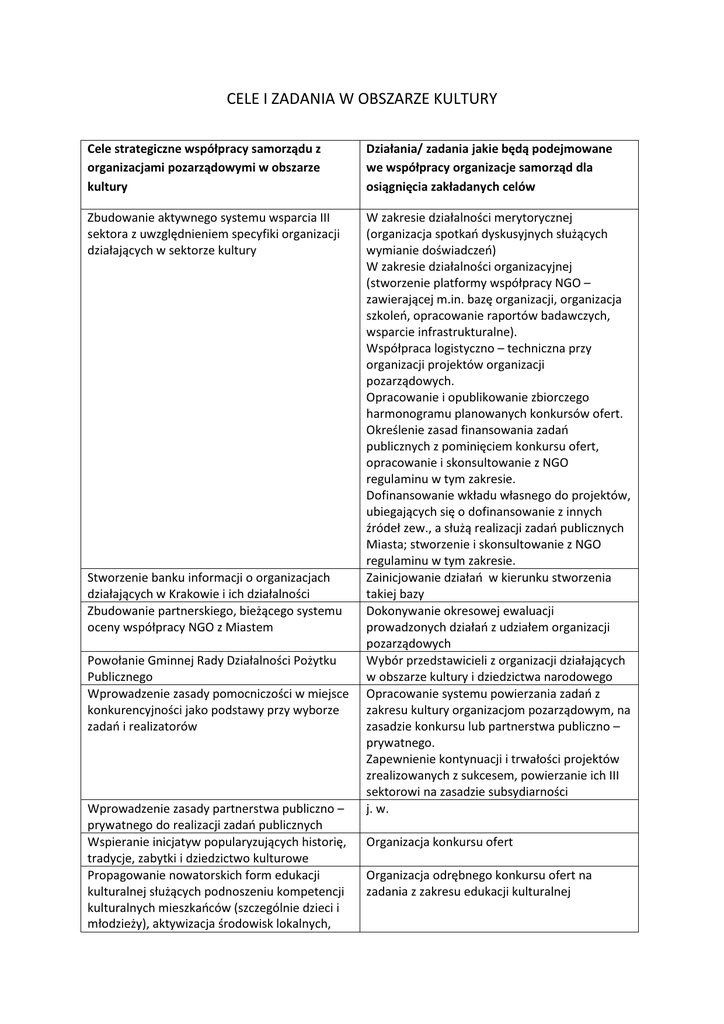 CELE I ZADANIA W OBSZARZE KULTURY Cele strategiczne współpracy samorządu z organizacjami pozarządowymi w obszarze kultury Działania/ zadania jakie będą podejmowane we współpracy organizacje samorząd dla osiągnięcia zakładanych celów Zbudowanie aktywnego systemu wsparcia III sektora z uwzględnieniem specyfiki organizacji działających w sektorze kultury W zakresie działalności merytorycznej (organizacja spotkań dyskusyjnych służących wymianie doświadczeń) W zakresie działalności organizacyjnej (stworzenie platformy współpracy NGO – zawierającej m.in. bazę organizacji, organizacja szkoleń, opracowanie raportów badawczych, wsparcie infrastrukturalne). Współpraca logistyczno – techniczna przy organizacji projektów organizacji pozarządowych. Opracowanie i opublikowanie zbiorczego harmonogramu planowanych konkursów ofert. Określenie zasad finansowania zadań publicznych z pominięciem konkursu ofert, opracowanie i skonsultowanie z NGO regulaminu w tym zakresie. Dofinansowanie wkładu własnego do projektów, ubiegających się o dofinansowanie z innych źródeł zew., a służą realizacji zadań publicznych Miasta; stworzenie i skonsultowanie z NGO regulaminu w tym zakresie. Zainicjowanie działań w kierunku stworzenia takiej bazy Dokonywanie okresowej ewaluacji prowadzonych działań z udziałem organizacji pozarządowych Wybór przedstawicieli z organizacji działających w obszarze kultury i dziedzictwa narodowego Opracowanie systemu powierzania zadań z zakresu kultury organizacjom pozarządowym, na zasadzie konkursu lub partnerstwa publiczno – prywatnego. Zapewnienie kontynuacji i trwałości projektów zrealizowanych z sukcesem, powierzanie ich III sektorowi na zasadzie subsydiarności j. w. Stworzenie banku informacji o organizacjach działających w Krakowie i ich działalności Zbudowanie partnerskiego, bieżącego systemu oceny współpracy NGO z Miastem Powołanie Gminnej Rady Działalności Pożytku Publicznego Wprowadzenie zasady pomocniczości w miejsce konkurencyjności jako podstawy przy wyborze zadań i realizatorów Wprowadzenie zasady partnerstwa publiczno – prywatnego do realizacji zadań publicznych Wspieranie inicjatyw popularyzujących historię, tradycje, zabytki i dziedzictwo kulturowe Propagowanie nowatorskich form edukacji kulturalnej służących podnoszeniu kompetencji kulturalnych mieszkańców (szczególnie dzieci i młodzieży), aktywizacja środowisk lokalnych, Organizacja konkursu ofert Organizacja odrębnego konkursu ofert na zadania z zakresu edukacji kulturalnej włączanie nowych grup uczestników, wspieranie artystycznej twórczości amatorskiej, upowszechnianie kultury w różnych dziedzinach i formach artystycznych Wspieranie innowacyjnych projektów artystycznych realizowanych przez krakowskie środowisko Zwiększenie nakładów na edukację obywatelską, medialną i kulturalną. Wsparcie artystycznych imprez środowiskowych i innych projektów kulturalnych integrujących społeczność lokalną Organizacja konkursu ofert Organizacja konkursu ofert W tym: wspieranie twórczości i edukacji artystycznej osób niepełnosprawnych. Ponadto: Zgromadzenie w jednym dokumencie wszystkich zasad i warunków współpracy organizacji pozarządowych z Miastem (regulamin konkursów ofert, regulamin KDS i inne).
