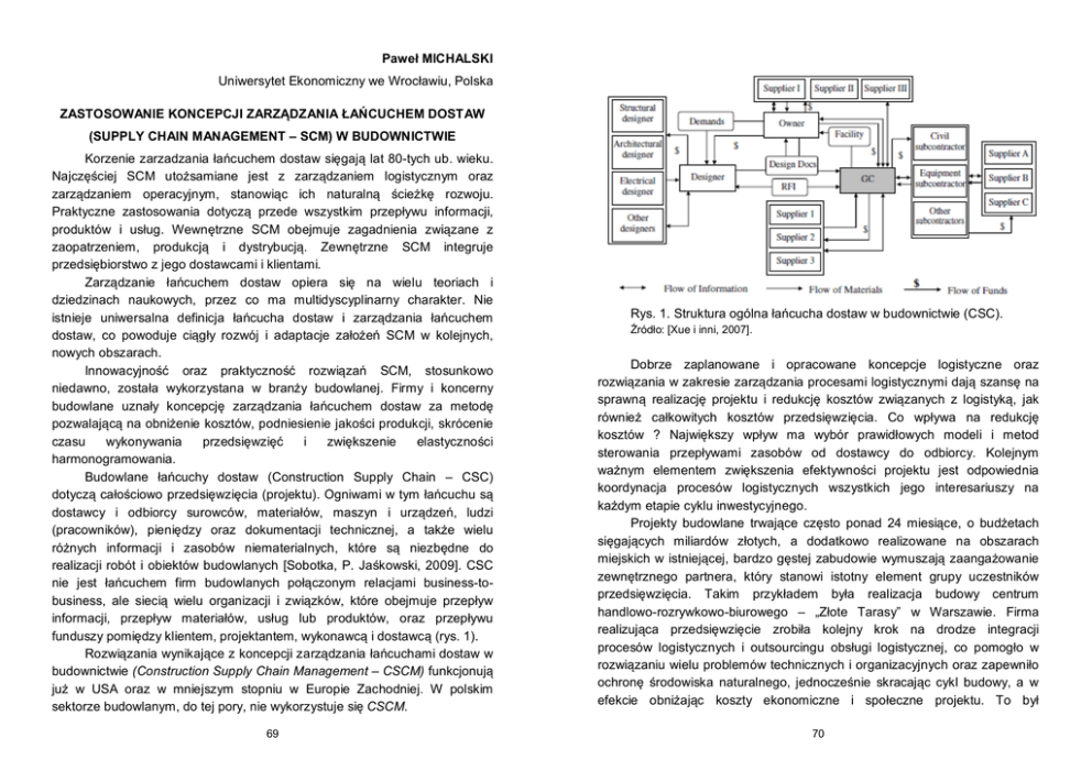 Paweł MICHALSKI Uniwersytet Ekonomiczny we Wrocławiu, Polska ZASTOSOWANIE KONCEPCJI ZARZĄDZANIA ŁAŃCUCHEM DOSTAW (SUPPLY CHAIN MANAGEMENT – SCM) W BUDOWNICTWIE Korzenie zarzadzania łańcuchem dostaw sięgają lat 80-tych ub. wieku. Najczęściej SCM utożsamiane jest z zarządzaniem logistycznym oraz zarządzaniem operacyjnym, stanowiąc ich naturalną ścieżkę rozwoju. Praktyczne zastosowania dotyczą przede wszystkim przepływu informacji, produktów i usług. Wewnętrzne SCM obejmuje zagadnienia związane z zaopatrzeniem, produkcją i dystrybucją. Zewnętrzne SCM integruje przedsiębiorstwo z jego dostawcami i klientami. Zarządzanie łańcuchem dostaw opiera się na wielu teoriach i dziedzinach naukowych, przez co ma multidyscyplinarny charakter. Nie istnieje uniwersalna definicja łańcucha dostaw i zarządzania łańcuchem dostaw, co powoduje ciągły rozwój i adaptacje założeń SCM w kolejnych, nowych obszarach. Innowacyjność oraz praktyczność rozwiązań SCM, stosunkowo niedawno, została wykorzystana w branży budowlanej. Firmy i koncerny budowlane uznały koncepcję zarządzania łańcuchem dostaw za metodę pozwalającą na obniżenie kosztów, podniesienie jakości produkcji, skrócenie czasu wykonywania przedsięwzięć i zwiększenie elastyczności harmonogramowania. Budowlane łańcuchy dostaw (Construction Supply Chain – CSC) dotyczą całościowo przedsięwzięcia (projektu). Ogniwami w tym łańcuchu są dostawcy i odbiorcy surowców, materiałów, maszyn i urządzeń, ludzi (pracowników), pieniędzy oraz dokumentacji technicznej, a także wielu różnych informacji i zasobów niematerialnych, które są niezbędne do realizacji robót i obiektów budowlanych [Sobotka, P. Jaśkowski, 2009]. CSC nie jest łańcuchem firm budowlanych połączonym relacjami business-tobusiness, ale siecią wielu organizacji i związków, które obejmuje przepływ informacji, przepływ materiałów, usług lub produktów, oraz przepływu funduszy pomiędzy klientem, projektantem, wykonawcą i dostawcą (rys. 1). Rozwiązania wynikające z koncepcji zarządzania łańcuchami dostaw w budownictwie (Construction Supply Chain Management – CSCM) funkcjonują już w USA oraz w mniejszym stopniu w Europie Zachodniej. W polskim sektorze budowlanym, do tej pory, nie wykorzystuje się CSCM. 69 Rys. 1. Struktura ogólna łańcucha dostaw w budownictwie (CSC). Źródło: [Xue i inni, 2007]. Dobrze zaplanowane i opracowane koncepcje logistyczne oraz rozwiązania w zakresie zarządzania procesami logistycznymi dają szansę na sprawną realizację projektu i redukcję kosztów związanych z logistyką, jak również całkowitych kosztów przedsięwzięcia. Co wpływa na redukcję kosztów ? Największy wpływ ma wybór prawidłowych modeli i metod sterowania przepływami zasobów od dostawcy do odbiorcy. Kolejnym ważnym elementem zwiększenia efektywności projektu jest odpowiednia koordynacja procesów logistycznych wszystkich jego interesariuszy na każdym etapie cyklu inwestycyjnego. Projekty budowlane trwające często ponad 24 miesiące, o budżetach sięgających miliardów złotych, a dodatkowo realizowane na obszarach miejskich w istniejącej, bardzo gęstej zabudowie wymuszają zaangażowanie zewnętrznego partnera, który stanowi istotny element grupy uczestników przedsięwzięcia. Takim przykładem była realizacja budowy centrum handlowo-rozrywkowo-biurowego – „Złote Tarasy” w Warszawie. Firma realizująca przedsięwzięcie zrobiła kolejny krok na drodze integracji procesów logistycznych i outsourcingu obsługi logistycznej, co pomogło w rozwiązaniu wielu problemów technicznych i organizacyjnych oraz zapewniło ochronę środowiska naturalnego, jednocześnie skracając cykl budowy, a w efekcie obniżając koszty ekonomiczne i społeczne projektu. To był 70 równocześnie kolejny etap zbliżający projekt (i generalnego wykonawcę) do zastosowania rozwiązań z zakresu CSCM. Wysokie ryzyko inwestycji budowlanych, kryzys na rynku kredytów hipotecznych oraz wysokie wymagania klientów – tak wygląda w skrócie rynek nieruchomości w Polsce. Poszukiwane są rozwiązania, z jednej strony minimalizujące koszty wykonawców, z drugiej ważne jest, aby została zachowana wysoka jakość produktu. Czy CSCM może być odpowiedzią na obecny stan rzeczy ? Literatura 1. Sobotka A., Jaśkowski P., Zarządzanie łańcuchem dostaw w realizacji przedsięwzięć budowlanych, GMiL nr 11/2009 2. X. Xue, Y. Wang, Q. Shen, X. Yu, Coordination mechanisms for construction supply chain management in the Internet environment, „International Journal of Project Management” 25/2007 Григорій МОНАСТИРСЬКИЙ Тернопільський національний економічний університет, Україна ВНУТРІШНЬОРЕГІОНАЛЬНІ ІНТЕГРАЦІЙНІ ПРОЦЕСИ ЯК ТЕХНОЛОГІЯ ЗАБЕЗПЕЧЕННЯ ЕКОНОМІЧНОГО ТА СОЦІАЛЬНОГО РОЗВИТКУ ТЕРИТОРІАЛЬНИХ ГРОМАД В УМОВАХ РЕСУРСНОЇ ОБМЕЖЕНОСТІ Для вирішення питань місцевого значення виникає потреба в господарській співпраці, об’єднанні матеріальних, фінансових та інших ресурсів, координації діяльності територіальних громад та їх підсистем, як в регіональному, так і національному масштабах, що є вагомим полігоном модернізації технологій забезпечення місцевого економічного та соціального розвитку в умовах ресурсної обмеженості. Економічний та соціальний розвиток ресурсно та просторово невід’єм