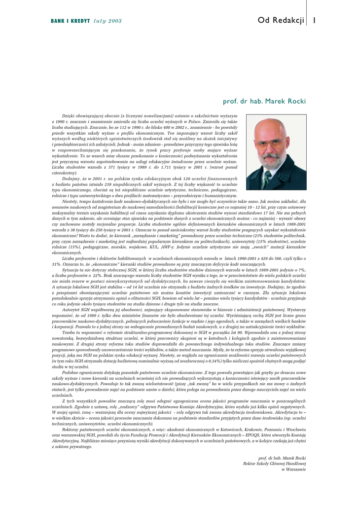 BANK I KREDYT l u t y 2 0 0 3 Od Redakcji 1 prof. dr hab. Marek Rocki Dzi´ki obowiàzujàcej obecnie (z licznymi nowelizacjami) ustawie o szkolnictwie wy˝szym z 1990 r. znacznie i znamiennie zmieni∏a si´ liczba uczelni wy˝szych w Polsce. Zmieni∏a si´ tak˝e liczba studiujàcych. Znacznie, bo ze 112 w 1990 r. do blisko 400 w 2002 r., znamiennie - bo powsta∏y przede wszystkim szko∏y wy˝sze o profilu ekonomicznym. Ten imponujàcy wzrost liczby szkó∏ wy˝szych wed∏ug niektórych opiniotwórczych Êrodowisk sta∏ si´ mo˝liwy na skutek inicjatywy i przedsi´biorczoÊci ich za∏o˝ycieli. Jednak - moim zdaniem - prawdziwe przyczyny tego zjawiska le˝à w rozpowszechniajàcym si´ przekonaniu, ˝e rynek pracy preferuje osoby majàce wy˝sze wykszta∏cenie. To ze wszech miar s∏uszne przekonanie o koniecznoÊci podwy˝szania wykszta∏cenia jest przyczynà wzrostu zapotrzebowania na us∏ugi edukacyjne Êwiadczone przez uczelnie wy˝sze. Liczba studentów wzros∏a z 371 tysi´cy w 1989 r. do 1.711 tysi´cy w 2001 r. (wzrost ponad czterokrotny). Dodajmy, ˝e w 2001 r. na polskim rynku edukacyjnym obok 126 uczelni finansowanych z bud˝etu paƒstwa istnia∏o 239 niepublicznych szkó∏ wy˝szych. Z tej liczby wi´kszoÊç to uczelnie typu ekonomicznego, chocia˝ sà te˝ niepubliczne uczelnie artystyczne, techniczne, pedagogiczne, rolnicze i typu uniwersyteckiego o dwu profilach: matematyczno – przyrodniczym i humanistycznym. Niestety, tempo kszta∏cenia kadr naukowo–dydaktycznych nie by∏o i nie mog∏o byç oczywiÊcie takie samo. Jak mo˝na zak∏adaç, dla awansów naukowych od magisterium do naukowej samodzielnoÊci (habilitacji) konieczne jest co najmniej 10 - 12 lat, przy czym ustawowy maksymalny termin uzyskania habilitacji od czasu uzyskania dyplomu ukoƒczenia studiów wynosi standardowo 17 lat. Nie ma pe∏nych danych w tym zakresie, ale oceniajàc stan zjawiska na podstawie danych z uczelni ekonomicznych mo˝na - co najmniej - wyraziç obawy czy zachowane zosta∏y racjonalne proporcje. Liczba studentów ogólnie definiowanych kierunków ekonomicznych w latach 1989-2001 wzros∏a z 38 tysi´cy do 250 tysi´cy w 2001 r. Oznacza to ponad szeÊciokrotny wzrost liczby studentów pragnàcych uzyskaç wykszta∏cenie ekonomiczne! Warto tu dodaç, ˝e kierunek „zarzàdzanie i marketing” prowadzony przez uczelnie techniczne (21% studentów politechnik, przy czym zarzàdzenie i marketing jest najbardziej popularnym kierunkiem na politechnikach), uniwersytety (15% studentów), uczelnie rolnicze (15%), pedagogiczne, morskie, wojskowe, KUL, AWF-y. Jedynie uczelnie artystyczne nie majà „swoich” mutacji kierunków ekonomicznych. Liczba profesorów i doktorów habilitowanych w uczelniach ekonomicznych wzros∏a w latach 1990-2001 z 429 do 566, czyli tylko o 31%. Oznacza to, ˝e „ekonomiczne” kierunki studiów prowadzone sà przy znaczàcym deficycie kadr nauczajàcych. Sytuacja ta nie dotyczy sto∏ecznej SGH, w której liczba studentów studiów dziennych wzros∏a w latach 1989-2001 jedynie o 7%, a liczba profesorów o 22%. Brak znaczàcego wzrostu liczby studentów SGH wynika z tego, ˝e w przeciwieƒstwie do wielu polskich uczelni nie mia∏a rezerw w postaci niewykorzystanych sal dydaktycznych, bo zawsze cieszy∏a si´ wielkim zainteresowaniem kandydatów. A sytuacja lokalowa SGH jest stabilna – od 14 lat uczelnia nie otrzyma∏a z bud˝etu ˝adnych Êrodków na inwestycje. Dodajmy, ˝e zgodnie z przepisami obowiàzujàcymi uczelnie paƒstwowe nie mo˝na kosztów inwestycji umieszczaç w czesnym. Z∏a sytuacja lokalowa paradoksalnie sprzyja utrzymaniu opinii o elitarnoÊci SGH, bowiem od wielu lat – pomimo wielu tysi´cy kandydatów - uczelnia przyjmuje co roku jedynie oko∏o tysiàca studentów na studia dzienne i drugie tyle na studia zaoczne. Autorytet SGH wspó∏tworzà jej absolwenci, zajmujàcy eksponowane stanowiska w biznesie i administracji paƒstwowej. Wystarczy wspomnieç, ˝e od 1989 r. tylko dwu ministrów finansów nie by∏o absolwentami tej uczelni. Wyró˝niajàcà cechà SGH jest liczne grono pracowników naukowo-dydaktycznych, pe∏niàcych jednoczeÊnie funkcje w rzàdzie i jego agendach, a tak˝e w zarzàdach wielkich banków i korporacji. Pozwala to z jednej strony na wzbogacanie prowadzonych badaƒ naukowych, a z drugiej na uatrakcyjnienie treÊci wyk∏adów. Trzeba tu wspomnieç o reformie strukturalno-programowej dokonanej w SGH w poczàtku lat 90. Wprowadzi∏a ona z jednej strony nowatorskà, bezwydzia∏owà struktur´ uczelni, w której pracownicy skupieni sà w katedrach i kolegiach zgodnie z zainteresowaniami naukowymi. Z drugiej strony reforma toku studiów doprowadzi∏a do powszechnego indywidualnego toku studiów. Znaczàce zmiany programowe spowodowa∏y unowoczeÊnienie treÊci wyk∏adów, a tak˝e metod nauczania. MyÊl´, ˝e ta reforma sprzyja utrwaleniu wyjàtkowej pozycji, jakà ma SGH na polskim rynku edukacji wy˝szej. Niestety, ze wzgl´du na ograniczanie mo˝liwoÊci rozwoju uczelni paƒstwowych (w tym roku SGH otrzyma∏a dotacj´ bud˝etowà nominalnie wy˝szà od zesz∏orocznej o 0,34%) tylko nieliczni spoÊród ch´tnych mogà podjàç studia w tej uczelni. Podobne ograniczenia dotykajà pozosta∏e paƒstwowe uczelnie ekonomiczne. Z tego powodu powstajàce jak grzyby po deszczu nowe szko∏y wy˝sze i nowe kierunki na uczelniach wczeÊniej ich nie prowadzàcych wykorzystujà z koniecznoÊci istniejàcy zasób pracowników naukowo-dydaktycznych. Powoduje to tak zwanà wieloetatowoÊç (pisz´ „tak zwanà” bo w wielu przypadkach nie ma mowy o ˝adnych etatach, jest tylko prowadzenie zaj´ç na podstawie umów o dzie∏o), która polega na prowadzeniu przez danego nauczyciela zaj´ç na wielu uczelniach. Z tych wszystkich powodów znaczàcà rol´ musi odegraç egzogeniczna ocena jakoÊci programów nauczania w poszczególnych uczelniach. Zgodnie z ustawà, rol´ „nadzorcy” odgrywa Paƒ