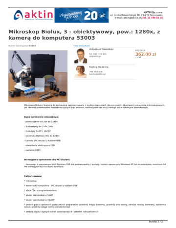 Mikroskop Biolux, 3 - obiektywowy, pow.: 1280x, z kamerą do komputera 53003 Numer katalogowy:53003 Twój konsultant Arkadiusz Trzebiński tel. 503 030 555 [email protected] NOWOŚĆ W OFERCIE 603.00 zł 362.00 zł z VAT Karina Gładecka 796 603 606 [email protected] Mikroskop Biolux z kamerą do komputera zaprojektowany z myślą o badaniach, demonstracji i obserwacji preparatów mikroskopowych, jak również przedmiotów nieprzeźroczystych (np. włókien, nasion) podczas lekcji biologii lub w szkolnych laboratoriach. Dane techniczne mikroskopu: - powiększenie od 20x do 1280x - 3 obiektywy 4x / 10x / 40x - 2 okulary 5xWF / 16xWF - soczewka Barlowa 40x do 1280x - kamera (PC-okular) z kablem USB - oświetlenie elektryczne LED - zasilanie 220V Wymagania systemowe dla PC-Okularu: - komputer z procesorem Intel Pentium 166 lub porównywalny / wyższy, system operacyjny Windows XP lub wcześniejsze, minimum 64 MB wolnej pamięci na dysku twardym. Całość zawiera: * mikroskop * kamera do komputera - (PC okular) z kablem USB * płyta CD z oprogramowaniem * okular szerokokątny 5xWF * okular szerokokątny 16xWF * zestaw pięciu gotowych pokazowych preparatów (przekrój łodygi bawełny, przekrój pnia sosny, odnóże muchy domowej, epiderma cebuli, przekrój łodygi rośliny dwuliściennej) * zestaw pięciu czystych szkieł podstawowych i szkiełek nakrywkowych Strona 1 / 2 * zestaw do przygotowywania preparatów (2 szpikulce, pęseta, nożyczki, pipeta, gilotyna do robienia przekrojów poprzecznych, pojemnik - wylęgarnia krewetek) * pojemniki z substancjami pomocniczymi ( 1-sól morska, 2-drożdże, 3-jajeczka krewetek, 4-środek wiążący preparaty) * zasilacz * pokrowiec przeciwkurzowy * przenośna torba wysokość mikroskopu: 27 cm waga mikroskopu: 1,20 kg wysokość całego zestawu : 30 cm waga całego zestawu: 3,10 kg Strona 2 / 2 Powered by TCPDF (www.tcpdf.org)