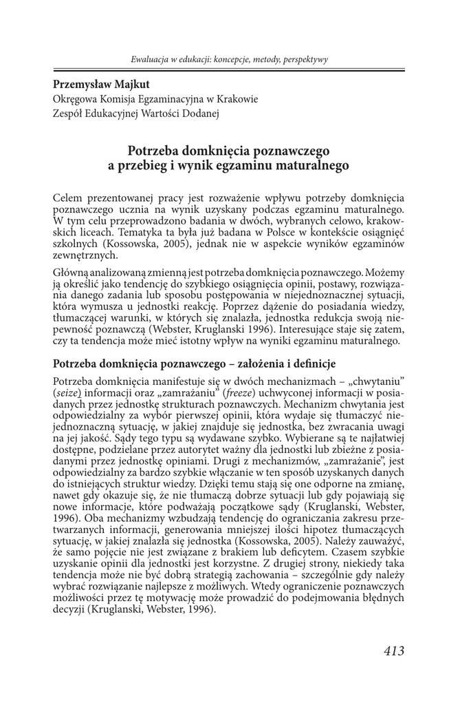 Ewaluacja w edukacji: koncepcje, metody, perspektywy Przemysław Majkut Okręgowa Komisja Egzaminacyjna w Krakowie Zespół Edukacyjnej Wartości Dodanej Potrzeba domknięcia poznawczego a przebieg i wynik egzaminu maturalnego Celem prezentowanej pracy jest rozważenie wpływu potrzeby domknięcia poznawczego ucznia na wynik uzyskany podczas egzaminu maturalnego. W tym celu przeprowadzono badania w dwóch, wybranych celowo, krakowskich liceach. Tematyka ta była już badana w Polsce w kontekście osiągnięć szkolnych (Kossowska, 2005), jednak nie w aspekcie wyników egzaminów zewnętrznych. Główną analizowaną zmienną jest potrzeba domknięcia poznawczego. Możemy ją określić jako tendencję do szybkiego osiągnięcia opinii, postawy, rozwiązania danego zadania lub sposobu postępowania w niejednoznacznej sytuacji, która wymusza u jednostki reakcję. Poprzez dążenie do posiadania wiedzy, tłumaczącej warunki, w których się znalazła, jednostka redukcja swoją niepewność poznawczą (Webster, Kruglanski 1996). Interesujące staje się zatem, czy ta tendencja może mieć istotny wpływ na wyniki egzaminu maturalnego. Potrzeba domknięcia poznawczego – założenia i definicje Potrzeba domknięcia manifestuje się w dwóch mechanizmach – „chwytaniu” (seize) informacji oraz „zamrażaniu” (freeze) uchwyconej informacji w posiadanych przez jednostkę strukturach poznawczych. Mechanizm chwytania jest odpowiedzialny za wybór pierwszej opinii, która wydaje się tłumaczyć niejednoznaczną sytuację, w jakiej znajduje się jednostka, bez zwracania uwagi na jej jakość. Sądy tego typu są wydawane szybko. Wybierane są te najłatwiej dostępne, podzielane przez autorytet ważny dla jednostki lub zbieżne z posiadanymi przez jednostkę opiniami. Drugi z mechanizmów, „zamrażanie”, jest odpowiedzialny za bardzo szybkie włączanie w ten sposób uzyskanych danych do istniejących struktur wiedzy. Dzięki temu stają się one odporne na zmianę, nawet gdy okazuje się, że nie tłumaczą dobrze sytuacji lub gdy pojawiają się nowe informacje, które podważają początkowe sądy (Kruglanski, Webster, 1996). Oba mechanizmy wzbudzają tendencję do ograniczania zakresu przetwarzanych informacji, generowania mniejszej ilości hipotez tłumaczących sytuację, w jakiej znalazła się jednostka (Kossowska, 2005). Należy zauważyć, że samo pojęcie nie jest związane z brakiem lub deficytem. Czasem szybkie uzyskanie opinii dla jednostki jest korzystne. Z drugiej strony, niekiedy taka tendencja może nie być dobrą strategią zachowania – szczególnie gdy należy wybrać rozwiązanie najlepsze z możliwych. Wtedy ograniczenie poznawczych możliwości przez tę motywację może prowadzić do podejmowania błędnych decyzji (Kruglanski, Webster, 1996). 413 XVII Konferencja Diagnostyki Edukacyjnej, Kraków 2011 Potrzeba domknięcia może być rozpatrywana dyspozycyjnie oraz sytuacyjnie. W przypadku dyspozycji traktujemy ją jako cechę osobową, różnicującą się indywidualnie. Gdy na domknięcie poznawcze patrzymy sytuacyjnie, skupiamy się na czynnikach, które w danej sytuacji powodują wystąpienie zachowań specyficznych dla domykania (Kossowska, 2005). Potrzeba domknięcia poznawczego jest ściśle związana z teorią naiwnego poznania (Kruglanski, 1990). Teoria ta wyjaśnia poznawczy procesy tworzenia, modyfikacji i używania wiedzy w konkretnych sytuacjach. Zakłada ona, że poznawczy proces tworzenia wiedzy to wytwarzanie hipotez, które następnie są celem oceny, która prowadzi do modyfikacji, odrzucenia lub przyjęcia jej bez zmian jako poprawnej. Poznanie jest naiwne, ponieważ człowiek w ramach tego procesu nie ma fachowej wiedzy, jak obiektywnie i wiarygodnie gromadzić dane. Dokonuje tego w ramach własnej, subiektywnej wiedzy. Proces ten zależy głównie od trzech czynników: gotowości i możliwości systemu poznawczego jednostki do przetwarzania informacji w danym momencie (capacity), posiadanych przez jednostkę aktywnych struktur poznawczych, w których zachodzi proces wnioskowania dotyczący hipotezy (capability) oraz czynników motywacyjnych. Motywacja stanowi impuls do rozpoczęcia aktywności, poprzez rozbieżność między pożądanym a doświadczanym stanem poznawczym. Gdy stan pożądanym zostaje osiągnięty, aktywność poznawcza jednostki zatrzymuje się (Kruglanski, 1990). Potrzeba domknięcia poznawczego a osiągnięcia edukacyjne Tematyka pracy dotyczy wpływu motywacji epistemicznej na osiągnięcia (kompetencje) szkolne. Jako taka była już podejmowana przez badaczy. Potrzebę domknięcia w edukacji badano w powiązaniu z celami ucznia się, stopniem przetwarzania informacji, postrzeganiem wypełnienia roli ucznia przez nauczyciela oraz sumiennością w uczeniu się (DeBacker, Crowson 2006, 2008; Kossowska, Bukowski, 2003). Badania DeBacker i Crowsona nad potrzebą domknięcia w kontekście edukacyjnym wskazują na istnienie zależności między nią a zmiennymi, które mają udokumentowany wpływ na osiągnięcia szkolne i akademickie. Autorzy wychodzą z założenia, że uczniowie w toku nauki spotykają się z zagadnieniami niejednoznacznymi, których stopień komplikacji rośnie w czasie. Wraz ze stopniem zaawansowania tematu uczniom prezentuje się różne (czasem sprzeczne) punkty rozumienia danego tematu. Takie działania nauczyciele postrzegają pozytywnie, ponieważ dzięki temu uczniowie mogą lepiej zrozumieć zagadnienia. Jednak uczniowie mogą odnieść korzyści wtedy, kiedy są w stanie elastycznie dostosowywać swoją wiedzę do nowego materiału (i na odwrót). W tym kontekście autorzy wskazują na potrzebę domknięcia jako czynnik mogący mieć istotne znaczenie w tym procesie. Zdaniem autorów, nie oddziałuje ona wprost na wyniki w nauce, a za pośrednictwem innych zmiennych, takich jak: stopień przetwarzania informacji (zaangażowania poznawczego), sądy o poznaniu oraz cel, jaki prezentują jednostki