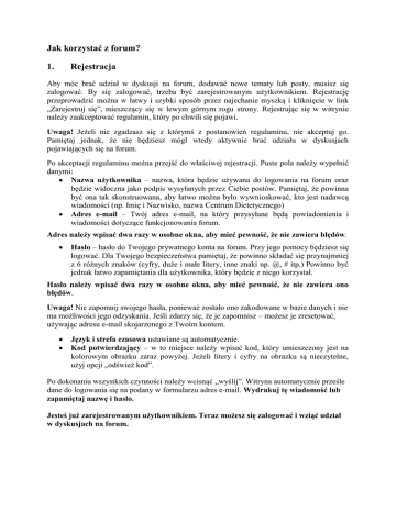 Jak korzystać z forum? 1. Rejestracja Aby móc brać udział w dyskusji na forum, dodawać nowe tematy lub posty, musisz się zalogować. By się zalogować, trzeba być zarejestrowanym użytkownikiem. Rejestrację przeprowadzić można w łatwy i szybki sposób przez najechanie myszką i kliknięcie w link „Zarejestruj się”, mieszczący się w lewym górnym rogu strony. Rejestrując się w witrynie należy zaakceptować regulamin, który po chwili się pojawi. Uwaga! Jeżeli nie zgadzasz się z którymś z postanowień regulaminu, nie akceptuj go. Pamiętaj jednak, że nie będziesz mógł wtedy aktywnie brać udziału w dyskusjach pojawiających się na forum. Po akceptacji regulaminu można przejść do właściwej rejestracji. Puste pola należy wypełnić danymi: Nazwa użytkownika – nazwa, która będzie używana do logowania na forum oraz będzie widoczna jako podpis wysyłanych przez Ciebie postów. Pamiętaj, że powinna być ona tak skonstruowana, aby łatwo można było wywnioskować, kto jest nadawcą wiadomości (np. Imię i Nazwisko, nazwa Centrum Dietetycznego) Adres e-mail – Twój adres e-mail, na który przysyłane będą powiadomienia i wiadomości dotyczące funkcjonowania forum. Adres należy wpisać dwa razy w osobne okna, aby mieć pewność, że nie zawiera błędów. Hasło – hasło do Twojego prywatnego konta na forum. Przy jego pomocy będziesz się logować. Dla Twojego bezpieczeństwa pamiętaj, że powinno składać się przynajmniej z 6 różnych znaków (cyfry, duże i małe litery, inne znaki np. @, # itp.) Powinno być jednak łatwo zapamiętania dla użytkownika, który będzie z niego korzystał. Hasło należy wpisać dwa razy w osobne okna, aby mieć pewność, że nie zawiera ono błędów. Uwaga! Nie zapomnij swojego hasła, ponieważ zostało ono zakodowane w bazie danych i nie ma możliwości jego odzyskania. Jeśli zdarzy się, że je zapomnisz – możesz je zresetować, używając adresu e-mail skojarzonego z Twoim kontem. Język i strefa czasowa ustawiane są automatycznie. Kod potwierdzający – w to miejsce należy wpisać kod, który umieszczony jest na kolorowym obrazku zaraz powyżej. Jeżeli litery i cyfry na obrazku są nieczytelne, użyj opcji „odśwież kod”. Po dokonaniu wszystkich czynności należy wcisnąć „wyślij”. Witryna automatycznie prześle dane do logowania się na podany w formularzu adres e-mail. Wydrukuj tę wiadomość lub zapamiętaj nazwę i hasło. Jesteś już zarejestrowanym użytkownikiem. Teraz możesz się zalogować i wziąć udział w dyskusjach na forum. 2. Logowanie Aby się zalogować najedź myszką na link „Zaloguj się” w lewym górnym rogu strony i kliknij. Pojawi się formularz z dwoma polami do wypełnienia: Nazwa użytkownika – należy wpisać utworzoną podczas rejestracji nazwę. Hasło – należy wpisać utworzone podczas rejestracji hasło. Uwaga! Przed zalogowaniem zapoznaj się z treścią zakładki „Zasady ochrony danych osobowych” (odnośnik znajduje się w tej samej tabeli, co formularz logowania, jednak po lewej stronie pod tekstem dot. logowania) Możesz również w każdej chwili zapoznać się z regulaminem, który znajduje się zaraz obok. Następnie wróć do strony logowania. Uwaga! Jeżeli przez chwilę po zalogowaniu nie będziesz aktywny, system automatycznie Cię wyloguje. Aby uniknąć ciągłego logowania się na forum, przed zalogowaniem wciśnij przycisk „Loguj mnie automatycznie”, znajdujący się pod polami nazwy i hasła. Następnie należy wcisnąć „zaloguj się”. Po wykonaniu wszystkich tych czynności, jesteś już zalogowany do swojego panelu na forum. Możesz teraz personalizować ustawienia forum i brać udział w dyskusjach (tworzyć tematy i pisać wiadomości – tzw. posty). Uwaga! Każdorazowo, gdy chcesz zakończyć korzystanie z forum, pamiętaj aby się wylogować! 3. Zmiana ustawień konta Wszystkie ustawienia zmienia się w zakładce „Mój profil”, dostępnej po zalogowaniu w prawym górnym rogu strony. 4. Pytania i problemy Aby dowiedzieć się jak napisać post, wiadomość prywatną lub stworzyć nowy temat przejdź do zakładki „FAQ” w prawym górnym rogu strony (dostępna po zalogowaniu). Tam znajdują się również rozwiązania problemów, jakie możesz napotkać w trakcie korzystania z forum.