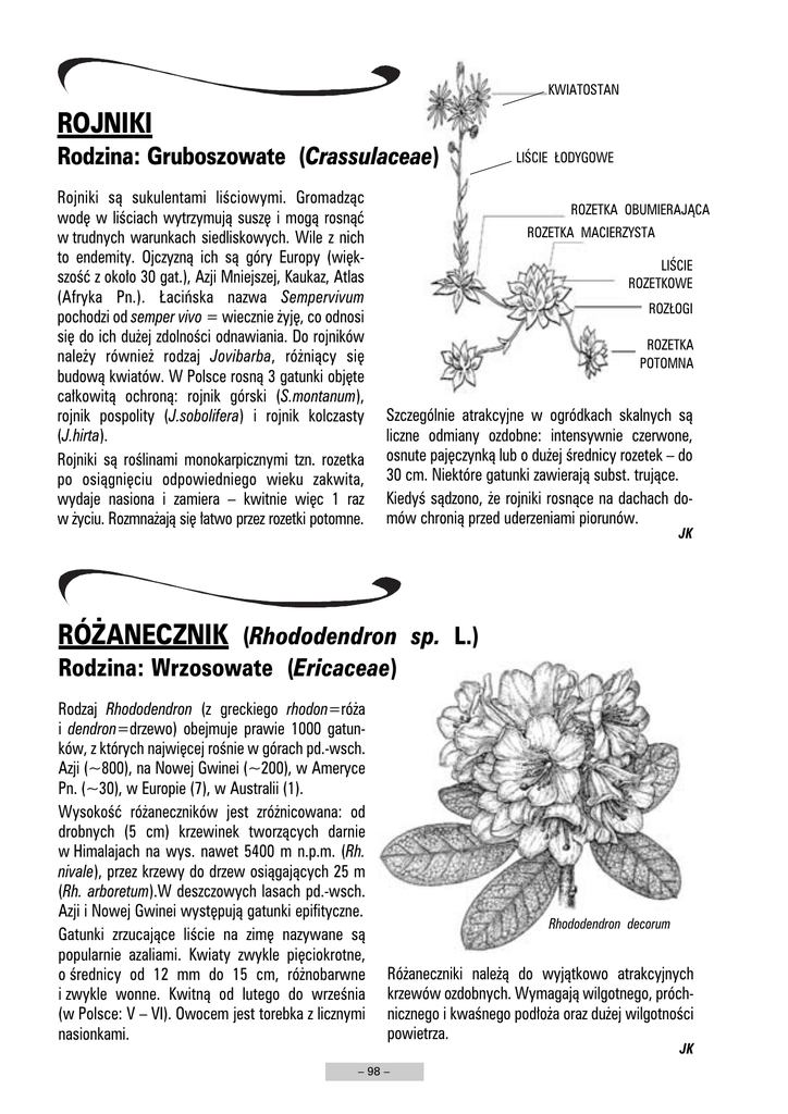 KWIATOSTAN ROJNIKI Rodzina: Gruboszowate (Crassulaceae) Rojniki są sukulentami liściowymi. Gromadząc wodę w liściach wytrzymują suszę i mogą rosnąć w trudnych warunkach siedliskowych. Wile z nich to endemity. Ojczyzną ich są góry Europy (większość z około 30 gat.), Azji Mniejszej, Kaukaz, Atlas (Afryka Pn.). Łacińska nazwa Sempervivum pochodzi od semper vivo = wiecznie żyję, co odnosi się do ich dużej zdolności odnawiania. Do rojników należy również rodzaj Jovibarba, różniący się budową kwiatów. W Polsce rosną 3 gatunki objęte całkowitą ochroną: rojnik górski (S.montanum), rojnik pospolity (J.sobolifera) i rojnik kolczasty (J.hirta). Rojniki są roślinami monokarpicznymi tzn. rozetka po osiągnięciu odpowiedniego wieku zakwita, wydaje nasiona i zamiera – kwitnie więc 1 raz w życiu. Rozmnażają się łatwo przez rozetki potomne. LIŚCIE ŁODYGOWE ROZETKA OBUMIERAJĄCA ROZETKA MACIERZYSTA LIŚCIE ROZETKOWE ROZŁOGI ROZETKA POTOMNA Szczególnie atrakcyjne w ogródkach skalnych są liczne odmiany ozdobne: intensywnie czerwone, osnute pajęczynką lub o dużej średnicy rozetek – do 30 cm. Niektóre gatunki zawierają subst. trujące. Kiedyś sądzono, że rojniki rosnące na dachach domów chronią przed uderzeniami piorunów. JK RÓŻANECZNIK (Rhododendron sp. L.) Rodzina: Wrzosowate (Ericaceae) Rodzaj Rhododendron (z greckiego rhodon=róża i dendron=drzewo) obejmuje prawie 1000 gatunków, z których najwięcej rośnie w górach pd.-wsch. Azji (~800), na Nowej Gwinei (~200), w Ameryce Pn. (~30), w Europie (7), w Australii (1). Wysokość różaneczników jest zróżnicowana: od drobnych (5 cm) krzewinek tworzących darnie w Himalajach na wys. nawet 5400 m n.p.m. (Rh. nivale), przez krzewy do drzew osiągających 25 m (Rh. arboretum).W deszczowych lasach pd.-wsch. Azji i Nowej Gwinei występują gatunki epifityczne. Gatunki zrzucające liście na zimę nazywane są popularnie azaliami. Kwiaty zwykle pięciokrotne, o średnicy od 12 mm do 15 cm, różnobarwne i zwykle wonne. Kwitną od lutego do września (w Polsce: V – VI). Owocem jest torebka z licznymi nasionkami. Rhododendron decorum Różaneczniki należą do wyjątkowo atrakcyjnych krzewów ozdobnych. Wymagają wilgotnego, próchnicznego i kwaśnego podłoża oraz dużej wilgotności powietrza. – 98 – JK