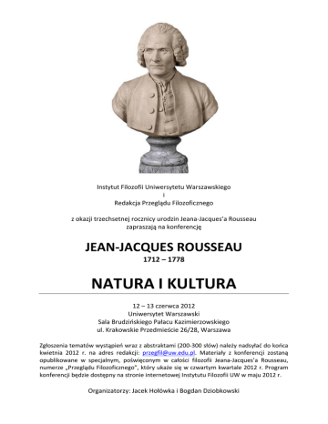 Instytut Filozofii Uniwersytetu Warszawskiego i Redakcja Przeglądu Filozoficznego z okazji trzechsetnej rocznicy urodzin Jeana-Jacques’a Rousseau zapraszają na konferencję JEAN-JACQUES ROUSSEAU 1712 – 1778 NATURA I KULTURA 12 – 13 czerwca 2012 Uniwersytet Warszawski Sala Brudzioskiego Pałacu Kazimierzowskiego ul. Krakowskie Przedmieście 26/28, Warszawa Zgłoszenia tematów wystąpieo wraz z abstraktami (200-300 słów) należy nadsyład do kooca kwietnia 2012 r. na adres redakcji: [email protected]. Materiały z konferencji zostaną opublikowane w specjalnym, poświęconym w całości filozofii Jeana-Jacques’a Rousseau, numerze „Przeglądu Filozoficznego”, który ukaże się w czwartym kwartale 2012 r. Program konferencji będzie dostępny na stronie internetowej Instytutu Filozofii UW w maju 2012 r. Organizatorzy: Jacek Hołówka i Bogdan Dziobkowski