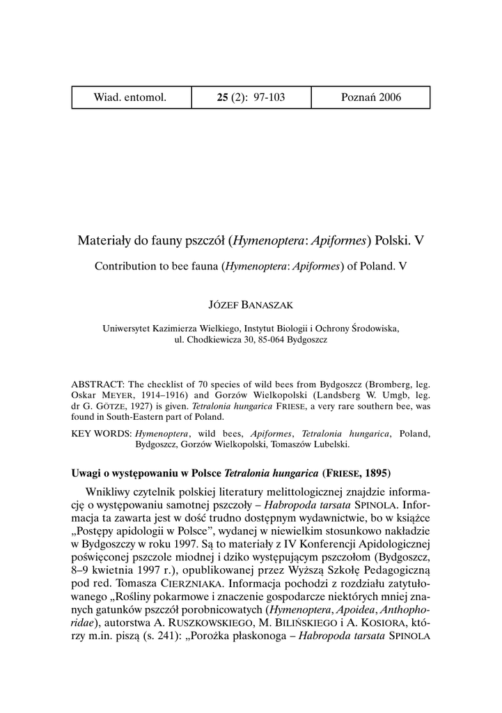 Wiad. entomol. 25 (2): 97-103 Poznań 2006 Materiały do fauny pszczół (Hymenoptera: Apiformes) Polski. V Contribution to bee fauna (Hymenoptera: Apiformes) of Poland. V JÓZEF BANASZAK Uniwersytet Kazimierza Wielkiego, Instytut Biologii i Ochrony Środowiska, ul. Chodkiewicza 30, 85-064 Bydgoszcz ABSTRACT: The checklist of 70 species of wild bees from Bydgoszcz (Bromberg, leg. Oskar MEYER , 1914–1916) and Gorzów Wielkopolski (Landsberg W. Umgb, leg. dr G. GÖTZE, 1927) is given. Tetralonia hungarica FRIESE, a very rare southern bee, was found in South-Eastern part of Poland. KEY WORDS: Hymenoptera, wild bees, Apiformes, Tetralonia hungarica, Poland, Bydgoszcz, Gorzów Wielkopolski, Tomaszów Lubelski. Uwagi o występowaniu w Polsce Tetralonia hungarica (FRIESE, 1895) Wnikliwy czytelnik polskiej literatury melittologicznej znajdzie informację o występowaniu samotnej pszczoły – Habropoda tarsata SPINOLA. Informacja ta zawarta jest w dość trudno dostępnym wydawnictwie, bo w książce „Postępy apidologii w Polsce”, wydanej w niewielkim stosunkowo nakładzie w Bydgoszczy w roku 1997. Są to materiały z IV Konferencji Apidologicznej poświęconej pszczole miodnej i dziko występującym pszczołom (Bydgoszcz, 8–9 kwietnia 1997 r.), opublikowanej przez Wyższą Szkołę Pedagogiczną pod red. Tomasza CIERZNIAKA. Informacja pochodzi z rozdziału zatytułowanego „Rośliny pokarmowe i znaczenie gospodarcze niektórych mniej znanych gatunków pszczół porobnicowatych (Hymenoptera, Apoidea, Anthophoridae), autorstwa A. RUSZKOWSKIEGO, M. BILIŃSKIEGO i A. KOSIORA, którzy m.in. piszą (s. 241): „Porożka płaskonoga – Habropoda tarsata SPINOLA 98 J. BANASZAK złowiona została w Polsce jedynie w Zamojskiem (Dobużek, pow. Tomaszów Lub. – 2 samice 26. VI. 1986 r. leg. A. KOSIOR)”. Tymczasem w najnowszym spisie pszczół z Polski pszczoła ta nie jest wymieniana (BANASZAK 2004). Odnalezienie Habropoda tarsata (SPINOLA, 1854) w Polsce mogłoby być zoogeograficzną sensacją, bowiem gatunek ten występuje tylko w południowej Europie, nie docierając w kierunku północnym nawet do Czech czy Słowacji. Dzięki uprzejmości jednego ze współautorów wymienionego doniesienia miałem możliwość sprawdzenia oznaczeń obu samic opisanej pszczoły, która w gruncie rzeczy okazała się należeć do innego rodzaju i gatunku, a mianowicie do Tetralonia hungarica (FRIESE, 1895). Okazy T. hungarica zawierają etykiety z następującymi informacjami: „20. VI. 1986 r., Dobużek, Knautia arvensis leg. A. KOSIOR” oraz „Dobużek, 20 VI 1986, Astragalus onobrychis”. Tetralonia hungarica to bardzo rzadki w Polsce gatunek o zasięgu subpontyjskim, wymieniony dotychczas tylko z dwóch stanowisk, w dodatku dość dawno: a mianowicie z obszaru dolnej Wisły (Kwidzyń) przez A LFKEN a (1909) oraz z Sandomierza przez NOSKIEWICZA (1959). Obecnie stanowisko z Dobużka pod Tomaszowem Lubelskim jest współczesnym potwierdzeniem występowania tego południowego gatunku w Polsce. Najbliższe miejsca występowania T. hungarica wymieniane są z zachodniej części Ukrainy (Podole) przez KUNTZEGO i NOSKIEWICZA (1938). W swojej kolekcji posiadam również trzy okazy z Podola zebrane przez J. NOSKIEWICZA w miejscowości Krzywcze (19 VII 1933 – 1&), Trembowli (8 VIII 1933 – 1&) oraz z Zaleszczyk (12 VII 1933 – 1%). Mało znana kolekcja pszczół z Bydgoszczy i Gorzowa Wielkopolskiego W Instytucie Ochrony Roślin w Poznaniu znajduje się stara kolekcja entomologiczna, tzw. „kolekcja puławska”, pochodząca pierwotnie z Instytutu Rolnictwa w Bydgoszczy, wówczas Kaiser Wilhelm Institut für Landwirtschaft (gabloty oryginalne z etykietami „Pflanzenpathologisches Institut Bromberg”), a która poprzez Puławy trafiła ostatecznie do Poznania. W 7 szafach rozmieszczono owady należące w większości do Coleoptera, Diptera i Hymenoptera. Pośród błonkówek znajduje się około 500 okazów przedstawicieli pszczół Apiformes, należących do 112 gatunków, zebranych w latach 1914–1925. Niestety tylko mniejsza część zawiera etykiety z nazwą miejscowości. Okazy z terenu obecnej Polski łowione były w Bydgoszczy („Bromberg”) i w okolicach Gorzowa Wielkopolskiego (zachodnia część) („Landsberg W. Umgb.”). Część etykiet zawiera także informacje o zbierających. Materiał z Bydgoszczy zebrany został przez MEYERa, a z okolic Gorzo- 99 MATERIAŁY DO FAUNY PSZCZÓŁ POLSKI. V wa przez dr. G. GÖTZE. Należy zaznaczyć, że z Bydgoszczą związani byli Oskar MEYER (1858–1942) i jego syn Reinhold (1892-1944), którym zawdzięczamy w dużej mierze znajomość fauny błonkówek tego miasta i regionu. Niestety z etykiet nie wynika, który z MEYERów zbierał opisywane tutaj pszczoły. Najprawdopodobniej był nim jednak Oskar Meyer, który z Bydgoszczą związany był dłużej, miał tutaj Zakład Optyczny, a zbieranie owadów było jego dodatkowym zajęciem. Między innymi część zebranych przez niego pszczół włączona została do znanej pracy Walentego Torki z roku 1913, pt. „Die Bienen der Proviz Posen” (TORKA 1913). Poniżej zestawiono ogółem 70 gatunków dziko żyjących pszczół zebranych przez Oskara [?] Meyera z Bydgoszczy w latach 1914–1916 oraz przez dr. G. Götze w okolicach Gorzowa Wielkopolskiego w roku 1927 (Tab.). Tab. Gatunki dziko żyjących pszczół zebrane w Bydgoszczy (1914–1916) i w Gorzowie Wielkopolskim (1927), znajdujące się w Instytucie Ochrony Roślin w Poznaniu The wild bee species collected in Bydgoszcz (1914-1916), and in Gorzów Wielkopolski (1927), housed in the collection of the Institute of Plant Protection in Poznań Treść etykiet (Contents of the labels): „Bromberg, Meyer” [Bydgoszcz, leg. M EYER, 1914–1916]; „Landsberg W. Umg., Dr G. Götze” [Gorzów Wlkp., leg. G. GÖTZE, 1927] Daty w tabeli podano zgodnie z ich oryginalnym zapisem The dates in the table are the same as on the labels * daty brak * no data Ga