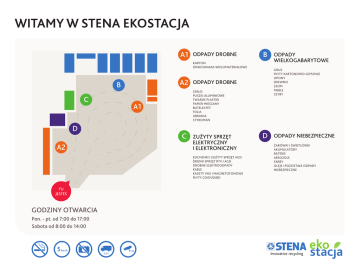 A1 ODPADY DROBNE B KARTON OPAKOWANIA WIELOMATERIAŁOWE A2 B C D A2 ODPADY DROBNE C ZUŻYTY SPRZĘT ELEKTRYCZNY I ELEKTRONICZNY KUCHENKI I ZUŻYTY SPRZĘT AGD ŚREDNI SPRZĘT RTV I AGD DROBNE ELEKTROODPADY KABLE KASETY VHS I MAGNETOFONOWE PŁYTY CD/DVD/BD TU JESTEŚ Pon. - pt. od 7:00 do 17:00 Sobota od 8:00 do 14:00 GRUZ PŁYTY KARTONOWO-GIPSOWE OPONY DREWNO ZŁOM MEBLE SZYBY SZKŁO PUSZKI ALUMINIOWE TWARDE PLASTIKI PAPIER MIESZANY BUTELKI PET FOLIA UBRANIA STYROPIAN A1 ODPADY WIELKOGABARYTOWE D ODPADY NIEBEZPIECZNE ŻARÓWKI I ŚWIETLÓWKI AKUMULATORY BATERIE AEROZOLE FARBY OLEJE I POZOSTAŁE ODPADY NIEBEZPIECZNE