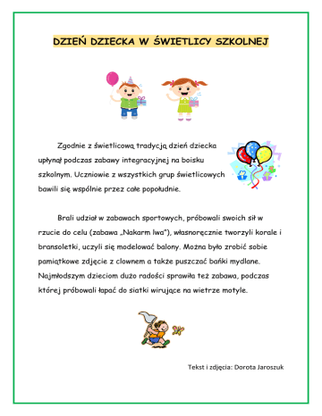 DZIEŃ DZIECKA W ŚWIETLICY SZKOLNEJ Zgodnie z świetlicową tradycją dzień dziecka upłynął podczas zabawy integracyjnej na boisku szkolnym. Uczniowie z wszystkich grup świetlicowych bawili się wspólnie przez całe popołudnie. Brali udział w zabawach sportowych, próbowali swoich sił w rzucie do celu (zabawa „Nakarm lwa”), własnoręcznie tworzyli korale i bransoletki, uczyli się modelować balony. MoŜna było zrobić sobie pamiątkowe zdjęcie z clownem a takŜe puszczać bańki mydlane. Najmłodszym dzieciom duŜo radości sprawiła teŜ zabawa, podczas której próbowali łapać do siatki wirujące na wietrze motyle. Tekst i zdjęcia: Dorota Jaroszuk
