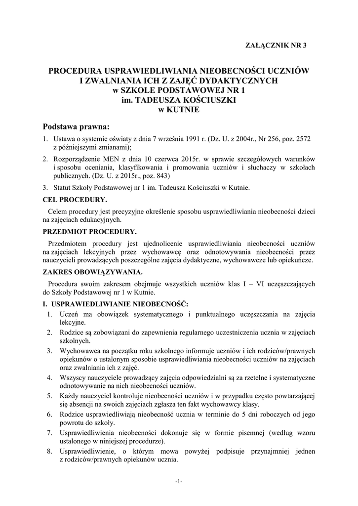 ZAŁĄCZNIK NR 3 PROCEDURA USPRAWIEDLIWIANIA NIEOBECNOŚCI UCZNIÓW I ZWALNIANIA ICH Z ZAJĘĆ DYDAKTYCZNYCH w SZKOLE PODSTAWOWEJ NR 1 im. TADEUSZA KOŚCIUSZKI w KUTNIE Podstawa prawna: 1. Ustawa o systemie oświaty z dnia 7 września 1991 r. (Dz. U. z 2004r., Nr 256, poz. 2572 z późniejszymi zmianami); 2. Rozporządzenie MEN z dnia 10 czerwca 2015r. w sprawie szczegółowych warunków i sposobu oceniania, klasyfikowania i promowania uczniów i słuchaczy w szkołach publicznych. (Dz. U. z 2015r., poz. 843) 3. Statut Szkoły Podstawowej nr 1 im. Tadeusza Kościuszki w Kutnie. CEL PROCEDURY. Celem procedury jest precyzyjne określenie sposobu usprawiedliwiania nieobecności dzieci na zajęciach edukacyjnych. PRZEDMIOT PROCEDURY. Przedmiotem procedury jest ujednolicenie usprawiedliwiania nieobecności uczniów na zajęciach lekcyjnych przez wychowawcę oraz odnotowywania nieobecności przez nauczycieli prowadzących poszczególne zajęcia dydaktyczne, wychowawcze lub opiekuńcze. ZAKRES OBOWIĄZYWANIA. Procedura swoim zakresem obejmuje wszystkich uczniów klas I – VI uczęszczających do Szkoły Podstawowej nr 1 w Kutnie. I. USPRAWIEDLIWIANIE NIEOBECNOŚĆ: 1. Uczeń ma obowiązek systematycznego i punktualnego uczęszczania na zajęcia lekcyjne. 2. Rodzice są zobowiązani do zapewnienia regularnego uczestniczenia ucznia w zajęciach szkolnych. 3. Wychowawca na początku roku szkolnego informuje uczniów i ich rodziców/prawnych opiekunów o ustalonym sposobie usprawiedliwiania nieobecności uczniów na zajęciach oraz zwalniania ich z zajęć. 4. Wszyscy nauczyciele prowadzący zajęcia odpowiedzialni są za rzetelne i systematyczne odnotowywanie na nich nieobecności uczniów. 5. Każdy nauczyciel kontroluje nieobecności uczniów i w przypadku często powtarzającej się absencji na swoich zajęciach zgłasza ten fakt wychowawcy klasy. 6. Rodzice usprawiedliwiają nieobecność ucznia w terminie do 5 dni roboczych od jego powrotu do szkoły. 7. Usprawiedliwienia nieobecności dokonuje się w formie pisemnej (według wzoru ustalonego w niniejszej procedurze). 8. Usprawiedliwienie, o którym mowa powyżej podpisuje przynajmniej jednen z rodziców/prawnych opiekunów ucznia. -1- Dokumentem usprawiedliwiającym nieobecność ucznia może być także zaświadczenie lekarskie (oryginał lub kopia). 10. W przypadku planowanej dłuższej niż jeden tydzień nieobecności ucznia (np.: pobyt w sanatorium, szpitalu, przewlekła choroba, wyjazd), rodzice/prawni opiekunowie zobowiązani są do poinformowania wychowawcy klasy o przewidywanej absencji przynajmniej z jednodniowym wyprzedzeniem. 11. Jeżeli nieobecność ucznia, spowodowana chorobą, jest dłuższa niż trzy tygodnie, a jego stan zdrowia w dalszym ciągu nie pozwala na powrót do szkoły, rodzice/prawni opiekunowie powinni złożyć wniosek do poradni psychologiczno – pedagogicznej o wydanie orzeczenia o potrzebie nauczania indywidualnego. Na tej podstawie szkoła zorganizuje dla ucznia zajęcia umożliwiające realizację podstawy programowej. 12. Wychowawca klasy zbiera i przechowuje przez cały rok szkolny dokumenty (prośby o usprawiedliwienia od rodziców/prawnych opiekunów, zwolnienia lekarskie, itp.), które były podstawą usprawiedliwienia nieobecności lub zwolnienia z zajęć uczniów. 9. II. ZWALNIANIE Z ZAJĘĆ: 1. Z poszczególnych zajęć edukacyjnych w danym dniu ucznia może zwolnić: a) wychowawca klasy lub nauczyciel prowadzący z uczniem zajęcia na podstawie pisemnej prośby o zwolnienie od rodzica (prawnego opiekuna) przekazane mu przed opuszczeniem szkoły przez ucznia; b) dyrektor, wicedyrektor lub kierownik świetlicy, w przypadku uczniów zgłaszających złe samopoczucie, po uzyskaniu opinii pielęgniarki na temat jego stanu zdrowia; c) nauczyciel – opiekun, w przypadku uczniów, którzy reprezentują szkołę w trakcie zawodów sportowych, konkursów, uroczystości, itp.; d) nauczyciel prowadzący zajęcia specjalistyczne z uczniem upośledzonym w stopniu umiarkowanym; 2. Zwolnienie, o którym mowa w punkcie 1 lit. a, traktowane jest, jako nieobecność usprawiedliwiona. W szczególnych przypadkach wychowawca klasy lub dyrektor, wicedyrektor szkoły może zwolnić ucznia również na podstawie kontaktu telefonicznego z rodzicem/prawnym opiekunem. Kontakt taki należy odnotować w dzienniku elektronicznym (kontakty z rodzicami – podając datę, godzinę rozmowy, nazwisko osoby, która odebrała ucznia z zajęć i wzięła na siebie odpowiedzialność za jego bezpieczeństwo po zwolnieniu z zajęć). 3. Zwolnienie, o którym mowa w pkt 1 lit. b, traktowane jest, jako nieobecność usprawiedliwiona i następuje po wykonaniu następujących czynności: a) w przypadku kontaktu z rodzicem/prawnym opiekunem z telefonu komórkowego ucznia: uczeń dzwoni do rodzica/prawnego opiekuna, nauczyciel przekazuje rodzicowi/prawnemu opiekunowi informacje dotyczącą zgłaszanych przez ucznia dolegliwościach i prosi o przybycie do szkoły w celu odebrania dziecka, ustala z rodzicem/prawnym opiekunem miejsce, w którym uczeń będzie oczekiwał na odebranie ze szkoły (gabinet pielęgniarki, świetlica, sala, sekretariat lub dyżurka), po odebraniu ucznia odnotowuje zwolnienie lub nieobecność usprawiedliwioną na swoich zajęciach oraz dokonuje wpisu w dzienniki elektronicznym analogicznie jak w punkcie 2; b) w przypadku braku możliwości kontaktu z rodzicem/prawnym opiekunem za pomocą telefonu komórkowego ucznia: -2- nauczyciel wysyła dyżurnego lub przewodniczącego klasy po pielęgniarkę szkolną lub do sekretariatu szkoły; przekazuje ucznia zgłaszającego złe samopoczucie osobie, która podejmuje czynności opisane w pkt 3 lit. a tiret 1 – 3; pielęgniarka lub inna wyznaczona osoba informuje nauczyciela o odebraniu ucznia ze szkoły, nauczyciel prowadzący zajęcia odnotowuje zwolnienie lub usprawiedliwia nieobecność na swoich zajęciach tego dnia oraz dokonuje wpisu w dzienniki elektronicznym anal
