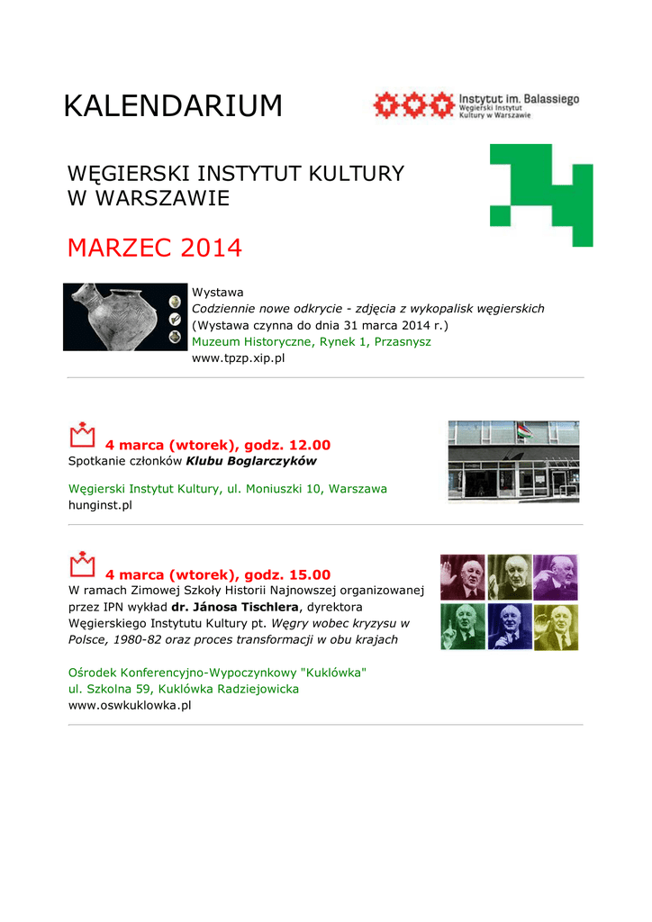 KALENDARIUM WĘGIERSKI INSTYTUT KULTURY W WARSZAWIE MARZEC 2014 Wystawa Codziennie nowe odkrycie - zdjęcia z wykopalisk węgierskich (Wystawa czynna do dnia 31 marca 2014 r.) Muzeum Historyczne, Rynek 1, Przasnysz www.tpzp.xip.pl 4 marca (wtorek), godz. 12.00 Spotkanie członków Klubu Boglarczyków Węgierski Instytut Kultury, ul. Moniuszki 10, Warszawa hunginst.pl 4 marca (wtorek), godz. 15.00 W ramach Zimowej Szkoły Historii Najnowszej organizowanej przez IPN wykład dr. Jánosa Tischlera, dyrektora Węgierskiego Instytutu Kultury pt. Węgry wobec kryzysu w Polsce, 1980-82 oraz proces transformacji w obu krajach Ośrodek Konferencyjno-Wypoczynkowy "Kuklówka" ul. Szkolna 59, Kuklówka Radziejowicka www.oswkuklowka.pl 5 marca (środa), godz. 10.00 Warsztaty dla najmłodszych - nauka śpiewu metodą Zoltána Kodálya Wykłady dla dzieci przygotowane w oparciu o rzadko wykorzystywaną w Polsce metodę edukacji muzycznej Zoltána Kodálya, która pozwala na poznanie, nauczenie się alfabetu muzycznego nie tylko utalentowanym i doświadczonym śpiewakom, ale także otwartym na innowacyjność entuzjastom. W końcu "śpiewać każdy może ..." Prowadzenie: dr Joanna Maluga, absolwentka dyrygentury chóralnej UMFC w Warszawie Węgierski Instytut Kultury, ul. Moniuszki 10, Warszawa hunginst.pl 12 marca (środa), godz. 18.00 Otwarcie wystawy fotograficznej On the ground - Budapeszt 1989-1993 w obiektywie artysty fotografika Rodolfa Hervégo Zdjęcia prezentowane na wystawie są niezwykłym świadectwem przemian zachodzących w Budapeszcie w XX wieku. Artysta rejestrował codzienność miasta w okresie transformacji, utrwalając na fotografiach wszystkie wydarzenia artystyczne, życie noce, architekturę, budapeszteńskie łaźnie, ulice, targi i dworce Po otwarciu wystawy w panelu dyskusyjnym udział wezmą: prof. Csaba Gy. Kiss, historyk, Jarosław Giziński, publicysta, Adam Mazur, historyk sztuki. Moderator: Rafał Rogulski, dyrektor Sekretariatu Europejskiej Sieci Pamięć i Solidarność Wystawa przygotowana wspólnie z Europejską Siecią Pamięć i Solidarność (Wystawa czynna do dnia 14 kwietnia 2014 r. , w godz. 9.00-17.00) Węgierski Instytut Kultury, ul. Moniuszki 10, Warszawa hunginst.pl 13 marca (czwartek) Z okazji 166. rocznicy Rewolucji i Walki o Wolność na Węgrzech - uroczyste obchody Święta Narodowego Węgier W programie: 15.15 - Złożenie kwiatów pod pomnikiem Sándora Petőfiego (przy amfiteatrze w Parku Górczewska, ul. Raginisa) 16.00 - Uroczyste złożenie kwiatów pod pomnikiem gen. Józefa Zachariasza Bema (Urząd Dzielnicy Bemowo m.st. Warszawy, ul. Powstańców Śląskich 70) 17.10 - Uroczystości w Bemowskim Centrum Kultury art.bem (ul. Górczewska 201) Urząd Dzielnicy Bemowo m.st. Warszawy ul. Powstańców Śląskich 70, Bemowo www.bemowo.waw.pl 14 marca (piątek), godz.14.00 Máriapócs - węgierska Częstochowa - otwarcie wystawy prezentującej najsłynniejsze sanktuarium maryjne na Węgrzech. Zbudowane przez Zakon oo. Bazylianów sanktuarium z piękną barokową świątynią stało się miejscem pielgrzymek nie tylko z Węgier, ale z Ukrainy, Słowacji i Rumunii. Wystawa przybliża tak mało znane wątki wspólnego dla Polski i Węgier dziedzictwa chrześcijańskiego. (Wystawa czynna do dnia 13 kwietnia 2014 roku) Otwarcie wystawy jest częścią uroczystych obchodów wznowienia działalności Konsulatu Generalnego Węgier w Krakowie Muzeum Archeologiczne, ul. Senacka 3, Kraków www.ma.krakow.pl 19 marca (środa), godz. 18.00 Z okazji Święta Narodowego Węgier uroczysty koncert w wykonaniu Bence Asztalosa (skrzypce) i Iriny Iwanickiej (fortepian) W programie wieczoru: popularne utwory Béli Bartóka i kompozytorów zagranicznych Niccolo Paganiniego, Johannesa Brahmsa i Igora Strawińskiego Węgierski Instytut Kultury, ul. Moniuszki 10, Warszawa hunginst.pl 21 marca (piątek), godz. 19.00 Koncert Orkiestry Symfonicznej Filharmonii Wrocławskiej pod batutą Zsolta Hamara z udziałem Kristófa Barátiego (skrzypce) W programie: utwory Ferenca Liszta, Niccolo Paganiniego, Béli Bartóka i Ernő Dohnányiego. Koncert zorganizowany we współpracy z Węgierskim Instytutem Kultury w Warszawie Filharmonia Wrocławska im. Witolda Lutosławskiego ul. Marszałka Józefa Piłsudskiego 10, Wrocław www.filharmonia.wroclawska.pl 23 marca (niedziela), godz. 19.00 W ramach cyklu imprez z okazji Dnia Przyjaźni Polsko-Węgierskiej koncert kameralny w wykonaniu Kristófa Barátiego (skrzypce) i Marii SzwajgerKułakowskiej (fortepian) W programie: Béla Bartók, Eugène Ysaÿe, Niccolo Paganini, Camille Saint-Saëns i Pablo de Sarasate Koncert zorganizowany we współpracy z Węgierskim Instytutem Kultury w Warszawie Sala Koncertowa Akademii Muzycznej im. Karola Szymanowskiego ul. Zacisze 3, Katowice www.am.katowice.pl 25 marca (wtorek) Uroczyste obchody 15 Marca - Święta Narodowego Węgier w Bydgoszczy pod honorowym patronatem Rektora Uniwersytetu Kazimierza Wielkiego oraz Konsula Honorowego Węgier w Bydgoszczy W programie: Część I. Wystąpienia zaproszonych gości: - prelekcja Ákosa Engelmayera, byłego ambasadora Węgier w Polsce w latach 1990-95 i dr. János Tischlera, dyrektora Węgierskiego Instytutu Kultury na temat wydarzeń 1956 roku na Węgrzech - prelekcja Gáspára Keresztesa, kierownika ds. programowych Węgierskiego Instytutu Kultury o kulturze węgierskiej - Skarby renesansowe Biblioteki Króla Marcina Korwina - prezentacja dr. Aldony Chlewickiej, dyrektor Biblioteki Głównej Uniwersytetu Kazimierza Wielkiego Część II. - koncert i recytacja poezji węgierskiej w wykonaniu studentów Uniwersytetu Kazimierza Wielkiego - wykład László Gombkötő nt. Tradycji kulinarnych Węgier - wystawy: Pamiątki z Węgier i Literatura węgierska w tłumaczeniach polskich Patronat Medialny:TVP Historia, Gazeta Pomorska Impreza organizowana przez Bibliotekę Uniwersytetu Kazimierza Wielkiego w Bydgoszczy, Bydgoskie Towarzystwo Przyjaciół Węgier, Honorowy K
