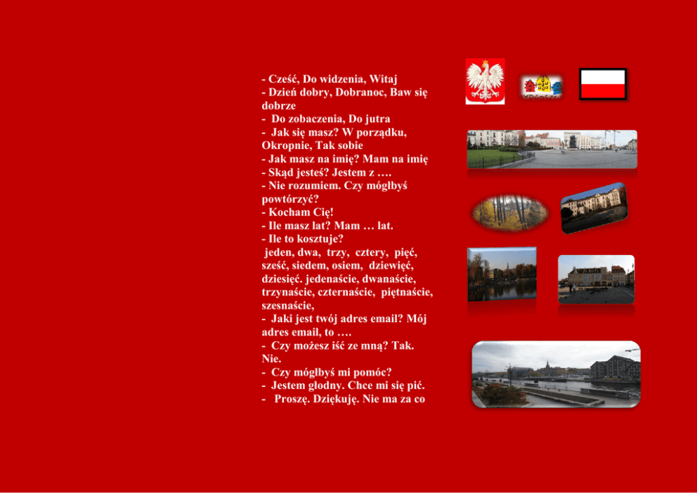 - Cześć, Do widzenia, Witaj - Dzień dobry, Dobranoc, Baw się dobrze - Do zobaczenia, Do jutra - Jak się masz? W porządku, Okropnie, Tak sobie - Jak masz na imię? Mam na imię - Skąd jesteś? Jestem z …. - Nie rozumiem. Czy mógłbyś powtórzyć? - Kocham Cię! - Ile masz lat? Mam … lat. - Ile to kosztuje? jeden, dwa, trzy, cztery, pięć, sześć, siedem, osiem, dziewięć, dziesięć. jedenaście, dwanaście, trzynaście, czternaście, piętnaście, szesnaście, - Jaki jest twój adres email? Mój adres email, to …. - Czy możesz iść ze mną? Tak. Nie. - Czy mógłbyś mi pomóc? - Jestem głodny. Chce mi się pić. - Proszę. Dziękuję. Nie ma za co