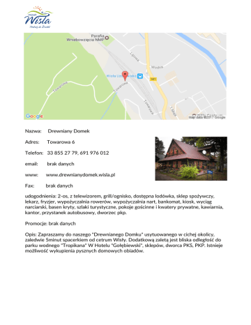 Nazwa: Drewniany Domek Adres: Towarowa 6 Telefon: 33 855 27 79, 691 976 012 email: brak danych www: www.drewnianydomek.wisla.pl Fax: brak danych udogodnienia: 2-os, z telewizorem, grill/ognisko, dostępna lodówka, sklep spożywczy, lekarz, fryzjer, wypożyczalnia rowerów, wypożyczalnia nart, bankomat, kiosk, wyciąg narciarski, basen kryty, szlaki turystyczne, pokoje gościnne i kwatery prywatne, kawiarnia, kantor, przystanek autobusowy, dworzec pkp. Promocje: brak danych Opis: Zapraszamy do naszego "Drewnianego Domku" usytuowanego w cichej okolicy, zaledwie 5minut spacerkiem od cetrum Wisły. Dodatkową zaletą jest bliska odległość do parku wodnego "Tropikana" W Hotelu "Gołębiewski", sklepów, dworca PKS, PKP. Istnieje możliwość wykupienia pysznych domowych obiadów.