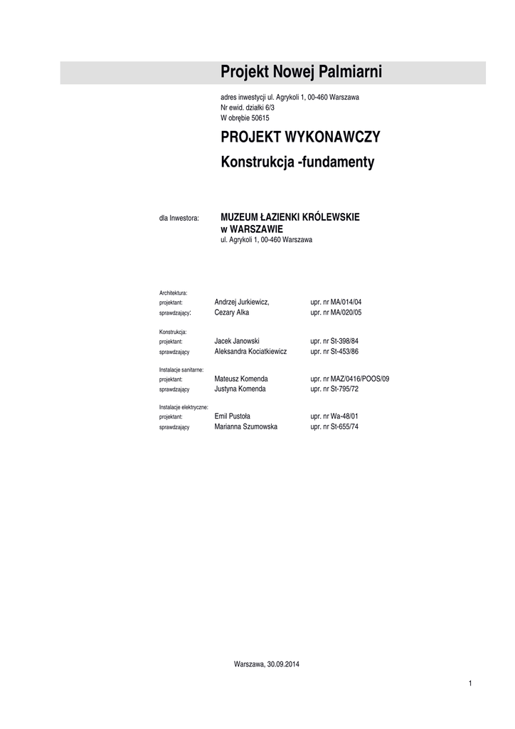 Projekt Nowej Palmiarni adres inwestycji ul. Agrykoli 1, 00-460 Warszawa Nr ewid. działki 6/3 W obrębie 50615 PROJEKT WYKONAWCZY Konstrukcja -fundamenty dla Inwestora: MUZEUM ŁAZIENKI KRÓLEWSKIE w WARSZAWIE ul. Agrykoli 1, 00-460 Warszawa Architektura: projektant: sprawdzający: Andrzej Jurkiewicz, Cezary Alka upr. nr MA/014/04 upr. nr MA/020/05 Jacek Janowski Aleksandra Kociatkiewicz upr. nr St-398/84 upr. nr St-453/86 Mateusz Komenda Justyna Komenda upr. nr MAZ/0416/POOS/09 upr. nr St-795/72 Emil Pustoła Marianna Szumowska upr. nr Wa-48/01 upr. nr St-655/74 Konstrukcja: projektant: sprawdzający Instalacje sanitarne: projektant: sprawdzający Instalacje elektryczne: projektant: sprawdzający Warszawa, 30.09.2014 1 Projekt wykonawczy Budynek Nowej Palmiarni 30 września 2014 r. Spis treści. 1. Opis techniczny (str. 1-3) 2. Specyfikacja techniczna – roboty żelbetowe (str. 1-13) 3. Rysunki Lp. Nr rysunku Rewizje Tytuł rysunku 0 1 1 KW1 Rzut fundamentów 25.08.2014 30.09.2014 2 KW2 Zbrojenie fundamentów 25.08.2014 30.09.2014 3 KW3 Zakotwienia 25.08.2014 30.09.2014 4 KW4 Elementy kotwiące K1 i K2 25.08.2014 30.09.2014 4. Wykazy 1 KW2 Zbrojenie fundamentów 25.08.2014 30.09.2014 2 KW4 Elementy kotwiące k1 i K2 25.08.2014 30.09.2014 2 3 Projekt wykonawczy Budynek Nowej Palmiarni 30 września 2014 r. 1 1.1 Opis techniczny Podstawa opracowania Podstawę opracowania projektu konstrukcji budynku Palmiarni stanowi: - zatwierdzony przez inwestora projekt koncepcyjny. - Opinia geotechniczna dla potrzeb projektowania posadowienia nowej palmiarni Muzeum Łazienki Królewskie w Warszawie opracowana przez ZBG ”Geostud” mgr Krzysztof Zieliński 1.2 1.2.1 Opis ogólny Podstawowe dane techniczne Wymiary budynku 1.2.2 - rozpiętość osiowa 2x6.00 m - rozstaw przęseł 3,20 m - długość osiowa 48.00 m - wysokość w okapie 6,08 m i 4,16 m - wysokość w kalenicy 8,33 m i 6,42 m Charakterystyka budynku Projektowany budynek palmiarni jest przeznaczony na magazyn roślin oraz prowadzenie działalności dydaktycznej. Ściany zewnętrzne budynku i dach zaprojektowane zostały z elementów szklanych. 1.3 Opis konstrukcji Budynek palmiarni zaprojektowano w konstrukcji stalowej z układem ram porzecznych co 3,2 m i szerokości naw 2 x 6,0m i pochyleniu połaci dachów 20 stopni. Tylko część socjalna wykonana jest w technologii tradycyjnej tj. ściany murowane z płytą żelbetową. W części dwunawowej pełne ramy poprzeczne zastosowano w co drugiej osi poprzecznej i miedzy nimi w osi środkowej oparto podłużny podciąg kratowy na którym oparte zostały ramy pośrednie. Takie rozwiązanie pozwoliło na wyeliminowanie części słupów w osi środkowej. W części jednonawowej pełne ramy usytuowano w każdej osi. Wszystkie słupy wykonane są z HEA 160 ,a rygle dachowe z IPE240. Sztywność podłużną układu ram zapewniają stężenia połaciowe w płaszczyźnie rygli dachowych i stężenia pionowe w ścianach zewnętrznych. Projekt wykonawczy Budynek Nowej Palmiarni 30 września 2014 r. 1.4 Opis terenu Kategoria geotechniczna inwestycji I (pierwsza) Teren na którym powstanie obiekt zlokalizowany jest na terenie parkowo-pałacowym Muzeum Łazienki Królewskie . Pod względem morfologicznym teren ten położony jest na terenie tarasu nadzalewowego Wisły ( Taras Praski). Powierzchnia terenu płaska , sztucznie splantowana i wyrównana , lecz pierwotnie morfologia terenu jest wyraźna i czytelna. Rzędne wysokościowe wynoszą 7,2÷7,5 m układu lokalnego „0 Wisły”. 1.5 Budowa geologiczna Na tym terenie znajdują się warstwy - warstwa współczesnych gruntów nasypowych związanych z plantowaniem terenu i budową alejek i kwietników (max. miąższość 0,6 m). Tworzą ją przeważnie masy ziemne piaszczysto-próchnicze, często z domieszką gruntu ceglanego. - warstwa pyłów, glin pylastych , piasków różnoziarnistych ( średnich i grube). Warstwa zalega do 3,5÷4,5 m. - wartwa pstrych iłów poznańskich, stanowiące tu głębsze podłoże i osiągają tu znaczną miąższość. 1.6 Warunki hydrologiczne Omawiany teren jest odwadniany przez kilka sztucznych stawów i cieków, odprowadzających wody opadowe do rzeki Wisły. Woda gruntowa w postaci wyraźnej warstwy nośnej o swobodnym zwierciadle i znacznym dopływie występuje w piaskach rzecznych na głębokości ca 2,5÷3 m. ppt., tj ok. 4,5 m rzędnej ”0 W” 1.7 Fundamenty W pobliżu znajdują się istniejące budynki zabudowy parkowej. Budynek jest nie podpiwniczony, fundamenty zaprojektowano w postaci stóp fundamentowych na parametry gruntu występujące w tym obszarze tj gliny pylaste w stanie twardoplastycznym i piaski średnie w stanie średniozagęszczonym. Fundamenty zaprojektowano tak aby jednostkowy nacisk na grunt nie przekroczył 220 MPa. 1.7.1 Materiały - beton B20 (C20/25) – fundament ; beton B37 (C30/37) strop w poziomie +3,26 m. - stal zbrojeniowa A-III (B500SP) dla podstawowej konstrukcji żelbetowej Projekt wykonawczy Budynek Nowej Palmiarni 30 września 2014 r. 1.8 Normy przyjęte przy projektowaniu konstrukcji 1. PN-82/B-02001 Obciążenia budowli. Obciążenia stałe. 2. PN-80/B-02010/Az1 Obciążenie śniegiem. 3. PN-B-02011:1977/Az1 Obciążenia wiatrem. 4. PN-82/B-02003 Obciążenia zmienne technologiczne. Podstawowe obciążenia technologiczne i montażowe 6. PN-81/B-0320 Posadowienie bezpośrednie budowli. Opracował: mgr inż. Jacek Janowski upr. bud. St398/84