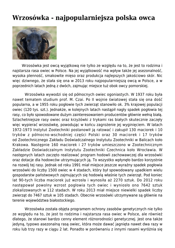 Wrzosówka - najpopularniejsza polska owca Wrzosówka jest owcą wyjątkową nie tylko ze względu na to, że jest to rodzima i najstarsza rasa owiec w Polsce. Na jej wyjątkowość ma wpływ także jej asezonalność, wysoka plenność, smakowite mięso oraz produkcja najlepszych jakościowo skór. Nic więc dziwnego, że stała się ona w 2013 roku najpopularniejszą owcą w Polsce, a w poprzednich latach jedną z dwóch, zajmując miejsce tuż obok owcy pomorskiej. Wrzosówka wywodzi się od północnych owiec ogoniastych. W 1937 roku była nawet tematem studium prof. M. Czai. Po II wojnie światowej stała się ona dość popularna, a w 1955 roku pogłowie tych zwierząt stanowiło ok. 3% krajowej populacji owiec (120 tys. szt.). Jednakże, w kolejnych latach nastąpił nagły spadek pogłowia tej rasy, co było spowodowane dużym zainteresowaniem producentów głównie wełną białą. Szlachetniejsze rasy owiec oraz krzyżówki z trykami ras białych skutecznie zaczęły więc wypierać wrzosówkę, powodując w końcu zagrożenie jej wyginięciem. W latach 1972-1973 Instytut Zootechniki postanowił ją ratować i zakupił 130 maciorek i 10 tryków z północno-wschodniej części Polski oraz 30 maciorek i 17 tryków od Zootechnicznego Zakładu Doświadczalnego Instytutu Zootechniki w Balicach koło Krakowa. Następnie 160 maciorek i 27 tryków umieszczono w Zootechnicznym Zakładzie Doświadczalnym Instytutu Zootechniki Czechnica koło Wrocławia. W następnych latach zaczęto realizować program hodowli zachowawczej dla wrzosówki oraz dotacje dla hodowców utrzymujących ją. To wszystko wpłynęło bardzo korzystnie na rozwój tej rasy. Jednak od roku 1991 miał miejsce jeszcze wyraźny spadek pogłowia wrzosówki do liczby 1500 owiec w 4 stadach, który był spowodowany upadkiem wielu gospodarstw państwowych zajmujących się hodowlą właśnie tych zwierząt. Pod koniec lat 90-tych liczba maciorek już wzrosła i wynosiła aż 2270 sztuk. Do 2012 roku następował powolny wzrost pogłowia tych owiec i wyniosło ono 7642 sztuk zlokalizowanych w 112 stadach. W roku 2013 miał miejsce niewielki spadek liczby zwierząt do 7467 sztuk w 105 stadach. Obecnie wrzosówki utrzymywane są głównie na terenie województwa białostockiego. Wrzosówka została objęta programem ochrony zasobów genetycznych nie tylko ze względu na to, że jest to rodzima i najstarsza rasa owiec w Polsce, ale również dlatego, że stanowi bardzo cenny element różnorodności genetycznej. Jest ona także jedyną, typowo asezonalną rasą owiec, która może dawać jagnięta nawet dwa razy w roku lub trzy razy w ciągu 2 lat. Ponadto w porównaniu z innymi rasami wyróżnia się ona stosunkowo wysoką plennością, która wynosi 150-185%. Mimo słabej użytkowości mięsnej mięso wrzosówek cechuje się niską zawartością tłuszczu i cholesterolu oraz wyjątkowym smakiem przypominającym dziczyznę. Jedną z najważniejszych zalet tej rasy jest jednak produkcja najlepszych jakościowo skór, które mimo małej powierzchni są bardzo lekkie, cienkie, mocne i mają najlepsze parametry fizyko-histologiczne. Nie należy jednak zapominać, że rasa ta występując w regionie o najwyższym bezrobociu i dość dużej ilości odłogów może być wykorzystywana m.in. do pielęgnacji krajobrazu oraz w gospodarstwach agroturystycznych. Te wszystkie cechy sprawiły, że wrzosówkę objęto programem i ochroną. Głównym celem programu ochrony zasobów genetycznych wrzosówki jest zachowanie tej rasy, powiększanie aktywnej populacji i utrzymanie istniejącej zmienności genetycznej. Bardzo istotne jest również zachowanie charakterystycznej dla nich asezonalności, zdrowotności i dużej odporności na trudne warunki środowiskowe. Konieczna jest także dalsza stabilizacja cech fenotypowych, takich jak choćby wyrównany typ umaszczenia, szlachetny kształt rogów u tryków czy krótki i nieowełniony ogon, a także selekcja w kierunku odtworzenia wysokiej plenności (nawet do 200%) oraz powiększenie i utrzymanie populacji towarowej do kilkuset sztuk matek. Wrzosówka jest owcą drobną i cechuje się suchą konstrukcją i harmonijną budową. Minimalna masa ciała tryków powinna wynosić 40 kg, a maciorek 32 kg. Charakterystyczną cechą tej rasy jest okrywa wełnista i umaszczenie siwe lub ciemnosiwe. Dopuszczalna jest jednak okrywa czarna czy względnie jasnosiwa, ale tylko wtedy, gdy wydane na świat potomstwo jest siwiejące. Jagnięta rodzą się wówczas czarne i dopiero w wieku 2-3 miesięcy rozpoczyna się u nich proces siwienia okrywy, który trwa do 8-9 miesiąca życia. Głowa wrzosówki jest czarna, dopuszcza się jednak białą gwiazdkę bądź strzałkę na kości czołowej lub plamy na części twarzowej. Pożądaną cechą jest natomiast rozjaśnienie w okolicy warg, nozdrzy i oczu. Kończyny owcy są czarne, a u tryków występują szeroko rozstawione, ślimakowate rogi, maciorki są w zasadzie bezrogie. Średnia plenność wrzosówki powinna wynosić ok. 150% (przy jednokrotnym wykocie w roku), płodność minimum 95%, zaś dojrzewanie płciowe pożądane jest wczesne, w wieku ok. 6-7 miesięcy. U wrzosówki występuje wełna frakcyjna i mocna. Okrywa wełnista jest otwarta i tworzy loczkowate kosmki. Obejmuje ona całe tułowie i brzuch, natomiast głowa, kończyny i ogon są nie owełnione, ale pokryte za to sierścią. Na szyi, podgardlu, mostku, a u samców także na grzbiecie dopuszcza się czarną grzywę z włosów rdzeniowych. Strzyża u tej rasy powinno się wykonywać 2 razy w roku ze względu na możliwość spilśniania się wełny i sezonowe linienie. Runo ma charakter mieszany i zbudowane jest z włosów rdzeniowych, przejściowych i puchowych (w proporcji 1:2:7). Roczna wydajność wełny potnej jest u nich raczej niewielka i u tryków wynosi ok. 3 kg, a u maciorek ok. 2 kg. Natomiast skóry pochodzące od wrzosówek cechują się wysoką jakością, ponieważ są lekkie, ci