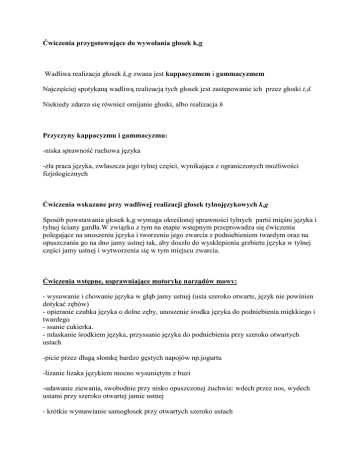 Ćwiczenia przygotowujące do wywołania głosek k,g Wadliwa realizacja głosek k,g zwana jest kappacyzmem i gammacyzmem Najczęściej spotykaną wadliwą realizacją tych głosek jest zastępowanie ich przez głoski t,d. Niekiedy zdarza się również omijanie głoski, albo realizacja h Przyczyny kappacyzmu i gammacyzmu: -niska sprawność ruchowa języka -zła praca języka, zwłaszcza jego tylnej części, wynikająca z ograniczonych możliwości fizjologicznych Ćwiczenia wskazane przy wadliwej realizacji głosek tylnojęzykowych k,g Sposób powstawania głosek k,g wymaga określonej sprawności tylnych partii mięśni języka i tylnej ściany gardła.W związku z tym na etapie wstępnym przeprowadza się ćwiczenia polegające na unoszeniu języka i tworzeniu jego zwarcia z podniebieniem twardym oraz na opuszczaniu go na dno jamy ustnej tak, aby doszło do wysklepienia grzbietu języka w tylnej części jamy ustnej i wytworzenia się w tym miejscu zwarcia. Ćwiczenia wstępne, usprawniające motorykę narządów mowy: - wysuwanie i chowanie języka w głąb jamy ustnej (usta szeroko otwarte, język nie powinien dotykać zębów) - opieranie czubka języka o dolne zęby, unoszenie środka języka do podniebienia miękkiego i twardego - ssanie cukierka. - mlaskanie środkiem języka, przyssanie języka do podniebienia przy szeroko otwartych ustach -picie przez długą słomkę bardzo gęstych napojów np.jogurtu -lizanie lizaka językiem mocno wysuniętym z buzi -udawanie ziewania, swobodnie przy nisko opuszczonej żuchwie: wdech przez nos, wydech ustami przy szeroko otwartej jamie ustnej - krótkie wymawianie samogłosek przy otwartych szeroko ustach Ćwiczenia oddechowe: - odtajanie zamarzniętej szyby - mocno przedłużone chuchanie - chuchanie na ręce, bo zmarzły - naśladowanie odgłosów zwierząt, (np. przeciąganie dźwięku muuuu, hu-hu-hu,miauuuu) - naśladowanie śmiechu różnych ludzi np. he, he, he, he, (staruszki); ha, ha, ha, ha, (kobiety) ; ho, ho, ho, ho, (mężczyzny) ; hi, hi, hi, hi, (dziewczynki) -ziewanie długie i przesadne -wdychanie powietrza nosem i wydychanie ustami, podczas szerokiego otwierania ust -przysysanie drobnych papierków przez rurkę i przenoszenie ich na plansze - chrapanie na wdechu i na wydechu