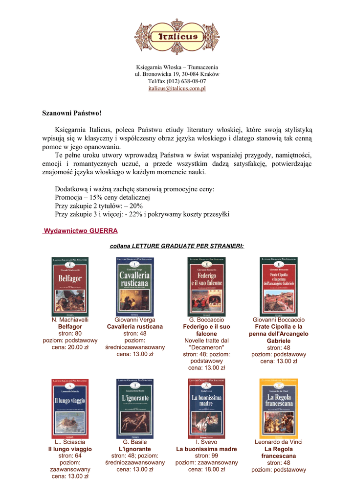 Księgarnia Włoska – Tłumaczenia ul. Bronowicka 19, 30-084 Kraków Tel/fax (012) 638-08-07 [email protected] Szanowni Państwo! Księgarnia Italicus, poleca Państwu etiudy literatury włoskiej, które swoją stylistyką wpisują się w klasyczny i współczesny obraz języka włoskiego i dlatego stanowią tak cenną pomoc w jego opanowaniu. Te pełne uroku utwory wprowadzą Państwa w świat wspaniałej przygody, namiętności, emocji i romantycznych uczuć, a przede wszystkim dadzą satysfakcję, potwierdzając znajomość języka włoskiego w każdym momencie nauki. Dodatkową i ważną zachętę stanowią promocyjne ceny: Promocja – 15% ceny detalicznej Przy zakupie 2 tytułów: – 20% Przy zakupie 3 i więcej: - 22% i pokrywamy koszty przesyłki Wydawnictwo GUERRA collana LETTURE GRADUATE PER STRANIERI: N. Machiavelli Belfagor stron: 80 poziom: podstawowy cena: 20.00 zł Giovanni Verga Cavalleria rusticana stron: 48 poziom: średniozaawansowany cena: 13.00 zł G. Boccaccio Federigo e il suo falcone Novelle tratte dal "Decameron" stron: 48; poziom: podstawowy cena: 13.00 zł Giovanni Boccaccio Frate Cipolla e la penna dell'Arcangelo Gabriele stron: 48 poziom: podstawowy cena: 13.00 zł L.. Sciascia Il lungo viaggio stron: 64 poziom: zaawansowany cena: 13.00 zł G. Basile L'ignorante stron: 48; poziom: średniozaawansowany cena: 13.00 zł I. Svevo La buonissima madre stron: 99 poziom: zaawansowany cena: 18.00 zł Leonardo da Vinci La Regola francescana stron: 48 poziom: podstawowy cena: 13.00 zł G. Ozzi La risposta della serva. Novella d'amore. stron: 48 poziom: średniozaawansowany cena: 13.00 zł . Goldoni La Locandiera (livello Avanzato). A cura di M.A. Covinio Bisaccia, S. Bravi stron: 190 poziom: zaawansowany cena: 13.00 zł G. Boccaccio Madonna Filippa; Melchisedech e il Saladino stron: 64 poziom: podstawowy cena: 13.00 zł Edmondo De Amicis Il Piccolo Scrivano Fiorentino Racconto tratto da 'Cuore' stron: 72 poziom: intermedio cena: 20.00 zł collana ANTOLOGIE a cura A.C.Ponti, B.Ponti Antologia leopardiana stron: 128 poziom zaawansowany cena: 50.00 zł a cura L.M.Reale Dentro il tempo Antologia minima della letteratura italiana stron: 264 poziom zaawansowany cena: 55.00 zł C.Bura - M.A.Morettini Dieci novelle dal Decameron di G. Boccaccio stron: 168 cena: 38.00 zł a cura A.C.Ponti Poesia italiana (1224-1961) stron: 208 poziom: zaawansowany cena: 55.00 zł CLASSICI ITALIANI OTTO-NOVECENTO E. Salgari Il Corsaro Nero Introduzione e note di A. C. Ponti stron: 336 cena: 32.00 zł Niccolo Tommaseo Fede e Bellezza Matilde Serao Il Ventre di Napoli Remigio Zena La Bocca del Lupo stron: 144 cena: 24.00 zł stron: 188 cena: 22.00 zł stron: 192 cena: 27.00 zł i inne (odsyłamy na stronę classici italiani otto-novecento) collana IL PIACERE DELLA LETTURA: A. Lombardo, L. Nosengo Altri Racconti da „Navi in bottiglia” di G. Romagnoli poziom średniozaawansowany cena: 26.00 zł R. Carloni Il Ritrovamento della Cupola stron: 94 cena: 26.00 zł A. Lombardo, L. Nosengo Racconti da „Navi in bottiglia” di G. Romagnoli poziom: zaawansowany cena: 26.00 zł Maria Angela Cernigliaro L'Ottimismo e' il Profumo della Vita stron: 72; poziom: podstawowy cena: 26.00 zł M. Rapacciuolo, R. Teo Giampi e l'assassino a teatro cena: 26.00 zł R. Carloni XR45 stron: 96 cena: 26.00 zł M. Rapacciuolo, R. Teo Stelle, perle e mistero cena: 26.00 zł R. Carloni Il Proiettore del tempo stron: 112 poziom: zaawansowany cena: 24.00 zł M. Rapacciuolo, R. Teo Le strane notti di Bologna stron: 85; poziom: średniozaawansowany cena: 26.00 zł Wydawnictwo PROGETTO LINGUA FIRENZE C. Manella Il caso Rassetti con note linguistiche, vocabolario ed esercizi con soluzioni; stron: 64; poziom: podstawowy i średniozaawansowany cena: 25.00 zł Wydawnicwo ALMA C. Manella Gli odori del signor Cotter con note linguistiche, vocabolario ed esercizi con soluzioni; stron: 64; poziom: średniozaawansowany cena: 25.00 zł C. Manella Viva la mamma ! con note linguistiche, vocabolario ed esercizi con soluzioni; stron: 64; poziom: podstawowy cena: 25.00 zł A. De Giuli, C.M. Naddeo Dov’e' Yukio? 500 parole (testo) Livello I G Ducci La partita 1000 parole (testo) Livello II con audiocassette stron: 64 poziom: podstawowy cena: 26.00 zł stron: 63 cena: 60.00 zł A. De Giuli, C.M. Naddeo Mediterranea 2000 parole (testo) - Livello IV; 64 stron cena: 26.00 zł G. Ducci Pasta per due 500 parole (testo) - Livello I; stron 63 poziom: podstawowy cena: 26.00 zł Mediterranea + cassetta cena: 60.00 zł Pasta per due + audiocassetta; cena: 60.00 zł A. De Giuli, C.M. Naddeo L'ultimo Caravaggio 1500 parole (testo) Livello III cena: 26.00 zł L'ultimo Caravaggio + cassetta cena: 60.00 zł A. De Giuli, C.M. Naddeo Mafia, amore & polizia 1500 parole (testo) Livello III; 64 stron cena: 26.00 zł A. De Giuli, C.M. Naddeo Maschere a Venezia 1000 parole (testo) Livello II; 64 stron cena: 26.00 zł Mafia, amore & polizia + cassetta cena: 60.00 zł Maschere a Venezia + cassetta cena: 61.00 zł A. De Giuli, C.M. Naddeo Dolce vita 2500 parole (testo) - Livello V; stron 80; poziom: średniozaawanso wany cena: 26.00 zł A. De Giuli, C.M. Naddeo Fantasmi 1000 parole (testo) - Livello II; stron 64 poziom: podstawowy cena: 26.00 zł A. De Giuli, C.M. Naddeo Un’altra vita 2500 parole (testo) - Livello V stron: 64; poziom: średniozaawanso wany cena: 26.00 zł Dolce vita + cassetta cena: 60.00 zł Fantasmi + cassetta cena: 60.00 zł Un’altra vita + cassetta cena: 60.00 zł A. De Giuli, C.M. Naddeo Modelle, pistole e mozzarelle 1500 parole (testo) Livello III; stron: 64; cena: 26.00 zł Modelle, pistole e mozzarelle + cassetta cena: 60.00 zł A. De Giuli, C.M. Naddeo Piccole storie d'amore 2000 parole (testo) Livello IV; cena: 26.00 zł A. De Giuli, C.M. Naddeo Radio Lina 500 parole (testo) Livello I stron: 96 cena: 26.00 zł Piccole storie d'amore + cassetta cena: 60.00 zł Radio Lina + cassetta cena: 60.00 zł Wydawnictwo: ELI - EUROPEAN LANGUAGE IN