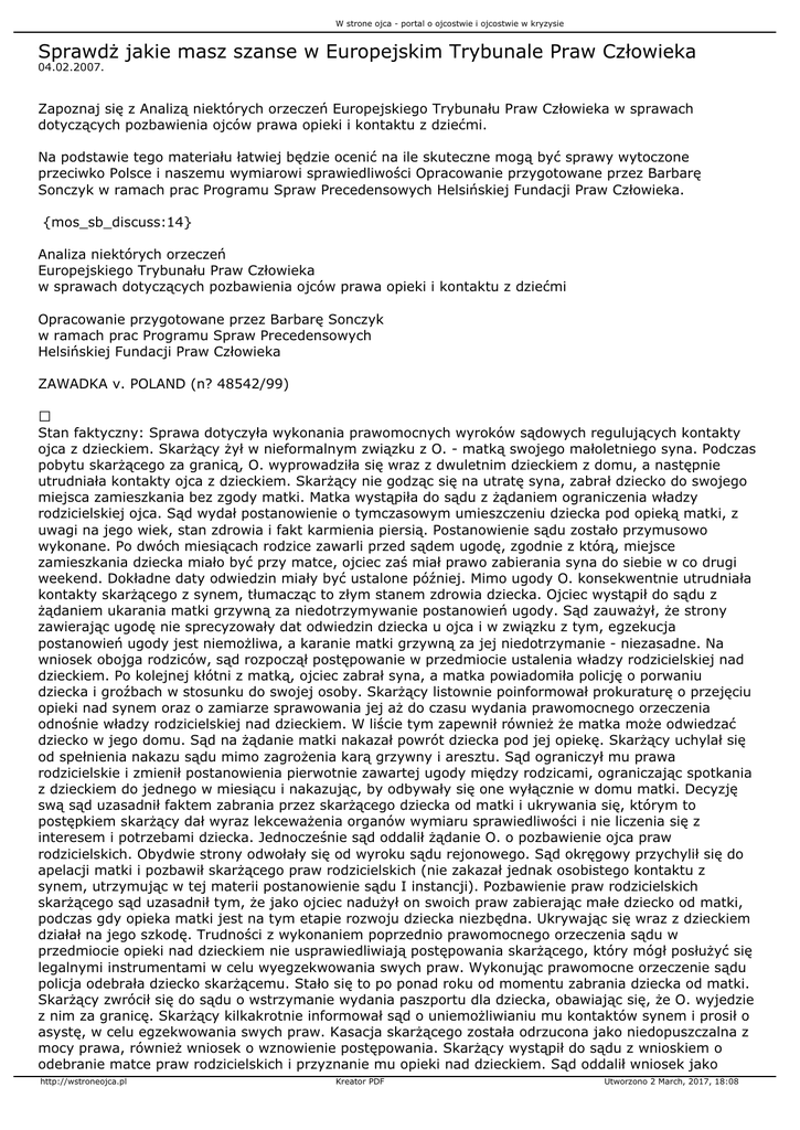 apelacji matki i pozbawił skarżącego praw rodzicielskich (nie zakazał jednak osobistego kontaktu z