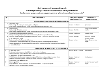 Opis konkurencji sprawnościowych Gminnego Turnieju Sołectw o Puchar Wójta Gminy Nowosolna Konkurencje sprawnościowe przygotowane są w formie rywalizacji „na wesoło” Lp. OPIS KONKURENCJI ILOŚĆ UCZESTNIKÓW Z KAŻDEJ DRUŻYNY REKWIZYTY – zapewnia GPCKiE KONKURENCJE INDYWIDUALNE DLA DOROSŁYCH 1. Ujeżdżanie byka. Konkurencja dla mężczyzn, na czas, jedno podejście. Konkurencję wygrywa drużyna, której zawodnik najdłużej utrzyma się na byku. 2. Dojenie krowy. Konkurencja dla kobiet, na czas. Konkurencję wygrywa drużyna, której zawodniczka w ciągu 1 minuty udoi najwięcej mleka . 3. Rzut snopkiem: konkurencja dla mężczyzn. Polega na jak najdalszym wyrzuceniu snopka słomy. Technika i sposób dowolny. 4. Wbijanie ćwieka: konkurencja dla kobiet polega na wbiciu 3 gwoździ w drewniany pieniek, w jak najkrótszym czasie. 5. Dożynkowa kasa. Konkurencja dla Sołtysa. W konkurencji bierze udział sołtys lub osoba z rady sołeckiej (wyznaczona przez sołtysa). Polega na znalezieniu jak największej ilości monet (nie liczy się nominał) w misce wypełnionej zbożem w czasie 60 sekund. 1 osoba - mężczyzna Byk, stoper. 1 osoba - kobieta Krowa, stoper, wiadro, miarka. 1 osoba - mężczyzna Snopek, miarka 1 osoba - kobieta Gwoździe, młotek, drewno, (stoper) Miska, zboze, monety, stoper 1 osoba - sołtys KONKURENCJE ZESPOŁOWE DLA DOROSŁYCH 1. 2. 3. Przetaczanie balota. Drużyna sołectwa powinna składać się z 3 osób (w tym 1 kobieta). Drużyna pokonuje trasę o długości 20 m (2 x 10 m z nawrotem) tocząc balot słomy. O zwycięstwie decyduje czas pokonania trasy. Wyścigi taczek: konkurencja rozgrywana w parach(kobieta i mężczyzna), jedna osoba wiezie partnera na taczce w jednym kierunku, w drodze powrotnej następuje zamiana. Konkurencja rozgrywana na czas. Slalom ogrodnika. Bieg sztafetowy. Slalom pomiędzy ustawionymi tyczkami, z kapustą na szpadlu. Dystans: 2 x po 20 m dla każdego z drużyny. 3 osoby, w tym 1 kobieta Balot, stoper 2 osoby – kobieta i mężczyzna Taczka, stoper 2 osoby – kobieta i mężczyzna Szpadel, kapusta, tyczki, stoper KONKURENCJE DLA DZIECI I MŁODZIEŻY 1. 2. 3. 4. 5. Bieg z jajkiem. Konkurencja na czas. Po jednej parze z każdej drużyny, jedna osoba biegnie z jajkiem na łyżce przez slalom (20 m.), następnie przekazuje drugiej osobie, która wraca na start (zmiana za wyznaczoną linią - inaczej będzie dyskwalifikacja). Wygrywa ta drużyna, która jako pierwsza poprawnie wykona zadanie: jajko musi być CAŁE! W przypadku stłuczenia jajka biegamy do skutku! Bieg z wodą. Konkurencja dla dzieci do 12 lat. Każde Sołectwo wystawia jednego zawodnika. Zawodnik z plastikowym kubkiem o pojemności 0,2 litra, w jednej ręce przenosi wodę z wiadra do drugiego wiadra. Odległość pomiędzy jednym a drugim wiadrem wynosi 10 m, a czas trwania konkurencji wynosi 3 minuty. Kubka z wodą nie wolno przykrywać. Wszyscy zawodnicy startują jednocześnie. Wygrywa ten, który zdoła przenieść największą ilość wody. Woda mierzona jest w wiadrze za pomocą metra stolarskiego lub linijki (wysokość słupa wody). Bieg na trzech nogach Zawodnicy związują po jednej nodze (na wysokości kostki), na komendę „start” biegną w wyznaczone miejsce i wracają na start. Wygrywa reprezentacja która najszybciej pokona wyznaczony dystans (2x20m.) Wyścigi w workach. Konkurencja dla dzieci do 12 lat. Zawodnicy startują do biegu w workach na dystansie 2x20m. Wygrywa ten kto pierwszy dobiegnie do mety w worku. Rzut ziemniakami do celu. Konkurencja dla młodzieży. Polega na przerzuceniu w czasie 1 minuty z odległości 3 metrów jak największej ilości ziemniaków z worka do koszyka. Wygrywa drużyna której zawodnik wrzuci celnie do kosza najwięcej ziemniaków. 2 osoby 1 osoba w wieku do lat 12 i 1 osoba w przedziale wiekowym 13-18 lat Łyżki, jajka 1 osoba w wieku do lat 12 Wiadra, woda, kubek, miarka 2 osoby 1 osoba w wieku do lat 12 i 1 osoba w przedziale wiekowym 13-18 lat 1 osoba w wieku do 12 lat sznurek 1 osoba w przedziale wiekowym 13-18 lat ziemniaki, kosz worki - Ustala się punktację od 16 pkt. za I miejsce do 1 pkt. za miejsce XVI (o 1 pkt mniej za każde kolejne miejsce licząc od pierwszego). Za każdą konkurencję zwycięska drużyna otrzymuje maksymalną liczbę punktów – 16 (maksymalna liczba punktów zależna jest od liczby sołectw biorących udział w turnieju). Kolejne miejsca to odpowiednio o 1 pkt mniej z każde kolejne miejsce licząc od pierwszego. - Na punktację drużynową składają się punkty za wszystkie poszczególne konkurencje. Turniej wygrywa reprezentacja która zdobędzie największą liczbę punktów. - Konkurencje dla dzieci odbywać się będą równolegle z konkurencjami dla dorosłych. Do udziału w Turnieju zapraszamy drużyny minimum 5 - osobowe: - Sołtysa, - osoby dorosłe: kobieta i mężczyzna, - dzieci i młodzież : 1 osoba w wieku do lat 12 i 1 osoba w przedziale wiekowym 13-18 lat. Drużyny mogą być liczne, w każdej konkurencji sołectwo reprezentować mogą inne osoby.
