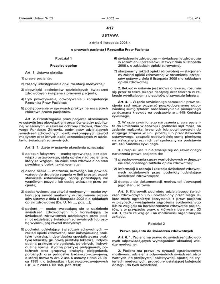 Dziennik Ustaw Nr 52 — 4662 — Poz. 417 417 USTAWA z dnia 6 listopada 2008 r. o prawach pacjenta i Rzeczniku Praw Pacjenta Rozdzia∏ 1 Przepisy ogólne Art. 1. Ustawa okreÊla: 1) prawa pacjenta; 2) zasady udost´pniania dokumentacji medycznej; 3) obowiàzki podmiotów udzielajàcych Êwiadczeƒ zdrowotnych zwiàzane z prawami pacjenta; 4) tryb powo∏ywania, odwo∏ywania i kompetencje Rzecznika Praw Pacjenta; 5) post´powanie w sprawach praktyk naruszajàcych zbiorowe prawa pacjentów. Art. 2. Przestrzeganie praw pacjenta okreÊlonych w ustawie jest obowiàzkiem organów w∏adzy publicznej w∏aÊciwych w zakresie ochrony zdrowia, Narodowego Funduszu Zdrowia, podmiotów udzielajàcych Êwiadczeƒ zdrowotnych, osób wykonujàcych zawód medyczny oraz innych osób uczestniczàcych w udzielaniu Êwiadczeƒ zdrowotnych. Art. 3. 1. U˝yte w ustawie okreÊlenia oznaczajà: 1) opiekun faktyczny — osob´ sprawujàcà, bez obowiàzku ustawowego, sta∏à opiek´ nad pacjentem, który ze wzgl´du na wiek, stan zdrowia albo stan psychiczny opieki takiej wymaga; 2) osoba bliska — ma∏˝onka, krewnego lub powinowatego do drugiego stopnia w linii prostej, przedstawiciela ustawowego, osob´ pozostajàcà we wspólnym po˝yciu lub osob´ wskazanà przez pacjenta; 3) osoba wykonujàca zawód medyczny — osob´ wykonujàcà zawód medyczny w rozumieniu przepisów ustawy z dnia 6 listopada 2008 r. o zak∏adach opieki zdrowotnej (Dz. U. Nr ..., poz. ...); 4) pacjent — osob´ zwracajàcà si´ o udzielenie Êwiadczeƒ zdrowotnych lub korzystajàcà ze Êwiadczeƒ zdrowotnych udzielanych przez podmiot udzielajàcy Êwiadczeƒ zdrowotnych lub osob´ wykonujàcà zawód medyczny; 5) podmiot udzielajàcy Êwiadczeƒ zdrowotnych — zak∏ad opieki zdrowotnej oraz indywidualnà praktyk´ lekarskà, indywidualnà specjalistycznà praktyk´ lekarskà, grupowà praktyk´ lekarskà, indywidualnà praktyk´ piel´gniarek, po∏o˝nych, indywidualnà specjalistycznà praktyk´ piel´gniarek, po∏o˝nych oraz grupowà praktyk´ piel´gniarek, po∏o˝nych oraz jednostk´ badawczo-rozwojowà, o której mowa w art. 2 ust. 6 ustawy z dnia 25 lipca 1985 r. o jednostkach badawczo-rozwojowych (Dz. U. z 2008 r. Nr 159, poz. 993); 6) Êwiadczenie zdrowotne — Êwiadczenie zdrowotne w rozumieniu przepisów ustawy z dnia 6 listopada 2008 r. o zak∏adach opieki zdrowotnej; 7) stacjonarny zak∏ad opieki zdrowotnej — stacjonarny zak∏ad opieki zdrowotnej w rozumieniu przepisów ustawy z dnia 6 listopada 2008 r. o zak∏adach opieki zdrowotnej. 2. Ilekroç w ustawie jest mowa o lekarzu, rozumie si´ przez to tak˝e lekarza dentyst´ oraz felczera w zakresie wynikajàcym z przepisów o zawodzie felczera. Art. 4. 1. W razie zawinionego naruszenia praw pacjenta sàd mo˝e przyznaç poszkodowanemu odpowiednià sum´ tytu∏em zadoÊçuczynienia pieni´˝nego za doznanà krzywd´ na podstawie art. 448 Kodeksu cywilnego. 2. W razie zawinionego naruszenia prawa pacjenta do umierania w spokoju i godnoÊci sàd mo˝e, na ˝àdanie ma∏˝onka, krewnych lub powinowatych do drugiego stopnia w linii prostej lub przedstawiciela ustawowego, zasàdziç odpowiednià sum´ pieni´˝nà na wskazany przez nich cel spo∏eczny na podstawie art. 448 Kodeksu cywilnego. 3. Przepisu ust. 1 nie stosuje si´ do zawinionego naruszenia prawa pacjenta do: 1) przechowywania rzeczy wartoÊciowych w depozycie stacjonarnego zak∏adu opieki zdrowotnej; 2) informacji o rodzaju i zakresie Êwiadczeƒ zdrowotnych udzielanych przez podmioty udzielajàce Êwiadczeƒ zdrowotnych; 3) dost´pu do dokumentacji medycznej dotyczàcej jego stanu zdrowia. Art. 5. Kierownik podmiotu udzielajàcego Êwiadczeƒ zdrowotnych lub upowa˝niony przez niego lekarz mo˝e ograniczyç korzystanie z praw pacjenta w przypadku wystàpienia zagro˝enia epidemicznego lub ze wzgl´du na bezpieczeƒstwo zdrowotne pacjentów, a w przypadku praw, o których mowa w art. 33 ust. 1, tak˝e ze wzgl´du na mo˝liwoÊci organizacyjne zak∏adu. Rozdzia∏ 2 Prawo pacjenta do Êwiadczeƒ zdrowotnych Art. 6. 1. Pacjent ma prawo do Êwiadczeƒ zdrowotnych odpowiadajàcych wymaganiom aktualnej wiedzy medycznej. 2. Pacjent ma prawo, w sytuacji ograniczonych mo˝liwoÊci udzielenia odpowiednich Êwiadczeƒ zdrowotnych, do przejrzystej, obiektywnej, opartej na kryteriach medycznych, procedury ustalajàcej kolejnoÊç dost´pu do tych Êwiadczeƒ. Dziennik Ustaw Nr 52 — 4663 — 3. Pacjent ma prawo ˝àdaç, aby udzielajàcy mu Êwiadczeƒ zdrowotnych: 1) lekarz zasi´gnà∏ opinii innego lekarza lub zwo∏a∏ konsylium lekarskie; 2) piel´gniarka (po∏o˝na) zasi´gn´∏a opinii innej piel´gniarki (po∏o˝nej). 4. Lekarz mo˝e odmówiç zwo∏ania konsylium lekarskiego lub zasi´gni´cia opinii innego lekarza, je˝eli uzna, ˝e ˝àdanie, o którym mowa w ust. 3, jest bezzasadne. 5. ˚àdanie, o którym mowa w ust. 3, oraz odmow´, o której mowa w ust. 4, odnotowuje si´ w dokumentacji medycznej. 6. Przepisy ust. 4 i 5 stosuje si´ do piel´gniarki (po∏o˝nej) w zakresie zasi´gania opinii innej piel´gniarki (po∏o˝nej). Art. 7. 1. Pacjent ma prawo do natychmiastowego udzielenia Êwiadczeƒ zdrowotnych ze wzgl´du na zagro˝enie zdrowia lub ˝ycia. 2. W przypadku porodu pacjentka ma prawo do uzyskania Êwiadczeƒ zdrowotnych zwiàzanych z porodem. Art. 8. Pacjent ma prawo do Êwiadczeƒ zdrowotnych udzielanych z nale˝ytà starannoÊcià przez podmioty udzielajàce Êwiadczeƒ zdrowotnych w warunkach odpowiadajàcych okreÊlonym w odr´bnych przepisach wymaganiom fachowym i sanitarnym. Przy udzielaniu Êwiadczeƒ zdrowotnych osoby wykonujàce zawód medyczny kierujà si´ zasadami etyki zawodowej okreÊlonymi przez w∏aÊciwe samorzàdy zawodów medycznych. Rozdzia∏ 3 Prawo pacjenta do informacji Art. 9. 1. Pacjent ma prawo do informacji o swoim stanie zdrowia. 2. Pacjent, w tym ma∏oletni, który ukoƒczy∏ 16 lat, lub jego ustawowy przedstawiciel majà prawo do uzyskan