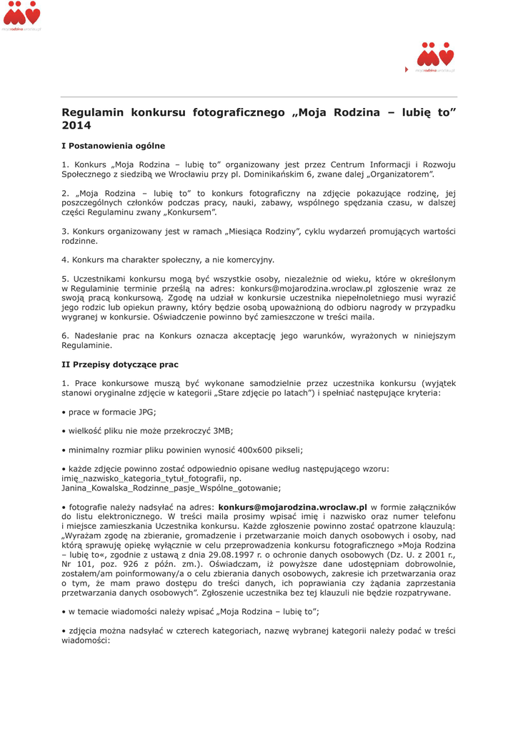 Regulamin konkursu fotograficznego „Moja Rodzina – lubię to” 2014 I Postanowienia ogólne 1. Konkurs „Moja Rodzina – lubię to” organizowany jest przez Centrum Informacji i Rozwoju Społecznego z siedzibą we Wrocławiu przy pl. Dominikańskim 6, zwane dalej „Organizatorem”. 2. „Moja Rodzina – lubię to” to konkurs fotograficzny na zdjęcie pokazujące rodzinę, jej poszczególnych członków podczas pracy, nauki, zabawy, wspólnego spędzania czasu, w dalszej części Regulaminu zwany „Konkursem”. 3. Konkurs organizowany jest w ramach „Miesiąca Rodziny”, cyklu wydarzeń promujących wartości rodzinne. 4. Konkurs ma charakter społeczny, a nie komercyjny. 5. Uczestnikami konkursu mogą być wszystkie osoby, niezależnie od wieku, które w określonym w Regulaminie terminie prześlą na adres: [email protected] zgłoszenie wraz ze swoją pracą konkursową. Zgodę na udział w konkursie uczestnika niepełnoletniego musi wyrazić jego rodzic lub opiekun prawny, który będzie osobą upoważnioną do odbioru nagrody w przypadku wygranej w konkursie. Oświadczenie powinno być zamieszczone w treści maila. 6. Nadesłanie prac na Konkurs oznacza akceptację jego warunków, wyrażonych w niniejszym Regulaminie. II Przepisy dotyczące prac 1. Prace konkursowe muszą być wykonane samodzielnie przez uczestnika konkursu (wyjątek stanowi oryginalne zdjęcie w kategorii „Stare zdjęcie po latach”) i spełniać następujące kryteria: • prace w formacie JPG; • wielkość pliku nie może przekroczyć 3MB; • minimalny rozmiar pliku powinien wynosić 400x600 pikseli; • każde zdjęcie powinno zostać odpowiednio opisane według następującego wzoru: imię_nazwisko_kategoria_tytuł_fotografii, np. Janina_Kowalska_Rodzinne_pasje_Wspólne_gotowanie; • fotografie należy nadsyłać na adres: [email protected] w formie załączników do listu elektronicznego. W treści maila prosimy wpisać imię i nazwisko oraz numer telefonu i miejsce zamieszkania Uczestnika konkursu. Każde zgłoszenie powinno zostać opatrzone klauzulą: „Wyrażam zgodę na zbieranie, gromadzenie i przetwarzanie moich danych osobowych i osoby, nad którą sprawuję opiekę wyłącznie w celu przeprowadzenia konkursu fotograficznego »Moja Rodzina – lubię to«, zgodnie z ustawą z dnia 29.08.1997 r. o ochronie danych osobowych (Dz. U. z 2001 r., Nr 101, poz. 926 z późn. zm.). Oświadczam, iż powyższe dane udostępniam dobrowolnie, zostałem/am poinformowany/a o celu zbierania danych osobowych, zakresie ich przetwarzania oraz o tym, że mam prawo dostępu do treści danych, ich poprawiania czy żądania zaprzestania przetwarzania danych osobowych”. Zgłoszenie uczestnika bez tej klauzuli nie będzie rozpatrywane. • w temacie wiadomości należy wpisać „Moja Rodzina – lubię to”; • zdjęcia można nadsyłać w czterech kategoriach, nazwę wybranej kategorii należy podać w treści wiadomości: „Rodzinne pasje” – fotografia rodzinna przedstawiająca wspólną zabawę, uprawianie sportu, realizowanie hobby, zainteresowań, spędzanie czasu w sposób kreatywny. „Rodzina wielopokoleniowo” – fotografia rodzinna przedstawiająca generacje młodsze i starsze. „Stare zdjęcie po latach” – zestawienie oryginalnego zdjęcia, wykonanego w przeszłości (np. w dzieciństwie) ze współczesną wersją, czyli te same osoby w podobnych strojach, postawach oraz na podobnym tle (plik powinien zawierać zestawienie obu zdjęć) (przykład: http://bi.gazeta.pl/im/90/66/d3/z13854352Q,Po-latach-spotkali-sie--aby-odtworzyc-starezdjeci.jpg). „Z rodziną na co dzień i od święta” – tradycyjna fotografia rodzinna przedstawiająca jej członków. „Rodzinne wakacje” - zdjęcie przedstawiające rodzinę podczas wakacji, niezależnie czy nad morzem, czy w górach, lub nad jeziorem czy w domowym ogródku. • każdy uczestnik konkursu może nadesłać maksymalnie jedną fotografię w każdej kategorii; • zdjęcia zostaną opublikowane na stronie: facebook.com/mojarodzinawroclaw po zakończeniu etapu nadsyłania zdjęć (01.09, godzina 12.00) w albumach odpowiednich do każdej kategorii, zdjęcia będą opatrzone tytułem umieszczonym przez uczestnika konkursu w nazwie pliku; • zwycięzców konkursu po ogłoszeniu wyników poprosimy o dostarczenie zdjęć w większym rozmiarze. III Terminy 1. Konkurs trwa od 1 czerwca do 15 września. 2. Pierwszy etap, czyli nadsyłanie prac, trwa od 1 czerwca do 31 sierpnia, do godz. 23.59. 3. Drugi etap, czyli głosowanie na stronie facebook.com/mojarodzinawroclaw trwa od 1 września, godz. 12.00 do 15 września, godz. 12.00. 6. Zwycięzców konkursu poznamy we wrześniu. 7. Zwycięzcy konkursu zostaną powiadomieni o wygranej przez jednokrotne wysłanie wiadomości na adres e-mail Uczestnika lub telefonicznie na numer podany w zgłoszeniu. Lista zwycięzców będzie też ogłaszana na stronie internetowej mojarodzina.wroclaw.pl. IV Głosowanie 1. Głosowanie będzie się odbywać na stronie facebook.com/mojarodzinawroclaw w terminie od 1 września, godz. 12.00, do 15 września, godz. 12.00. 2. Głosować będą użytkownicy portalu Facebook, poprzez zaznaczenie opcji „Lubię to” pod wybranym zdjęciem. 3. Zdjęcie z największą liczbą polubień wygrywa w danej kategorii. Wedle liczby polubień miejsce drugie i trzecie zajmują kolejne osoby. 4. Dopuszczalne są wszelkie formy promowania swojego zdjęcia. V Nagrody i wyróżnienia 1. W konkursie przewidziane są nagrody dla laureatów pierwszego, drugiego i trzeciego miejsca w każdej kategorii. 2. Wygrane zdjęcia zostaną opublikowane na portalu mojarodzina.wroclaw.pl. 3. W konkursie przewidziane są nagrody rzeczowe, m.in. sesje zdjęciowe dla całej rodziny, wejściówki do instytucji kulturalnych oraz prorodzinnych miejsc we Wrocławiu. 4. Nagroda rzeczowa nie podlega zamianie na inną ani zamianie na ekwiwalent pieniężny. 5. Przyjmuje się, że osobą uprawnioną do 