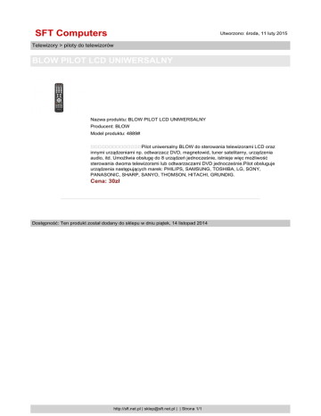 SFT Computers Utworzono: środa, 11 luty 2015 Telewizory > piloty do telewizorów BLOW PILOT LCD UNIWERSALNY Nazwa produktu: BLOW PILOT LCD UNIWERSALNY Producent: BLOW Model produktu: 4889# Pilot uniwersalny BLOW do sterowania telewizorami LCD oraz innymi urządzeniami np. odtwarzacz DVD, magnetowid, tuner satelitarny, urządzenia audio, itd. Umożliwia obsługę do 8 urządzeń jednocześnie, istnieje więc możliwość sterowania dwoma telewizorami lub odtwarzaczami DVD jednocześnie.Pilot obsługuje urządzenia następujących marek: PHILIPS, SAMSUNG, TOSHIBA, LG, SONY, PANASONIC, SHARP, SANYO, THOMSON, HITACHI, GRUNDIG. Cena: 30zł Dostępność: Ten produkt został dodany do sklepu w dniu piątek, 14 listopad 2014 http://sft.net.pl | [email protected] | | Strona 1/1