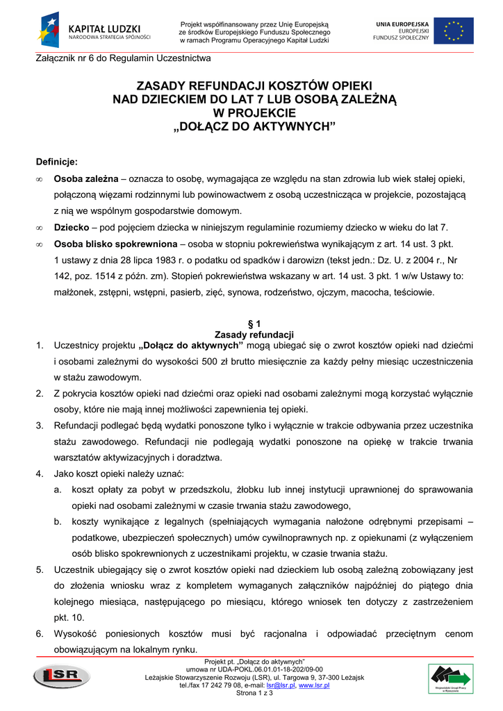 Projekt współfinansowany przez Unię Europejską ze środków Europejskiego Funduszu Społecznego w ramach Programu Operacyjnego Kapitał Ludzki Załącznik nr 6 do Regulamin Uczestnictwa ZASADY REFUNDACJI KOSZTÓW OPIEKI NAD DZIECKIEM DO LAT 7 LUB OSOBĄ ZALEŻNĄ W PROJEKCIE „DOŁĄCZ DO AKTYWNYCH” Definicje: • Osoba zależna – oznacza to osobę, wymagająca ze względu na stan zdrowia lub wiek stałej opieki, połączoną więzami rodzinnymi lub powinowactwem z osobą uczestnicząca w projekcie, pozostającą z nią we wspólnym gospodarstwie domowym. • Dziecko – pod pojęciem dziecka w niniejszym regulaminie rozumiemy dziecko w wieku do lat 7. • Osoba blisko spokrewniona – osoba w stopniu pokrewieństwa wynikającym z art. 14 ust. 3 pkt. 1 ustawy z dnia 28 lipca 1983 r. o podatku od spadków i darowizn (tekst jedn.: Dz. U. z 2004 r., Nr 142, poz. 1514 z późn. zm). Stopień pokrewieństwa wskazany w art. 14 ust. 3 pkt. 1 w/w Ustawy to: małżonek, zstępni, wstępni, pasierb, zięć, synowa, rodzeństwo, ojczym, macocha, teściowie. 1. §1 Zasady refundacji Uczestnicy projektu „Dołącz do aktywnych” mogą ubiegać się o zwrot kosztów opieki nad dziećmi i osobami zależnymi do wysokości 500 zł brutto miesięcznie za każdy pełny miesiąc uczestniczenia w stażu zawodowym. 2. Z pokrycia kosztów opieki nad dziećmi oraz opieki nad osobami zależnymi mogą korzystać wyłącznie osoby, które nie mają innej możliwości zapewnienia tej opieki. 3. Refundacji podlegać będą wydatki ponoszone tylko i wyłącznie w trakcie odbywania przez uczestnika stażu zawodowego. Refundacji nie podlegają wydatki ponoszone na opiekę w trakcie trwania warsztatów aktywizacyjnych i doradztwa. 4. Jako koszt opieki należy uznać: a. koszt opłaty za pobyt w przedszkolu, żłobku lub innej instytucji uprawnionej do sprawowania opieki nad osobami zależnymi w czasie trwania stażu zawodowego, b. koszty wynikające z legalnych (spełniających wymagania nałożone odrębnymi przepisami – podatkowe, ubezpieczeń społecznych) umów cywilnoprawnych np. z opiekunami (z wyłączeniem osób blisko spokrewnionych z uczestnikami projektu, w czasie trwania stażu. 5. Uczestnik ubiegający się o zwrot kosztów opieki nad dzieckiem lub osobą zależną zobowiązany jest do złożenia wniosku wraz z kompletem wymaganych załączników najpóźniej do piątego dnia kolejnego miesiąca, następującego po miesiącu, którego wniosek ten dotyczy z zastrzeżeniem pkt. 10. 6. Wysokość poniesionych kosztów musi być racjonalna i odpowiadać przeciętnym cenom obowiązującym na lokalnym rynku. Projekt pt. „Dołącz do aktywnych” umowa nr UDA-POKL.06.01.01-18-202/09-00 Leżajskie Stowarzyszenie Rozwoju (LSR), ul. Targowa 9, 37-300 Leżajsk tel./fax 17 242 79 08, e-mail: [email protected], www.lsr.pl Strona 1 z 3 Projekt współfinansowany przez Unię Europejską ze środków Europejskiego Funduszu Społecznego w ramach Programu Operacyjnego Kapitał Ludzki 7. Refundacja kosztów może być niższa niż kwota wnioskowana przez uczestnika projektu. 8. Refundacja kosztów przysługuje wyłącznie po przedstawieniu ich udokumentowania w terminie określonym w pkt. 5 w wysokości odpowiadającej faktycznie poniesionym wydatkom. 9. Refundacja kosztów opieki nastąpi do 25 dnia miesiąca, w którym złożono wniosek z zastrzeżeniem pkt. 9. 10. Refundacje kosztów będą wypłacane pod warunkiem posiadania przez Leżajskie Stowarzyszenie Rozwoju środków finansowych na rachunku bankowym projektu. 11. Wnioski będą przyjmowane, aż do wyczerpania środków przeznaczonych na ten cel w budżecie projektu. 1. §2 Wymagane dokumenty Wniosek o refundację - załącznik nr 1 do niniejszego regulaminu wraz z wymaganymi załącznikami. 2. Wymagane załączniki: a. Potwierdzona za zgodność z oryginałem kopia aktu urodzenia dziecka/dzieci (wyłącznie przy składaniu pierwszego wniosku)– jeśli dotyczy, b. Kopia potwierdzona za zgodność z oryginałem dokumentu poświadczającego stan zdrowia osoby zależnej np. orzeczenie o niepełnosprawności ze wskazaniem o konieczności zapewnienia stałej opieki (wyłącznie przy składaniu pierwszego wniosku) – jeśli dotyczy. c. Potwierdzona za zgodność z oryginałem kopia rachunku lub faktury za pobyt osoby zależnej lub dziecka do lat 7 w instytucji opiekuńczej (przedszkolu, żłobku, domu opieki itd.) za każdy miesiąc w czasie odbywania przez uczestnika stażu zawodowego (na oryginalnym dokumencie należy umieścić informację, że opieka trwa w terminie odbywania stażu zawodowego) w przypadku zlecenia opieki instytucji uprawnionej do sprawowania opieki nad osobami zależnymi lub dziećmi, d. Potwierdzona za zgodność z oryginałem kopia umowy cywilnoprawnej z opiekunem zawierająca informację za jaki okres obowiązuje, tak, aby można było zidentyfikować stawkę. Z w/w umowy wynikać musi, że dotyczy ona sprawowania opieki w czasie odbywania przez uczestnika stażu zawodowego. Do umowy dołączyć należy rachunek za każdy miesiąc sprawowania tej opieki (kopia potwierdzona za zgodność z oryginałem), e. Dowód zapłaty rachunku lub faktury (za każdy miesiąc). 3. Brak jakiegokolwiek z wyżej wymienionych dokumentów skutkuje brakiem możliwości otrzymania świadczenia. Projekt pt. „Dołącz do aktywnych” umowa nr UDA-POKL.06.01.01-18-202/09-00 Leżajskie Stowarzyszenie Rozwoju (LSR), ul. Targowa 9, 37-300 Leżajsk tel./fax 17 242 79 08, e-mail: [email protected], www.lsr.pl Strona 2 z 3 Projekt współfinansowany przez Unię Europejską ze środków Europejskiego Funduszu Społecznego w ramach Programu Operacyjnego Kapitał Ludzki Załącznik nr 1 do Zasad refundacji kosztów opieki nad dzieckiem do lat 7 lub osobą zależną Data wpływu: Podpis osoby przyjmującej wniosek (Miejscowość, data) (Nr zgłoszenia) (Imię i nazwisko) (Adres) (PESEL) WNIOSEK nr ….. O PRZYZNANIE REFUNDACJI KOSZTÓW OPIEKI NAD DZIECKIEM DO 7 R