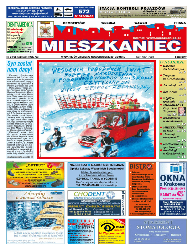 Okręgowa Stacja Kontroli Pojazdów pon.-pt.730-2100; sob. 800-1500 www.stacjakontrolipojazdow.pl Pe£ny zakres przegl¥dów rejestracyjnych dentamedica WA£ MIEDZESZYÑSKI 572 673−90−99 Rembertów S TA C J A K O N T R O L I P O J A Z D Ó W W e so Ł a − Z i e lona ul. Wspólna 49 obok Bomisu tel. 773−97−29 Zapraszamy: badania rejestracyjne pojazdów do 3,5 t DMC i pojazdów z instalacją gazową pon. – pt. w godz. 800-2000 regulacja zbieżności i geometria kół sobota w godz. 800-1600 wesoŁa praga wawer ortodoncja protetyka implanty stomatologia chirurgia RTG GocŁaw ul. Abrahama 2 22 671−31−32; 22 673−89−01 w w w. d e n t a m e d i c a . p l Nr 24/25(572/573) ROK XXI WYDANIE ŚWIĄTECZNO-NOWOROCZNE 2012/2013 r. W numerze: Syn został nam dany! dokończenie na str. 2 Harcerze dla bezdomnych str. 2 Tragedia na Grochowskiej str. 3 Jak minął rok? str. 4 Raz w roku str. 6 Wigilijne spotkania str. 9 MIESZKAŃCY Prof. Adam Strzembosz str. 10 Kwaśniewski w Rembertowie str. 12 MIESZKANIEC na luzie str. 13 „Mikołaj warszawski” str. 15 Dzielnicowo na sportowo str. 16 Kardiologia w Grochowskim str. 18 Fot. J. Frankowski Podczas liturgicznego Adwentu, jak i przez całe nasze życie, które jest wielkim adwentowym przygotowaniem na spotkanie z Panem, prowadzi nas Ona – Matka Jezusa i nasza Matka. Pomagają nam Prorocy Starego Testamentu. Zapowiada prorok: „A ty, Betlejem Efrata, najmniejsze jesteś wśród plemion judzkich. Z ciebie wyjdzie Ten, który będzie władał w Izraelu, a pochodzenie Jego od początku, od dni wieczności. Jego władza rozciągnie się aż do krańców ziemi. A On będzie pokojem”. Zapowiada prorok Izajasz: „Dziecię nam się narodziło, Syn został nam dany, na Jego barkach spoczęła władza. Nazwano Go imieniem: Przedziwny Doradca, Bóg Mocny, Odwieczny Ojciec, Książę Pokoju”. Przyszedł czas, kiedy wyszło rozporządzenie Cezara Augusta, żeby przeprowadzić spis ludności w całym państwie. Józef z Galilei, z miasta Nazaret, udał się do miasta Dawidowego zwanego Betlejem, ponieważ pochodził z domu i rodu Dawida, żeby się dać zapisać bezpłatny ISSN 1231-7993 reklama reklama NAJLEPSZA n NAJKORZYSTNIEJSZA Opieka Lekarzy Wszystkich Specjalności także dla osób starszych i z potrzebami zdrowotnymi SZYBKO, TANIO, WYGODNIE Umów się na wizytę do lekarza Tel. 790-60-60-40; www.medif.pl lC atering: WIGILIA w naszym lokalu lub w Państwa firmie. Zapraszamy do składania zamówień na potrawy świąteczne. lS YLWESTER 2012 Ceny do uzgodnienia, menu dostosowane indywidualnie do potrzeb klienta lS maczne obiady domowe – zestawy już od 12 zł ul. Abrahama 18 (wejście od Fieldorfa) Tel. 691-967-070 www.bistrogoclaw.pl e-mail: [email protected] G a b i n e t Stomatologiczny Ra bat Szwedzka 37 y! Tel. 818-07-91 bezbolesne leczenie nowoczesna protetyka ortodoncja u WA G A ! P romocyjna cena koron porcelanowych na metalu i cyrkonie czynne 9-20, sobota 9-14 672−77−77 Al. Waszyngtona 44 p r z y M i ę d z y n a r o d o w e j eleganckie lekkie okulary Soczewki kontaktowe lekarz okulista, badanie wzroku du¯y wybór opraw Promocja zimowa * RABAT do 42% * przy 100% wpłacie Biuro Handlowe: UNIPLAST P.H.U. ul. Ostrobramska 73 tel. (22) 613 50 33, (22) 870 27 17 e-mail: [email protected] Syn został nam dany! dokończenie ze str. 1 z poślubioną sobie Maryją, która była brzemienna. Pisze Święty Łukasz Ewangelista: „Kiedy tam przebywali, nadszedł dla Maryi czas rozwiązania. Porodziła swego pierworodnego Syna, owinęła Go w pieluszki i położyła w żłobie, gdyż nie było dla nich miejsca w gospodzie”. To Dziecię to nasz Bóg, Jezus, Pan Wielkiego Majestatu. Maryjo, Matko do Syna swego nas prowadź. Proszę Cię przypominaj nam Polakom starą prawdę: „Bez Boga, ani do proga”. Potrzeba nam uczyć się żyć tą prawdą, bo przepadniemy. Niech w radosne Święta Bożego Narodzenia płynie śpiew kolędy dla Jezusa i dla bliskich nie tylko z płyty, ale i z serca. Poprośmy Bo- że Dziecię tak prosto, jak potrafimy: „Podnieś rękę Boże Dziecię, błogosław Ojczyznę miłą. Dom nasz i majętność całą i wszystkie wioski z miastami”. Niech Twoje błogosławieństwo spocznie na świętych i na grzesznikach, na młodych i starszych, na mędrcach i nierozsądnych. Pokój nam daj. Na Święta Bożego Narodzenia i cały Nowy Rok sympatycznej Redakcji i wszystkim Szanownym Czytelnikom zacnego czasopisma „Mieszkaniec” składam serdeczne życzenia: Niech Bóg błogosławi, ochrania i prowadzi. Wszystkim Szczęść Boże. Ksiądz Krzysztof Jackowski Proboszcz u Matki Bożej Królowej Polskich Męczenników Harcerze dla bezdomnych Po raz kolejny harcerze z ZHR zorganizowali przy kościele na Kamionku „wigilię dla potrzebujących”. I dla wszystkich osób, którym „pod górkę”. Tym razem, 16 grudnia, w garkuchni rozstawionej na przykościelnym terenie parafii pw. Bożego Ciała, warzył się krupnik. Młodym kucharzom w mundurkach tradycyjnie pomagali rodzice. Dzięki uprzejmości nowego proboszcza, księdza Mateusza Matuszewskiego, jedna z przykościelnych sal zamieniła się w prawdziwy blok kuchenny. Gorącą zupę wydawano na tyłach Sanktuarium. – Nasz ciepły posiłek rozgrzał ponad setkę osób – mówili pod wieczór harcerze, którzy przez kilka godzin Kronika policyjna Zatrzymani za pobicie i kradzież Do mieszkania przyszłej ofiary przyszli sąsiedzi, którzy zaproponowali, by się z nimi napił. Gdy ten odmówił, dwóch mężczyzn go pobiło. A potem wspólnie z towarzyszącą im kobietą, ukradli mu sprzęt elektroniczny. Policjanci przyjęli zgłoszenie od ofiary, na miejsce został wysłany patrol. W mieszkaniu napastników zastali całą trójkę i… skradziony sprzęt elektroniczny. Po wylegitymowaniu mężczyźni okazali się być obywatelami Rumunii, kobieta jest Polką. Zatrzymani mężczyźni mieli w organizmie ponad 2 promile alkoholu, a towarzysząca im kobieta ponad