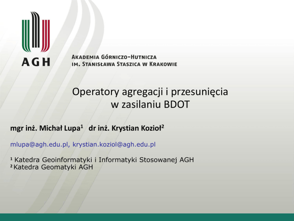 Operatory agregacji i przesunięcia w zasilaniu BDOT mgr inż. Michał Lupa1 dr inż. Krystian Kozioł2 [email protected], [email protected] 1 Katedra Geoinformatyki i Informatyki Stosowanej AGH Geomatyki AGH 2 Katedra Plan prezentacji o Operator przesunięcia obiektów o Klasyfikacja obiektów o Podział łączenia obiektów o Omówienie algorytmu o Agregacja obiektów o Przykłady RULE-BASED QUERY OPTIMIZATION IN SPATIAL DATABASES Operator przesunięcia obiektów Operator przesunięcia (łączenia) obiektów warstwy zabudowy jest jednym z najważniejszych algorytmów wchodzących w skład procedur zasilających BDOT danymi pochodzącymi z baz danych o wyższej dokładności danych (odpowiadającej skalom 1:500 – 1:5000) RULE-BASED QUERY OPTIMIZATION IN SPATIAL DATABASES Algorytm ten jest narzędziem generalizacji, które może zostać udostępnione jako usługa Web Generalization Service Operator przesunięcia obiektów Klasyfikacja obiektów Podział łączenia obiektów Prof. Chrobak (Chrobak 2012) przedstawił podział operacji łączenia na liniowe oraz punktowe. Podział ten w niniejszej pracy został zmodyfikowany i rozwinięty. W ramach zagadnienia łączenia liniowego, wyróżnione zostały dwa jego warianty: • łączenie liniowe równoległe • łączenie liniowe nierównoległe Koncepcja łączenia punktowego zaś została rozwinięta o dodatkowe warunki, które muszą spełnić obiekty. Łączenie liniowe równoległe Łączenie liniowe nierównoległe Łączenie liniowe nierównoległe Łączenie punktowe Łączenie punktowe Wierzchołek VB1 budynku B1 o klasie wyższej, rzutowany jest prostokątnie na krawędź budynku B2 (punkt Np). Powstały w ten sposób wektor NNp jest następnie rzutowany na wektor NVB1, budynku B1, a punkt VB1 staje się węzłem łączącym budynki B1 oraz B2. Łączenie punktowe Budynki sąsiadujące, otrzymane w wyniku działania operatora łączenia punktowego. Wejście: Zabudowa BDOT Nie Czy budynek jest wyższej klasy niż jego sąsiad? Nie Tak Tak Czy bufor tbf1 zawiera krawędź wybranego budynku wejściowego? Znajdź najbliżej Nie położoną krawędź budynku sąsiedniego. Tak Wyznaczenie części wspólnej tibf12, buforów tymczasowych Złączenie oraz agregacja budynku sąsiedniego oraz części wspólnej buforów tib12. Następnie zakończenie działania operatora tbf1 i tbf2ymczasowych Tak tbf1 oraz tbf2. Nie Znajdź krawędzie przecięte i wyznacz tą, która, znajduje się najbliżej. Nie koniec Czy bufor tbf1 przecina krawędź wybranego budynku? Tak Wyznaczenie części wspólnej tibf12 , buforów tymczasowych tbf1 oraz tbf2. Agregacja obiektów Operator agregacji pozwala na połączenie sąsiednich poligonów w jeden, w przypadku kiedy ich wspólna krawędź posiada długość nie mniejszą niż norma dla obiektów antropogenicznych (Chrobak 2012). Powstały w ten sposób budynek posiada atrybuty obiektu składowego, który został sklasyfikowany jako najważniejszy Budynki powstałe w wyniku agregacji, które spełniają kryterium sąsiedztwa, poddawane są działaniu operatora przesunięcia. Przykłady Wejście: obiekty wejściowe przed działaniem operatora przesunięcia Przykłady Wyjście: obiekty otrzymane w wyniku działania operatora przesunięcia Przykłady Wejście: obiekty zabudowy przed procesem agregacji Przykłady Wyjście: obiekty zabudowy będące wynikiem działania operatora agregacji Dziękuję za uwagę