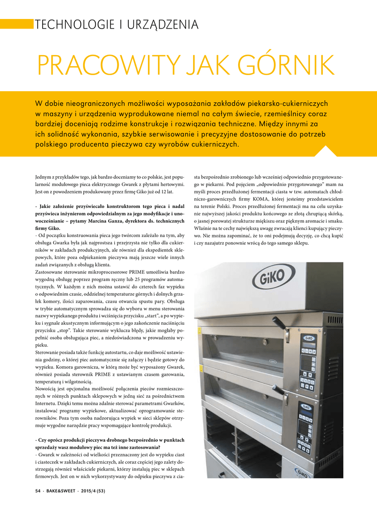technologie i urządzenia Pracowity jak górnik W dobie nieograniczonych możliwości wyposażania zakładów piekarsko-cukierniczych w maszyny i urządzenia wyprodukowane niemal na całym świecie, rzemieślnicy coraz bardziej doceniają rodzime konstrukcje i rozwiązania techniczne. Między innymi za ich solidność wykonania, szybkie serwisowanie i precyzyjne dostosowanie do potrzeb polskiego producenta pieczywa czy wyrobów cukierniczych. Jednym z przykładów tego, jak bardzo doceniamy to co polskie, jest popularność modułowego pieca elektrycznego Gwarek z płytami hertowymi. Jest on z powodzeniem produkowany przez firmę Giko już od 12 lat. - Jakie założenie przyświecało konstruktorom tego pieca i nadal przyświeca inżynierom odpowiedzialnym za jego modyfikacje i unowocześnianie – pytamy Marcina Ganza, dyrektora ds. technicznych firmy Giko. - Od początku konstruowania pieca jego twórcom zależało na tym, aby obsługa Gwarka była jak najprostsza i przejrzysta nie tylko dla cukierników w zakładach produkcyjnych, ale również dla ekspedientek sklepowych, które poza odpiekaniem pieczywa mają jeszcze wiele innych zadań związanych z obsługą klienta. Zastosowane sterowanie mikroprocesorowe PRIME umożliwia bardzo wygodną obsługę poprzez program ręczny lub 25 programów automatycznych. W każdym z nich można ustawić do czterech faz wypieku o odpowiednim czasie, oddzielnej temperaturze górnych i dolnych grzałek komory, ilości zaparowania, czasu otwarcia spustu pary. Obsługa w trybie automatycznym sprowadza się do wyboru w menu sterowania nazwy wypiekanego produktu i wciśnięcia przycisku „start”, a po wypieku i sygnale akustycznym informującym o jego zakończenie naciśnięciu przycisku „stop”. Takie sterowanie wyklucza błędy, jakie mogłaby popełnić osoba obsługująca piec, a niedoświadczona w prowadzeniu wypieku. Sterowanie posiada także funkcję autostartu, co daje możliwość ustawienia godziny, o której piec automatycznie się załączy i będzie gotowy do wypieku. Komora garownicza, w którą może być wyposażony Gwarek, również posiada sterownik PRIME z ustawianym czasem garowania, temperaturą i wilgotnością. Nowością jest opcjonalna możliwość połączenia pieców rozmieszczonych w różnych punktach sklepowych w jedną sieć za pośrednictwem Internetu. Dzięki temu można zdalnie sterować parametrami Gwarków, instalować programy wypiekowe, aktualizować oprogramowanie sterowników. Poza tym osoba nadzorująca wypiek w sieci sklepów otrzymuje wygodne narzędzie pracy wspomagające kontrolę produkcji. - Czy oprócz produkcji pieczywa drobnego bezpośrednio w punktach sprzedaży wasz modułowy piec ma też inne zastosowania? - Gwarek w zależności od wielkości przeznaczony jest do wypieku ciast i ciasteczek w zakładach cukierniczych, ale coraz częściej jego zalety dostrzegają również właściciele piekarni, którzy instalują piec w sklepach firmowych. Jest on w nich wykorzystywany do odpieku pieczywa z cia54 · BAKE&SWEET · 2015/4 (53) sta bezpośrednio zrobionego lub wcześniej odpowiednio przygotowanego w piekarni. Pod pojęciem „odpowiednio przygotowanego” mam na myśli proces przedłużonej fermentacji ciasta w tzw. automatach chłodniczo-garowniczych firmy KOMA, której jesteśmy przedstawicielem na terenie Polski. Proces przedłużonej fermentacji ma na celu uzyskanie najwyższej jakości produktu końcowego ze złotą chrupiącą skórką, o jasnej porowatej strukturze miękiszu oraz pięknym aromacie i smaku. Właśnie na te cechy największą uwagę zwracają klienci kupujący pieczywo. Nie można zapominać, że to oni podejmują decyzję, co chcą kupić i czy nazajutrz ponownie wrócą do tego samego sklepu. - Gwarek jest piecem modułowym. Z ilu komór może być zbudowany? - Maksymalnie z pięciu. Oczywiście liczba modułów oraz dodatkowe wyposażenie pieca są indywidualnie dopasowywane do potrzeb użytkownika. Podobnie jak wielkość komór wypiekowych, z jakich piec będzie zbudowany. Firma Giko produkuje cztery warianty modułów o szerokościach i głębokościach: 120 i 80 cm, 80 i 60 cm, 60 i 80 cm oraz 60 i 40 cm. Jak widać po tych wymiarach, komory są przystosowane do blach piekarniczych 60 x 40 cm. W zależności od rosnących potrzeb produkcji zawsze można piec rozbudować dodając kolejne moduły. Mają one niezależne sterowanie, co oznacza, że w każdej chwili można wyłączyć część niezaładowanych komór lub ogrzewanie aparatów parowniczych, co w efekcie zmniejsza zużycie energii. Dodam jeszcze, że oprócz pieczenia na blachach można też wypiekać wyroby bezpośrednio na płytach hertowych. Bieżącą obserwację produkcji umożliwiają przezroczyste drzwiczki wykonane ze szkła hartowanego oraz halogeny, które dokładnie oświetlają wnętrza komór Gwarka. uniferm b pion - Skąd w ogóle taka nazwa pieca? Określenie to nie jest przecież związane z piekarstwem lub cukiernictwem. - Firma Giko, która jest producentem pieca, ma siedzibę w Tarnowskich Górach, w dzielnicy Repty Śląskie. Historia tego miasta związana jest z wydobyciem rud srebra, ołowiu i cynku, czym trudnili się górnicy zwani kiedyś właśnie gwarkami. Obecnie kopalnia srebra już nie funkcjonuje i jest dostępna tylko dla turystów. Chcieliśmy jednak nawiązać do tradycji naszego regionu i z sentymentu nazwaliśmy piec Gwarkiem. - Spółka Giko to nie tylko producent wspomnianego Gwarka… - To prawda. Nasza firma znana jest na rynku piekarsko-cukierniczym już od wielu lat, a główna działalność Giko jest związana z montażem i serwisem pieców oraz maszyn dla branży. Mowa o urządzeniach uznanych zachodnich firm, takich jak między innymi Heuft – producent termo-olejowych instalacji piecowych, Koma – specjalizująca się w technikach chłodzenia czy Daxner – ekspert od systemów silosowych. Z biegiem czasu nabraliśmy wiele doświadczenia i uznaliśmy, że jeste