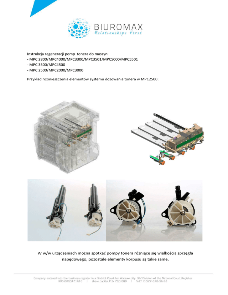 Instrukcja regeneracji pomp tonera do maszyn: - MPC 2800/MPC4000/MPC3300/MPC3501/MPC5000/MPC5501 - MPC 3500/MPC4500 - MPC 2500/MPC2000/MPC3000 Przykład rozmieszczenia elementów systemu dozowania tonera w MPC2500: W w/w urządzeniach można spotkać pompy tonera różniące się wielkością sprzęgła napędowego, pozostałe elementy korpusu są takie same. Aby zregenerować oba typy pomp należy zaopatrzyć się w gumowy element (W523-2110) nasz kod produktu KRICN004QCMBT. Po wymontowaniu pompy z urządzenia należy ją dokładnie oczyścić z pozostałości tonera. Korpus pompy zablokowany jest za pomocą trzech zaczepów. Przygotuj trzy blaszki szczelinomierza, które posłużą do uwolnienia zaczepów. Aby zapewnić prawidłowe odblokowanie zaczepów użyj blaszek szczelinomierza o grubości 0,45-0,50-0,55 mm. Rozmieszczenie zaczepów. Wsuń blaszki szczelinomierza pomiędzy korpus. Blaszki uniosą obudowę, co spowoduje uwolnienie zaczepów. Chwyć korpus pompy w sposób pokazany na zdjęciu i pchnij kciukiem ku górze. Rozłącz części pompy. Zsuń gumowy element. Wypakuj nowy element gumowy pompy i usuń dokładnie żółtą powłokę zabezpieczającą. Na czystą i suchą powierzchnię kołnierza wewnętrznego nałóż warstwę uszczelniacza silikonowego i rozprowadź po całym obwodzie. Tak przygotowany element gumowy nałóż na metalowy ślimak i wsuń ponownie obudowę zewnętrzną. Sprawdź czy wszystkie trzy zaczepy są dokładnie zamknięte. Tak przygotowaną pompę możesz ponownie zamontować w urządzeniu. Prace związane z wymianą elementu gumowego najlepiej wykonywać w warunkach serwisowych. Do uszczelnienia możesz użyć dowolnego ogólnie dostępnego uszczelniacza silikonowego. Sprawdź na opakowaniu czas schnięcia powłoki. W naszym przykładzie użyto silikonu o następujących parametrach. • Tempo utwardzenia w temperaturze 20 ºC i wilgotności względnej powietrza 65% warstwa grubości 1,5mm / 24 godziny. • Czas tworzenia się nośnika 7 min. • System utwardzania – polimeryzacja. • Moduł elastyczności 0,35 N/mm2 (DIN 53504) • Wskazania BHP I PPOŻ. Szczegółowe informacje zawarte są w karcie technicznej.