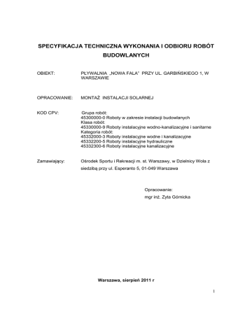 SPECYFIKACJA TECHNICZNA WYKONANIA I ODBIORU ROBÓT BUDOWLANYCH OBIEKT: PŁYWALNIA „NOWA FALA” PRZY UL. GARBIŃSKIEGO 1, W WARSZAWIE OPRACOWANIE: MONTAŻ INSTALACJI SOLARNEJ KOD CPV: Grupa robót: 45300000-0 Roboty w zakresie instalacji budowlanych Klasa robót: 45330000-9 Roboty instalacyjne wodno-kanalizacyjne i sanitarne Kategoria robót: 45332000-3 Roboty instalacyjne wodne i kanalizacyjne 45332200-5 Roboty instalacyjne hydrauliczne 45332300-6 Roboty instalacyjne kanalizacyjne Zamawiający: Ośrodek Sportu i Rekreacji m. st. Warszawy, w Dzielnicy Wola z siedzibą przy ul. Esperanto 5, 01-049 Warszawa Opracowanie: mgr inż. Zyta Górnicka Warszawa, sierpień 2011 r 1 SPECYFIKACJA TECHNICZNA WYKONANIA I ODBIORU ROBÓT W ZAKRESIE INSTALACJI SOLARNEJ SPIS TREŚCI 1. WSTĘP 1.1. Przedmiot Szczegółowej Specyfikacji Technicznej 1.2. Zakres stosowania Szczegółowej Specyfikacji Technicznej 1.3 Zakres robót objętych Szczegółową Specyfikacją Techniczną 1.4. Ogólne wymagania 2. MATERIAŁY 2.1. Kolektory i przewody 2.2 Przewody 2.3. Pompy obiegowe 2.4. Armatura 2.5. Izolacja termiczna 3. SPRZĘT 4. WYKONANIE ROBÓT 4.1 Montaż rurociągów 4.2 Montaż kolektorów słonecznych 4.3 Montaż stacji solarnej i regulatora 4.4 Montaż armatury i urządzeń kontrolno-pomiarowych 4.5 Badania i uruchomienie instalacji solarnej 4.6 Wykonanie izolacji ciepłochronnej 5. KONTROLA JAKOŚCI ROBÓT 6. ODBIÓR ROBÓT 7. OBMIAR ROBÓT 8. PRZEPISY ZWIĄZANE 2 1. WSTĘP 1.1. Przedmiot Szczegółowej Specyfikacji Technicznej Przedmiotem niniejszej specyfikacji technicznej są wymagania dotyczące wykonania i odbioru robót w zakresie montażu instalacji solarnej w istniejącym budynku Pływalni krytej „Nowa Fala”, przy ul. Garbińskiego 1, w Warszawie. 1.2. Zakres stosowania Szczegółowej Specyfikacji Technicznej Specyfikacja techniczna jest stosowana jako dokument przetargowy i kontraktowy przy zleceniu i realizacji robót wymienionych w punkcie 1.1. 1.3 Zakres robót objętych Szczegółową Specyfikacją Techniczną Roboty, których dotyczy specyfikacja, obejmują wszystkie czynności umożliwiające i mające na celu wykonanie instalacji płaskich kolektorów słonecznych. Niniejsza specyfikacja techniczna związana jest z wykonaniem niżej wykonanych robót: 2 -montaż płaskich kolektorów słonecznych o łącznej powierzchni absorbera 182m na dachu budynku, wraz z orurowaniem na dachu budynku Pływalni krytej. -montaż układu podgrzewu wody w basenie i ciepłej wody użytkowej, w pomieszczeniach technicznych. -prace odbiorowe i rozruchowe montowanej instalacji. 1.4. Ogólne wymagania Wykonawca robót jest odpowiedzialny za realizację robót zgodnie z dokumentacją projektową, specyfikacjami technicznymi, poleceniami nadzoru inwestycyjnego i Wymaganiami Technicznymi, w przypadku działań nie określonych w projekcie technicznym. Odstępstwa od projektu mogą dotyczyć jedynie zastąpienia zaprojektowanych materiałów – w przypadku niemożliwości ich uzyskania – przez materiały lub elementy o nie gorszych parametrach. Wszelkie zmiany i odstępstwa od zatwierdzonej dokumentacji technicznej nie mogą powodować obniżenia wartości funkcjonalnych i użytkowych przygotowania ciepłej wody, a jeżeli dotyczą zamiany materiałów i elementów określonych w dokumentacji na inne, nie mogą powodować zmniejszenia trwałości eksploatacyjnej. 3 2. MATERIAŁY Do wykonania mogą być stosowane wyroby producentów krajowych i zagranicznych. Wszystkie materiały użyte do wykonania instalacji muszą odpowiadać normom. Odbiór techniczny materiałów powinien być dokonany według wymagań i w sposób określony normami. Parametry materiałów nie mogą mieć gorszych parametrów niż zastosowane w projekcie 2.1. Kolektory Zastosować kolektory słoneczne płaskie cieczowe działające, w liczbie 84 szt. 2 Powierzchnia czynna łączna kolektorów musi być nie mniejsza niż 183m . Parametry kolektora nie mogą być mniejsze niż: sprawność optyczna kolektora ηo > 82,3% Współczynniki strat nie mogą być większe niż: a1 < 2,097 [W/(m²K)] a2 < 0,0135 [W/(m²K)] Grubość szyby solarnej nie mniejsza niż 4mm Parametry kolektorów powinny być potwierdzone badaniami przez placówkę odpowiednią do tych badań. 2.2 Przewody Przewody obiegu grzewczego kolektorów słonecznych pomiędzy kolektorami a wymiennikami ciepła powinny być wykonane z rur miedzianych. Przewody obiegu zimnej i ciepłej wody oraz cyrkulacji instalacji obiegu pośredniego wykonać z polipropylenu firmy Wavin Bor 2.3. Pompy obiegowe W obiegu glikolowym i pośrednim stosować pompy bezdławicowe o napięciu znamionowym 230V 2.4. Armatura Na przewodach obiegu glikolowego zastosować armaturę odporną na zastosowany środek antyzamrożeniowy, o parametrach maksymalnych PN 6 i 120˚C. Na przewodach obiegu pośredniego zastosować armaturę PN10 i 100˚C Do zabezpieczenia instalacji w instalacji glikolowej i po stronie obiegu pośredniego 4 zastosować membranowe zawory bezpieczeństwa posiadające dopuszczenie i certyfikaty zgodnie z obowiązującymi przepisami Dozoru technicznego. 3. SPRZĘT Wykonawca jest zobowiązany do używania jedynie takiego sprzętu, który nie spowoduje niekorzystnego wpływu na jakość wykonanych robót, zarówno w miejscu tych robót, jak też przy wykonaniu czynności pomocniczych, oraz w czasie transportu, załadunku i wyładunku materiałów. 4. WYKONANIE ROBÓT 4.1 Montaż rurociągów Rurociągi łączone będą zgodnie z Wymaganiami Technicznymi COBRTI INSTAL Rurociągi w pomieszczeniach technicznych należy prowadzić przy ściankach lub przy stropie lub mocować na konstrukcjach wsporczych. Wszystkie podstawowe urządzenia powinny być montowane w sposób rozłączny umożliwiający i demontaż i wymianę poszczególnych elementów instalacji bez konieczności demontażu innych urządzeń. Przejścia przez przegrody wykonać w tulejach ochronnych zgodnie z Wymaganiami Technicznymi CO