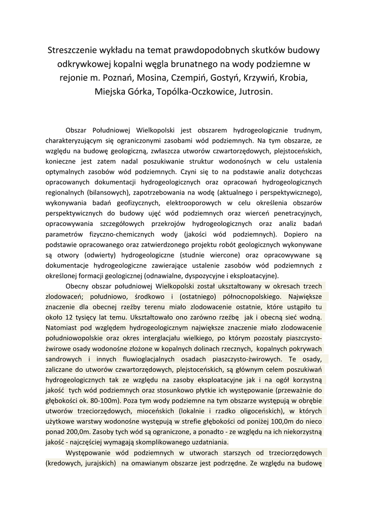 Streszczenie wykładu na temat prawdopodobnych skutków budowy odkrywkowej kopalni węgla brunatnego na wody podziemne w rejonie m. Poznań, Mosina, Czempiń, Gostyń, Krzywiń, Krobia, Miejska Górka, Topólka-Oczkowice, Jutrosin. Obszar Południowej Wielkopolski jest obszarem hydrogeologicznie trudnym, charakteryzującym się ograniczonymi zasobami wód podziemnych. Na tym obszarze, ze względu na budowę geologiczną, zwłaszcza utworów czwartorzędowych, plejstoceńskich, konieczne jest zatem nadal poszukiwanie struktur wodonośnych w celu ustalenia optymalnych zasobów wód podziemnych. Czyni się to na podstawie analiz dotychczas opracowanych dokumentacji hydrogeologicznych oraz opracowań hydrogeologicznych regionalnych (bilansowych), zapotrzebowania na wodę (aktualnego i perspektywicznego), wykonywania badań geofizycznych, elektrooporowych w celu określenia obszarów perspektywicznych do budowy ujęć wód podziemnych oraz wierceń penetracyjnych, opracowywania szczegółowych przekrojów hydrogeologicznych oraz analiz badań parametrów fizyczno-chemicznych wody (jakości wód podziemnych). Dopiero na podstawie opracowanego oraz zatwierdzonego projektu robót geologicznych wykonywane są otwory (odwierty) hydrogeologiczne (studnie wiercone) oraz opracowywane są dokumentacje hydrogeologiczne zawierające ustalenie zasobów wód podziemnych z określonej formacji geologicznej (odnawialne, dyspozycyjne i eksploatacyjne). Obecny obszar południowej Wielkopolski został ukształtowany w okresach trzech zlodowaceń; południowo, środkowo i (ostatniego) północnopolskiego. Największe znaczenie dla obecnej rzeźby terenu miało zlodowacenie ostatnie, które ustąpiło tu około 12 tysięcy lat temu. Ukształtowało ono zarówno rzeźbę jak i obecną sieć wodną. Natomiast pod względem hydrogeologicznym największe znaczenie miało zlodowacenie południowopolskie oraz okres interglacjału wielkiego, po którym pozostały piaszczystożwirowe osady wodonośne złożone w kopalnych dolinach rzecznych, kopalnych pokrywach sandrowych i innych fluwioglacjalnych osadach piaszczysto-żwirowych. Te osady, zaliczane do utworów czwartorzędowych, plejstoceńskich, są głównym celem poszukiwań hydrogeologicznych tak ze względu na zasoby eksploatacyjne jak i na ogół korzystną jakość tych wód podziemnych oraz stosunkowo płytkie ich występowanie (przeważnie do głębokości ok. 80-100m). Poza tym wody podziemne na tym obszarze występują w obrębie utworów trzeciorzędowych, mioceńskich (lokalnie i rzadko oligoceńskich), w których użytkowe warstwy wodonośne występują w strefie głębokości od poniżej 100,0m do nieco ponad 200,0m. Zasoby tych wód są ograniczone, a ponadto - ze względu na ich niekorzystną jakość - najczęściej wymagają skomplikowanego uzdatniania. Występowanie wód podziemnych w utworach starszych od trzeciorzędowych (kredowych, jurajskich) na omawianym obszarze jest podrzędne. Ze względu na budowę geologiczną podłoża pod trzeciorzędowego (poniżej 300-350m), niewielkie wydajności, niekorzystną jakość wody (zasolenie i barwa) prowadzenie prac poszukiwawczych jest ekonomicznie i technicznie nieuzasadnione. Poza tym struktury hydrogeologiczne na tym obszarze są często dziedzictwem budowy geologicznej utworów starszych od trzeciorzędowych, w których stwierdza się nieraz znaczne zaburzenia tektoniczne (m. in. uskoki). Między innymi, poprzez rejon wymieniony w tytule przebiega strefa dyslokacyjna (tektoniczna) Szamotuły – Oleśnica, stanowiąca tzw. rowy tektoniczne, nazywane lokalnie od miejscowości przez które przebiega, np. rów Poznania, Czempinia, Krobi, Oczkowice itd. itp. W omawianej strefie wierceniami poszukiwawczymi, złożowymi wykonywanymi w latach sześćdziesiątych i późniejszych ubiegłego wieku wykryto zaleganie złóż węgla brunatnego. Złoża te występują na głębokości od około 150-180m do ponad 220-250m. W różnych okresach określano zasoby tych złóż, przewidując ewentualną ich eksploatację metodą odkrywkową. Ogólnie panuje przekonanie, że złoża te są poza bilansowe lub przeszkodą jest ich usytuowanie w obszarze zurbanizowanym, obszarach ochronnych lub na obszarach udokumentowanych zasobów wód podziemnych (Mosina – ujęcie dla aglomeracji poznańskiej). Analiza dotychczasowego rozpoznania przebiegu znaczących dla zaopatrzenia ludności w wodę pitną struktur wodonośnych wykazuje, że w przypadku eksploatacji odkrywkowej węgla brunatnego konieczne będzie prowadzenie odwadniania tej odkrywki, co spowoduje stopniowe niszczenie najważniejszych rozpoznanych dotychczas struktur wodonośnych. Na mapach w skali 1 : 100 000 orientacyjnie przedstawiono przebieg rowów tektonicznych oraz przebieg najważniejszych struktur hydrogeologicznych na tym obszarze, co zobrazowano też na szczegółowych przekrojach geologicznych (złożowych) oraz hydrogeologicznych. W podsumowaniu stwierdzono, że odkrywkowa eksploatacja złóż węgla brunatnego i jej odwadnianie najprawdopodobniej spowoduje znaczące zmiany zarówno warunków hydrogeologicznych jak i hydrologicznych (wody powierzchniowe) na znacznym obszarze, co w konsekwencji spowoduje nawet dramatyczną sytuację w zaopatrzeniu w wodę zarówno ludności, rolnictwa, przemysłu jak i zakładów użyteczności publicznej. Przy tym trzeba pokreślić, że na tym terenie nie istnieje żaden alternatywny sposób zaopatrzenia w wodę pitną i dla innych potrzeb. Poza tym uczestnicy spotkania wyrazili potrzebę szczegółowego opracowania hydrogeologicznego obejmującego podsumowanie dotychczasowego rozpoznania hydrogeologicznego struktur wodonośnych i ich przebiegu (doliny kopalne) i innych obszarów wodonośnych, uaktualnienia ilości zasobów eksploatacyjnych w odniesieniu do obowiązującego stanu prawnego (zasoby eksploatacyjne w odniesieniu do produkcji rocznej zakładu odpowiedzialnego za gospodarkę wodno-ściekową, a nie dotyczą