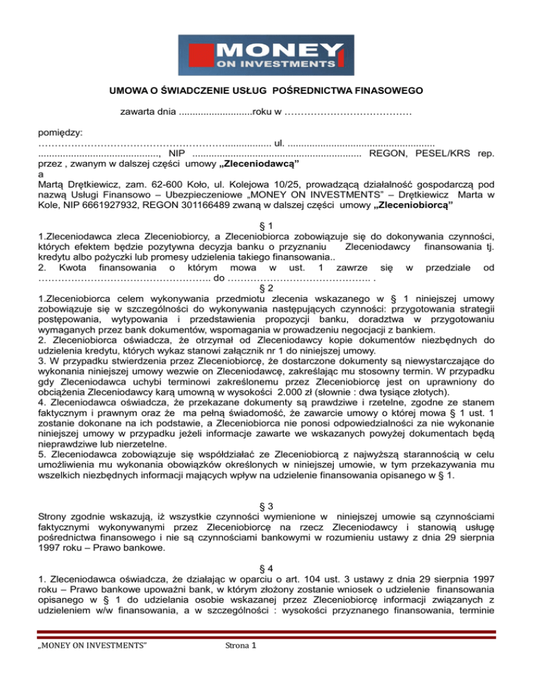 UMOWA O ŚWIADCZENIE USŁUG POŚREDNICTWA FINASOWEGO zawarta dnia ...........................roku w ………………………………… pomiędzy: …………………………………………………................. ul. ...................................................... ............................................, NIP .............................................................. REGON, PESEL/KRS rep. przez , zwanym w dalszej części umowy „Zleceniodawcą” a Martą Drętkiewicz, zam. 62-600 Koło, ul. Kolejowa 10/25, prowadzącą działalność gospodarczą pod nazwą Usługi Finansowo – Ubezpieczeniowe „MONEY ON INVESTMENTS” – Drętkiewicz Marta w Kole, NIP 6661927932, REGON 301166489 zwaną w dalszej części umowy „Zleceniobiorcą” §1 1.Zleceniodawca zleca Zleceniobiorcy, a Zleceniobiorca zobowiązuje się do dokonywania czynności, których efektem będzie pozytywna decyzja banku o przyznaniu Zleceniodawcy finansowania tj. kredytu albo pożyczki lub promesy udzielenia takiego finansowania.. 2. Kwota finansowania o którym mowa w ust. 1 zawrze się w przedziale od …………………………………………….. do …………………………………….. . §2 1.Zleceniobiorca celem wykonywania przedmiotu zlecenia wskazanego w § 1 niniejszej umowy zobowiązuje się w szczególności do wykonywania następujących czynności: przygotowania strategii postępowania, wytypowania i przedstawienia propozycji banku, doradztwa w przygotowaniu wymaganych przez bank dokumentów, wspomagania w prowadzeniu negocjacji z bankiem. 2. Zleceniobiorca oświadcza, że otrzymał od Zleceniodawcy kopie dokumentów niezbędnych do udzielenia kredytu, których wykaz stanowi załącznik nr 1 do niniejszej umowy. 3. W przypadku stwierdzenia przez Zleceniobiorcę, że dostarczone dokumenty są niewystarczające do wykonania niniejszej umowy wezwie on Zleceniodawcę, zakreślając mu stosowny termin. W przypadku gdy Zleceniodawca uchybi terminowi zakreślonemu przez Zleceniobiorcę jest on uprawniony do obciążenia Zleceniodawcy karą umowną w wysokości 2.000 zł (słownie : dwa tysiące złotych). 4. Zleceniodawca oświadcza, że przekazane dokumenty są prawdziwe i rzetelne, zgodne ze stanem faktycznym i prawnym oraz że ma pełną świadomość, że zawarcie umowy o której mowa § 1 ust. 1 zostanie dokonane na ich podstawie, a Zleceniobiorca nie ponosi odpowiedzialności za nie wykonanie niniejszej umowy w przypadku jeżeli informacje zawarte we wskazanych powyżej dokumentach będą nieprawdziwe lub nierzetelne. 5. Zleceniodawca zobowiązuje się współdziałać ze Zleceniobiorcą z najwyższą starannością w celu umożliwienia mu wykonania obowiązków określonych w niniejszej umowie, w tym przekazywania mu wszelkich niezbędnych informacji mających wpływ na udzielenie finansowania opisanego w § 1. §3 Strony zgodnie wskazują, iż wszystkie czynności wymienione w niniejszej umowie są czynnościami faktycznymi wykonywanymi przez Zleceniobiorcę na rzecz Zleceniodawcy i stanowią usługę pośrednictwa finansowego i nie są czynnościami bankowymi w rozumieniu ustawy z dnia 29 sierpnia 1997 roku – Prawo bankowe. §4 1. Zleceniodawca oświadcza, że działając w oparciu o art. 104 ust. 3 ustawy z dnia 29 sierpnia 1997 roku – Prawo bankowe upoważni bank, w którym złożony zostanie wniosek o udzielenie finansowania opisanego w § 1 do udzielania osobie wskazanej przez Zleceniobiorcę informacji związanych z udzieleniem w/w finansowania, a w szczególności : wysokości przyznanego finansowania, terminie „MONEY ON INVESTMENTS” Strona 1 uruchomienia finansowania, jego oprocentowania, wysokości prowizji, przyczynach odmowy udzielenia finansowania, zgodnie z wzorem stanowiącym załącznik nr 2 do niniejszej umowy. 2. Zleceniobiorca zobowiązuje się do tego, że zarówno on jaki i wskazana przez niego osoba o której mowa w ust. 1 zobowiązania będzie do zachowania pełnej tajemnicy co do uzyskanych informacji. §5 Zleceniobiorca i osoby działające na jego rzecz zobowiązane są przy wykonywaniu niniejszej umowy do zachowania pełnej tajemnicy, co do czynności i działań podjętych celem wykonania niniejszej umowy oraz zobowiązane są do przestrzegania przepisów ustawy z dnia 29 sierpnia 1997 r. o ochronie danych osobowych. 1. 2. 3. 4. 1. 2. 1. §6 Za wykonanie czynności określonych w niniejszej umowie Zleceniobiorcy przysługuje wynagrodzenie prowizyjne w wysokości ………. % udzielonego Zleceniodawcy finansowania. Przez udzielenie finansowania strony rozumieją podjęcie przez Bank pozytywnej decyzji o dzieleniu finansowania lub promesy takiego finansowania na rzecz Zleceniodawcy . Zleceniodawca zobowiązuje się do zapłaty wynagrodzenia opisanego w ust. 1 w terminie 2 dni roboczych od daty uznania rachunku bankowego wskazanego w zawartej ze Zleceniodawcą umowie o finansowanie, jednakże nie później niż w terminie 30 dni od dnia podjęcia przez bank pozytywnej decyzji o finansowaniu lub udzielenia promesy takiego finansowania. Wynagrodzenie zostanie wpłacone przelewem na rachunek bankowy Zleceniobiorcy nr ……………………………………………………………………………………………………. Strony zgodnie oświadczają, że zapłata wynagrodzenia o której mowa w ust. 3 jest zakończeniem wykonania usługi i stanowi podstawę do wystawienia przez Zleceniobiorcę faktury, na co Zleceniodawca wyraża zgodę. §7 W przypadku nieudzielenia Zleceniodawcy finansowania, z przyczyn leżących po jego stronie, przez które strony rozumieją w szczególności przekazanie Zleceniobiorcy nieprawdziwych lub nierzetelnych informacji Zleceniobiorcy przysługuje kara umowna w wysokości 100 % prowizji określonej w § 6 ust. 1 naliczonej od maksymalnej kwoty finansowania o jaką zamierzał wnioskować Zleceniodawca zgodnie z oświadczeniem złożonym w § 1ust. 2 niniejszej umowy. Roszczenie o zapłatę kary um