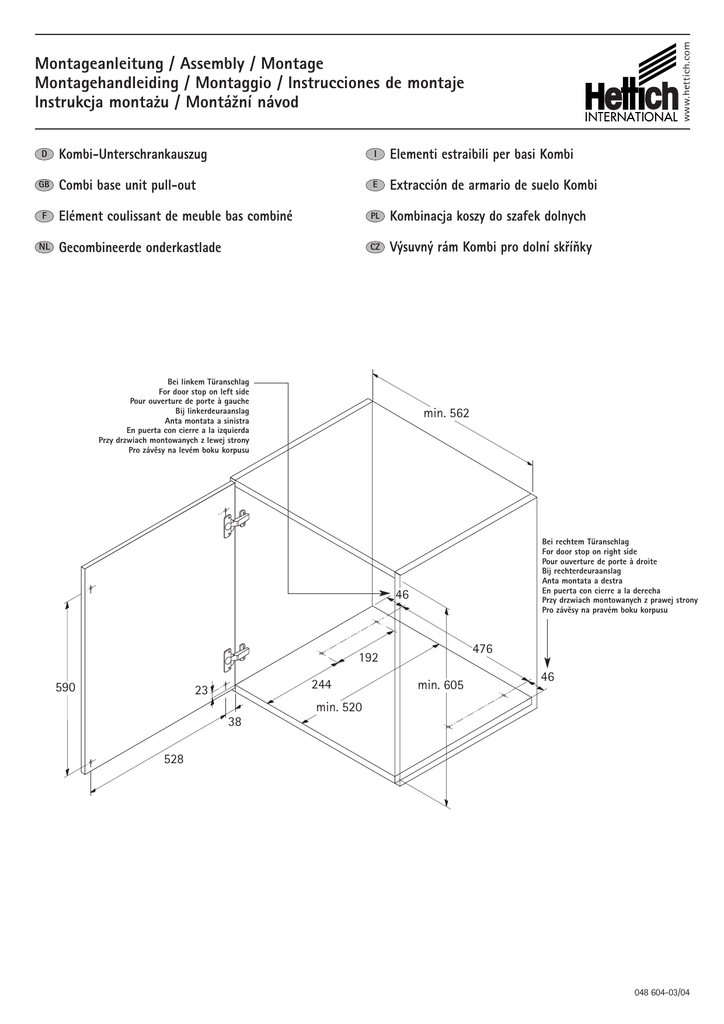www.hettich.com Montageanleitung / Assembly / Montage Montagehandleiding / Montaggio / Instrucciones de montaje Instrukcja montażu / Montážní návod D GB F NL Kombi-Unterschrankauszug I Elementi estraibili per basi Kombi Combi base unit pull-out E Extracción de armario de suelo Kombi Elément coulissant de meuble bas combiné PL Kombinacja koszy do szafek dolnych Gecombineerde onderkastlade CZ Výsuvný rám Kombi pro dolní skříňky Bei linkem Türanschlag For door stop on left side Pour ouverture de porte à gauche Bij linkerdeuraanslag Anta montata a sinistra En puerta con cierre a la izquierda Przy drzwiach montowanych z lewej strony Pro závěsy na levém boku korpusu min. 562 Bei rechtem Türanschlag For door stop on right side Pour ouverture de porte à droite Bij rechterdeuraanslag Anta montata a destra En puerta con cierre a la derecha Przy drzwiach montowanych z prawej strony Pro závěsy na pravém boku korpusu 46 476 192 590 244 23 min. 605 46 min. 520 38 528 048 604-03/04 048 604-03/04