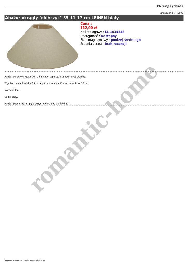 Informacje o produkcie Utworzono 02-03-2017 Abażur okrągły "chińczyk" 35-11-17 cm LEINEN biały Cena : 112,00 zł e Nr katalogowy : LL-1034348 Dostępność : Dostępny Stan magazynowy : poniżej średniego Średnia ocena : brak recenzji m Abażur okrągły w kształcie "chińskiego kapelusza" z naturalnej tkaniny. Wymiar: dolna średnica 35 cm x górna średnica 11 cm x wysokość 17 cm. Materiał: len. ho Kolor: biały. ro m an ti c- Abażur pasuje na lampę o dużym gwincie do żarówki E27. Wygenerowano w programie www.oscGold.com