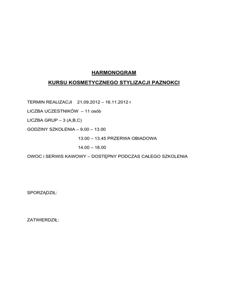 HARMONOGRAM KURSU KOSMETYCZNEGO STYLIZACJI PAZNOKCI TERMIN REALIZACJI 21.09.2012 – 16.11.2012 r LICZBA UCZESTNIKÓW – 11 osób LICZBA GRUP – 3 (A,B,C) GODZINY SZKOLENIA – 9.00 – 13.00 13.00 – 13.45 PRZERWA OBIADOWA 14.00 – 18.00 OWOC i SERWIS KAWOWY – DOSTĘPNY PODCZAS CAŁEGO SZKOLENIA SPORZĄDZIŁ: ZATWIERDZIŁ: ROZKŁAD ZAJĘĆ WEDŁUG GRUP GRUPA A data zajęć godziny zajęć 21.09.2012 28.09.2012 05.10.2012 12.10.2012 19.10.2012 26.10.2012 09.11.2012 16.11.2012 9.00-18.00 9.00-13.00 14.00-18.00 9.00-13.00 14.00-18.00 9.00-16.00 zakres teoria cz. praktyczna cz. praktyczna cz. praktyczna cz. praktyczna teoria i praktyka E SUMA liczba godzin (60min) 8 4 4 4 4 6 (1+5) przerwa obiadowa 13.00-13.45 13.00-13.45 13.00-13.45 13.00-13.45 13.00-13.45 13.00-13.45 30 GRUPA B data zajęć godziny zajęć 21.09.2012 28.09.2012 05.10.2012 12.10.2012 19.10.2012 26.10.2012 09.11.2012 16.11.2012 9.00-18.00 14.00-18.00 9.00-13.00 14.00-18.00 9.00-13.00 9.00-16.00 zakres teoria cz. praktyczna cz. praktyczna cz. praktyczna cz. praktyczna teoria i praktyka E SUMA liczba godzin (60min) 8 4 4 4 4 6 (1+5) przerwa obiadowa 13.00-13.45 13.00-13.45 13.00-13.45 13.00-13.45 13.00-13.45 30 GRUPA C data zajęć godziny zajęć 21.09.2012 28.09.2012 05.10.2012 12.10.2012 19.10.2012 26.10.2012 09.11.2012 16.11.2012 9.00-18.00 9.00-13.00 14.00-18.00 9.00-13.00 14.00-18.00 9.00-16.00 SUMA zakres teoria cz. praktyczna cz. praktyczna cz. praktyczna cz. praktyczna teoria i praktyka E liczba godzin (60min) 8 4 4 4 4 6 (1+5) 30 przerwa obiadowa 13.00-13.45 13.00-13.45 13.00 -13.45 13.00-13.45 13.00-13.45 13.00-13.45 PROGRAM KURSU KOSMETYCZNEGO STYLIZACJI PAZNOKCI 21.09.2012 r. – piątek Grupa – A,B,C (wszyscy) – część teoretyczna 9.00 – 13.00 powitanie uczestników, zapoznanie z tematem i programem szkolenia, cel szkolenia i wykorzystanie nabytych umiejętności (omówienie) skóra – budowa , funkcje 13.00 – 13.45 przerwa obiadowa 14.00 – 18.00 budowa paznokcia omówienie narzędzi do pielęgnacji dłoni i stóp pielęgnacja paznokci u rąk – manicure pielęgnacja stóp - pedicure higiena i bezpieczeństwo podczas wykonywania zabiegów choroby paznokci , zagrożenia i leczenie pytania zakończenie 28.09.2012r. – piątek GRUPA A – część praktyczna 9.00 – 13.00 sprzęt do manicure (omówienie) parafinowanie i peelingowanie dłoni manicure dłoni i malowanie paznokci metodą klasyczną manicure francuski manicure japoński podsumowanie 13.00-13.45 przerwa obiadowa 14.00-18.00 GRUPA B – część praktyczna sprzęt do manicure (omówienie) parafinowanie i peelingowanie dłoni manicure dłoni i malowanie paznokci metodą klasyczną manicure francuski manicure japoński podsumowanie 05.10.2012 r.- piątek GRUPA C- część praktyczna 9.00-13.00 sprzęt do manicure (omówienie) parafinowanie i peelingowanie dłoni manicure dłoni i malowanie paznokci metodą klasyczną manicure francuski manicure japoński podsumowanie 13.00 – 13.45 przerwa obiadowa 14.00-18.00 GRUPA A- część praktyczna sprzęt do pedicure (omówienie) pedicure stóp klasyczny pedicure stóp medyczny pedicure SPA higiena stóp choroby stóp i profilaktyka klamrowanie płytki paznokcia jako jedna z form leczenia deformacji podsumowanie i pytania 12.10.2012r. – piatek GRUPA B – część praktyczna 9.00 – 13.00 sprzęt do pedicure (omówienie) pedicure stóp klasyczny pedicure stóp medyczny pedicure SPA higiena stóp choroby stóp i profilaktyka klamrowanie płytki paznokcia jako jedna z form leczenia deformacji podsumowanie i pytania 13.00-13.45 przerwa obiadowa 14.00-18.00 GRUPA C – część praktyczna sprzęt do pedicure (omówienie) pedicure stóp klasyczny pedicure stóp medyczny pedicure SPA higiena stóp choroby stóp i profilaktyka klamrowanie płytki paznokcia jako jedna z form leczenia deformacji podsumowanie i pytania 19.10.2012r.- piątek GRUPA A – część praktyczna 9.00-13.00 stylizacja paznokci metodą akrylową – omówienie i ćwiczenia omówienie różnic między różnymi metodami stylizacji podsumowanie i pytania 13.00 – 13.45 przerwa obiadowa 14.00- 18.00 GRUPA B – część praktyczna stylizacja paznokci metodą akrylową – omówienie i ćwiczenia omówienie różnic między różnymi metodami stylizacji podsumowanie i pytania 26.10.2012r.- piątek GRUPA C – część praktyczna 9.00-13.00 stylizacja paznokci metodą akrylową – omówienie i ćwiczenia omówienie różnic między różnymi metodami stylizacji podsumowanie i pytania 13.00 – 13.45 przerwa obiadowa 14.00-18.00 GRUPA A - część praktyczna stylizacja paznokci metodą żelową – omówienie i ćwiczenia podsumowanie i pytania 09.11.2012r – piątek GRUPA B – część praktyczna 9.00-13.00 stylizacja paznokci metodą żelową – omówienie i ćwiczenia podsumowanie i pytania 13.00-13.45 przerwa obiadowa 14.00-18.00 GRUPA C – część praktyczna stylizacja paznokci metodą żelową – omówienie i ćwiczenia podsumowanie i pytania 16.11.2012r – piątek GRUPA A, B, C – część praktyczna 9.00-13.00 stylizacja paznokci metodą hybrydową ozdoby paznokci i metody ich mocowania stylizacja paznokci stóp różnymi metodami (akryl, żel, hybryda) 13.00-13.45 przerwa obiadowa 14.00-16.00 GRUPA A, B, C EGZAMIN NABYTYCH UMIEJĘTNOŚCI PRZEKAZANIE MATERIAŁÓW SZKOLENIOWYCH – ZESTAW STARTOWY SPORZĄDZIŁ: ZATWIERDZIŁ: