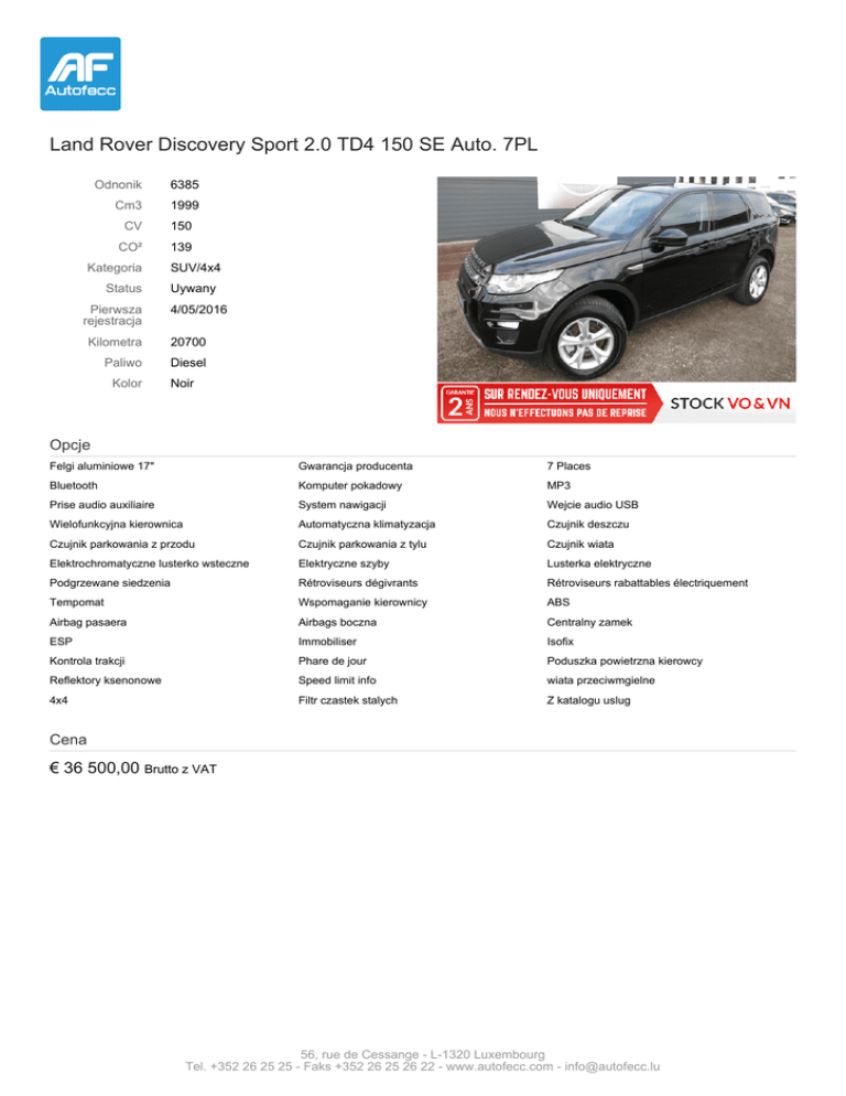 Land Rover Discovery Sport 2.0 TD4 150 SE Auto. 7PL Odnonik 6385 Cm3 1999 CV 150 CO² 139 Kategoria Status Pierwsza rejestracja SUV/4x4 Uywany 4/05/2016 Kilometra 20700 Paliwo Diesel Kolor Noir Opcje Felgi aluminiowe 17" Gwarancja producenta 7 Places Bluetooth Komputer pokadowy MP3 Prise audio auxiliaire System nawigacji Wejcie audio USB Wielofunkcyjna kierownica Automatyczna klimatyzacja Czujnik deszczu Czujnik parkowania z przodu Czujnik parkowania z tylu Czujnik wiata Elektrochromatyczne lusterko wsteczne Elektryczne szyby Lusterka elektryczne Podgrzewane siedzenia Rétroviseurs dégivrants Rétroviseurs rabattables électriquement Tempomat Wspomaganie kierownicy ABS Airbag pasaera Airbags boczna Centralny zamek ESP Immobiliser Isofix Kontrola trakcji Phare de jour Poduszka powietrzna kierowcy Reflektory ksenonowe Speed limit info wiata przeciwmgielne 4x4 Filtr czastek stalych Z katalogu uslug Cena € 36 500,00 Brutto z VAT 56, rue de Cessange - L-1320 Luxembourg Tel. +352 26 25 25 - Faks +352 26 25 26 22 - www.autofecc.com - [email protected]