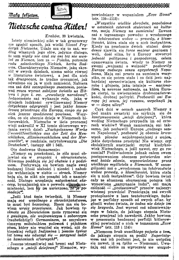 fl?gf# felieton. powiedziany w wspanialem „2?cce Homo" (str. 110—1113): „Wszystkie wielkie zbrodnie, popełnione w ostatnich czterech stuleciach na kultu rze, mają Niemcy na sumieniu! Zawsze zaś z tegosamego p o w o d u : z w r o d z o n e g o im tchórzostwa wobec — prawdy, z kłam liwości, która stała się u nich instynktem. K i e d y na przełomie dwóch stuleci déca dence zjawiła się force majeur geniuszu i woli, dość silna, by z E u r o p y stworzyć jedność polityczną i gospodarczą, eelem opanowania świata, wtedy to Niemcy ze swemi „ w o j n a m i o w o l n o ś ć " pozbawiły Europę cudnego sensu egzystencji Napo leona. Mają oni przeto na sumieniu w s z y stko, co się potem stało i co dziś j e s t : n a j bardziej sprzeciwiającą się kulturze c h o robę i głupotę, jaka- istnieje — nacjona lizm, tę névrose nationale, na którą E u r o pa cierpi, to uwiecznienie drobnopaństewkości, drobnej polityki. Pozbawili oni Eur ropę jej sensu, jej rozumu, wepchnęli ją w — ślepa ulicę!" lliei^sche canixa 9Ciile%! Kraków, 30 kwietnia. Istoty niemieckiej nikt w tak g r u n t o w n y nie zgłębił sposób, jak wielki filozof Fry deryk Nietzsche. Udało m u się to zaś, w e dług własnych j e g o słów, jedynie dlatego, że sam nigdy nie czul sie ani też nie uwa żał za Niemca, lecz za — Polaka, potomka rodu szlacheckiego Nickich, herbu Radiran. Charakterystyka Niemców, jaką skre ślił w s w y c h dziełach, niema sobie r ó w n e j w literaturze ś w i a t o w e j , a jest dla nich tak druzgocąca, że trudno zrozumieć, j a k odważono się ją w nich zamieścić. Nabiera ona zaś dziś szczególnego znaczenia, ponie waż rzuca wprost zabójcze światło na Hit lera i jego t. zw. „rewolucje narodowa.". Jednocześnie zaś wykazuje rolę, jaką w dziejach ludzkości cywilizowanej Niemcy dotychczas odgrywali i jest j a k b y kasandrową przestrogą dla Europy, czego sie po nich jeszcze spodziewać powinna. Wszy stko, co się obecnie dzieje w Niemczech hi tlerowskich, Nietzsche w iście proroezej wizji nakreślił w X I tomie zbiorowego w y dania swych dzieł: nachgelassene Werke Unveröffentlichtes aus der Zeit des Men schlichen, Allzumenschlichen und der Mor genröte", w rozdziale, zatytułowanym „Die Deutschen", (ustępy 430 i 543). _ Czyż dziś w oczach naszych N i e m c y z pod znaku swastyki nie szykują się d o kontynuowania „misji dziejowej", która w e d ł u g Nietzschego przypadła im od czte rech wieków? Wszak zamierzają oni taksamo, jak pozbawili Europę „ c u d n e g o sen su Napoleona", pozbawić ją obecnie knca* wych plonów najokropniejszej z wojen, jakie dotychczas przeżyła] Nie wiemy, c z y ekslakiernik austrjacki czytał kiedykol wiek Nietzschego, a jeśli nawet, czy g o r o Oto dosłowne tłumaczenie: zumiał? P o d ś w i a d o m i e jednak calem swem „ N i e m c y są przekokani, że siła musi o b postępowaniem obecnem potwierdza nie jawiać się w srogości i okrucieństwie. mal każde zdanie, wypowiedziane przez Wówczas poddają sie jej chętnie i z podzi wielkiego myśliciela o Niemcach. W szcze wem. P o z b y w a j ą się bowiem nagle s w e j gólności zaś o „ w r o d z o n e m im tchórzostwie budzącej litość słabości i nicości i naboż wobec prawdy, o kłamliwości, która stała nie wchłaniają w siebie — strach. N i e m c y się u nich instynktem". G d y bowiem świat boją się, że nikt nie posądzi ich o namięt c a ł y ze słusznem oburzeniem potępia i c h ność. Dlatego urządzają natychmiast eks w z n o w i o n e ^ ą r z y n ą n i e ludzi", oni mają cesy, b y n a j m n i e j ; nie z p o w o d u sfesgljji * czelność — - p r o t e s t o w a ć " p r z e c i w n a i o c z y miętności, lecz by im uwierzonofifè*3é'powistszej p r a w d z i e ! Prześcigają zaś swych! siadają* protoplastów z lasu teutoburskiego, żąda „Jeśli ktoś śmie, twierdzić, iż N i e m c y jąc w p e r f i d n y sposób od s w y c h ofiar, b y mają coś wspólnego z chrześcijaństwem, głosili wobec świata, że żadna nie dzieje im to musi b y ć bezczelny. Ezeez m a się b o się krzywda. Jest w p r o s t c o ś zdumiewają wiem wręcz przeciwnie. Jak bowiem tę c e g o w fakcie, d o j a k i e g o stopnia Nietz sknota za Zbawicielem może r y m o w a ć się sche przejrzał ich nawskróś. J a k b y b o w i e m z gnuśńym, ale wojowniczym i zaborczym w przeczuciu bezdennej perfidji hitlerow (raubsüchtig!) Germaninem, ze z m y s ł o w o skiej powiedział o nich w temsamem „Ecce zimnym miłośnikiem polowań i pijakiem Homo" (str. 113 i 114): piwa, który nie wzniósł się w y ż e j , niż d o kiepskiej religji Indianina i jeszcze tysiąc „ N i e m c o m brak wszelkiego pojęcia o tern, lat temu nie oduczył się — zarzynać ludzi do j a k i e g o stopnia są podli! Superlaty na kamieniach ofiarnych?". wem zaś ich podłości jest, że nie wstydzat .•\ Jeszcze 'straszliwiej zaś. brzmi sąd Nietz się nawet, iż są tylko — N i e m c a m i . U w a schego o „misji dziejowej" N i e m c ó w , w y żają o n i siebie za wyrocznię we wszyst* 113 ir ~^ 1 1 %lem. A nie, posiadają uczucia dla dystanMU m i ę d z y człowiekiem a człowiekiem. Nie Minie ją, — dystansować. I dlatego właśnie to •<—• kanał jami. •fc.tJaly świat c y w i l i z o w a n y p o w i n i e n dziś ^ C z y t y w a ć się w Nietzschego. Znajdzie b o g i e m u n i e g o najświetniejszą charaktery stykę tego n a r o d u , k t ó r y nie spocznie, za nim nie rozpali nowej pożogi wojennej. W szczególności zaś z a c y t o w a n e tu ustępy z n dzieł filozofa należałoby przetłumaczyć na k wszystkie języki i rozpowszechnić w for- n mie ulotek w k a ż d y m kraju, ażeby ludz- u kość, cywilizowana nareszcie zrozumiała, p co ją czelca od Niemców! „( 77. Szarlitt. U