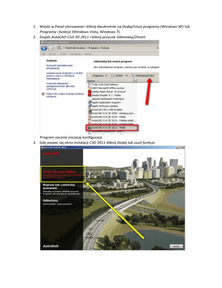 1. Wejdź w Panel sterowania i kliknij dwukrotnie na Dodaj/Usuń programy (Windows XP) lub Programy i funkcje (Windows Vista, Windows 7). 2. Znajdź AutoCAD Civil 3D 2011 i kliknij przycisk Odinstaluj/Zmień. Program zacznie inicjację konfiguracji. 3. Gdy pojawi się okno instalacji C3D 2011 kliknij Dodaj lub usuń funkcje. 4. W kroku Dodaj/Usuń elementy kliknij Dalej. 5. W kroku Konfiguruj pakiety przemieść suwak na sam dół, zaznacz Poland Content i kliknij Dalej. 6. W następnych krokach klikaj Dalej, aż do zakończenia instalacji.