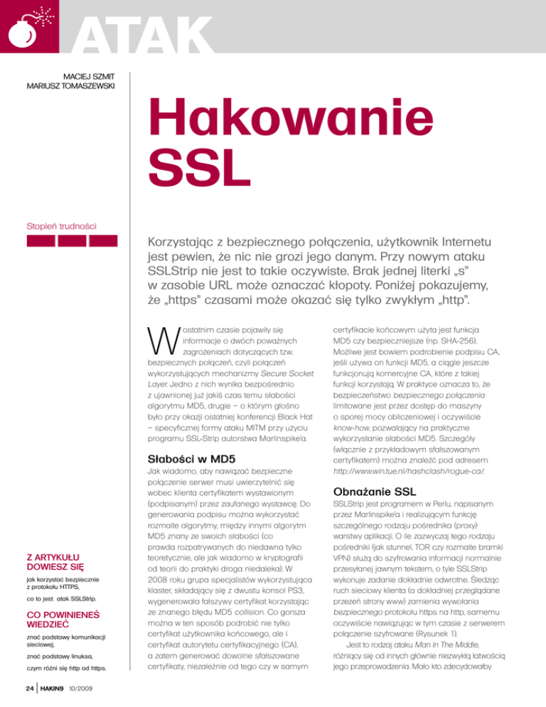 ATAK MACIEJ SZMIT MARIUSZ TOMASZEWSKI Hakowanie SSL Stopień trudności Korzystając z bezpiecznego połączenia, użytkownik Internetu jest pewien, że nic nie grozi jego danym. Przy nowym ataku SSLStrip nie jest to takie oczywiste. Brak jednej literki „s” w zasobie URL może oznaczać kłopoty. Poniżej pokazujemy, że „https” czasami może okazać się tylko zwykłym „http”. W ostatnim czasie pojawiły się informacje o dwóch poważnych zagrożeniach dotyczących tzw. bezpiecznych połączeń, czyli połączeń wykorzystujących mechanizmy Secure Socket Layer. Jedno z nich wynika bezpośrednio z ujawnionej już jakiś czas temu słabości algorytmu MD5, drugie – o którym głośno było przy okazji ostatniej konferencji Black Hat – specyficznej formy ataku MITM przy użyciu programu SSL-Strip autorstwa Marlinspike’a. Słabości w MD5 Z ARTYKUŁU DOWIESZ SIĘ jak korzystać bezpiecznie z protokołu HTTPS, co to jest atak SSLStrip. CO POWINIENEŚ WIEDZIEĆ znać podstawy komunikacji sieciowej, znać podstawy linuksa, czym różni się http od https. 24 HAKIN9 10/2009 Jak wiadomo, aby nawiązać bezpieczne połączenie serwer musi uwierzytelnić się wobec klienta certyfikatem wystawionym (podpisanym) przez zaufanego wystawcę. Do generowania podpisu można wykorzystać rozmaite algorytmy, między innymi algorytm MD5 znany ze swoich słabości (co prawda rozpatrywanych do niedawna tylko teoretycznie, ale jak wiadomo w kryptografii od teorii do praktyki droga niedaleka). W 2008 roku grupa specjalistów wykorzystująca klaster, składający się z dwustu konsol PS3, wygenerowała fałszywy certyfikat korzystając ze znanego błędu MD5 collision. Co gorsza można w ten sposób podrobić nie tylko certyfikat użytkownika końcowego, ale i certyfikat autorytetu certyfikacyjnego (CA), a zatem generować dowolne sfałszowane certyfikaty, niezależnie od tego czy w samym certyfikacie końcowym użyta jest funkcja MD5 czy bezpieczniejsze (np. SHA-256). Możliwe jest bowiem podrobienie podpisu CA, jeśli używa on funkcji MD5, a ciągle jeszcze funkcjonują komercyjne CA, które z takiej funkcji korzystają. W praktyce oznacza to, że bezpieczeństwo bezpiecznego połączenia limitowane jest przez dostęp do maszyny o sporej mocy obliczeniowej i oczywiście know-how, pozwalający na praktyczne wykorzystanie słabości MD5. Szczegóły (włącznie z przykładowym sfałszowanym certyfikatem) można znaleźć pod adresem http://www.win.tue.nl/hashclash/rogue-ca/. Obnażanie SSL SSLStrip jest programem w Perlu, napisanym przez Marlinspike’a i realizującym funkcję szczególnego rodzaju pośrednika (proxy) warstwy aplikacji. O ile zazwyczaj tego rodzaju pośredniki (jak stunnel, TOR czy rozmaite bramki VPN) służą do szyfrowania informacji normalnie przesyłanej jawnym tekstem, o tyle SSLStrip wykonuje zadanie dokładnie odwrotne. Śledząc ruch sieciowy klienta (a dokładniej przeglądane przezeń strony www) zamienia wywołania bezpiecznego protokołu https na http, samemu oczywiście nawiązując w tym czasie z serwerem połączenie szyfrowane (Rysunek 1). Jest to rodzaj ataku Man In The Middle, różniący się od innych głównie niezwykłą łatwością jego przeprowadzenia. Mało kto zdecydowałby BRAK BEZPIECZNEGO POŁĄCZENIA! ������ ���� ��������� ���������� ������ ����� Rysunek 1. Schemat działania MITM z programem SSLStrip, jako odbezpieczającym Proxy się dobrowolnie na instalację tego rodzaju proxy servera, konieczne jest – jak zawsze w przypadku ataków MITM – przechwycenie ruchu sieciowego. Można to zrobić na kilka sposobów, w przykładzie poniżej posłużymy się klasycznym arp-spoofingiem zastosowanym w przewodowym ethernecie. Każdy w miarę przytomny użytkownik powinien zaobserwować, że połączenie, które miało być bezpieczne (a więc rodzaj zasobu w URL powinien być https) jest zwykłym połączeniem http. Po pierwsze jednak użytkownicy zazwyczaj nie czytają nawet wyskakujących okienek z licznymi wykrzyknikami, a po wtóre – istnieją strony, które jako całość dostępne są przez http, szyfrowane są natomiast określone ich elementy (Rysunek 2). W takim wypadku użytkownik nie ma żadnych szans na dostrzeżenie ataku, zakładając, że nie prowadzi równolegle monitoringu i dekodowania ruchu wychodzącego i przychodzącego. Tego rodzaju użytkownicy trafiają się jednak jeszcze rzadziej niż ci, którzy nie cierpią na syndrom klikania alertów. internetową swojej ofiary. W tym celu wykorzystamy narzędzie arpspoof. Na Rysunku 4. przedstawiona jest tablica ARP cache komputera ofiary. Widać, że adresowi IP bramy 192.168.1.1 odpowiada adres MAC 00:0C:29:00:00: 35. Jest to stan sprzed wykonania ataku. Przeprowadzenie ataku sprowadza się do wykonania na komputerze atakującego kilku kroków. Rysunek 2. Przykład strony o konstrukcji podatnej na SSLStrip ������ Trochę praktyki Na Rysunku 3. znajduje się fragment przykładowej sieci komputerowej, która została wykorzystana do przeprowadzenia ataku SSLStrip. Sieć oparta jest na switchu, jak większość już chyba współczesnych sieci komputerowych. W takim przypadku ruch jest przełączany na portach switcha i kierowany bezpośrednio pod adres docelowy, nie jest on widoczny dla atakującego. Aby przeprowadzić atak SSLStrip, atakujący musi również wykorzystać inną technikę ataku, a mianowicie podszywania się pod inny komputer. Interesuje nas ruch sieciowy skierowany od ofiary do Internetu, więc atakujący musi podszyć się pod bramę ����������������� ������ ��������� ����� ��������������� ���������������� Rysunek 3. Schemat sieci przykładowej 10/2009 HAKIN9 25 ATAK Rysunek 4. Tablica ARP cache ofiary Rysunek. 5. Włączenie przekazywanie p
