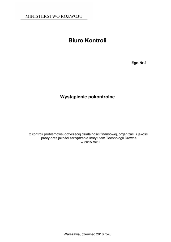 Biuro Kontroli Egz. Nr 2 Wystąpienie pokontrolne z kontroli problemowej dotyczącej działalności finansowej, organizacji i jakości pracy oraz jakości zarządzania Instytutem Technologii Drewna w 2015 roku Warszawa, czerwiec 2016 roku Strona 2 z 16 I. NAZWA I ADRES JEDNOSTKI KONTROLOWANEJ. Instytut Technologii Drewna, z siedzibą w Poznaniu (60-654), przy ul. Winiarskiej 1, zwany dalej „Instytutem” lub „ITD”. II. SKŁAD ZESPOŁU KONTROLUJĄCEGO PRZEPROWADZENIA KONTROLI. ORAZ TERMIN I PODSTAWA PRAWNA Na podstawie upoważnienia do kontroli Nr MR/310-UM/16 z dnia 30 marca 2016 r. Zespół kontrolujący w składzie: 1) Robert Fedorczyk – starszy specjalista – kierownik Zespołu kontrolującego 2) Piotr Regner – starszy specjalista przeprowadził kontrolę w Instytucie Technologii Drewna w dniach od 11 do 15 kwietnia 2016 r. Podstawę prawną do przeprowadzenia kontroli stanowi art. 36 ust. 1 ustawy o instytutach badawczych1), oraz art. 16 ust. 2 ustawy o kontroli w administracji rządowej2). III. TEMAT, ZAKRES PRZEDMIOTOWY I OKRES OBJĘTY KONTROLĄ. Działalność finansowa, organizacja i jakość pracy oraz jakość zarządzania Instytutem w 2015 roku. Zakres przedmiotowy kontroli. A. Działalność finansowa. B. Organizacja i jakość pracy. C. Jakość zarządzania. Okres objęty kontrolą. 2015 rok. IV. DANE KIEROWNIKA JEDNOSTKI KONTROLOWANEJ. Dyrektorem Instytutu w dniu prowadzenia czynności kontrolnych był Pan Władysław Strykowski powołany przez Ministra Gospodarki na okres 4 lat3). V. USTALENIA KONTROLI I OCENA SKONTROLOWANEJ DZIAŁALNOŚCI W POSZCZEGÓLNYCH OBSZARACH. A. DZIAŁALNOŚĆ FINANSOWA. 1. Plan finansowy oraz sprawozdanie finansowe. Kontrolą objęto dokumentację dotyczącą opracowania, opiniowania i przekazania przez Instytut do właściwych organów: Planu finansowego na 2015 rok oraz sprawozdania finansowego za 2015 rok. W wyniku kontroli stwierdzono, że: − Plan finansowy na 2015 rok sporządzono zgodnie z ustawą oib i po uzyskaniu pozytywnej opinii Rady Naukowej Instytutu przekazano do ówczesnego Ministerstwa Gospodarki, − Sprawozdanie finansowe za 2015 rok sporządzono zgodnie z ustawą o rachunkowości4) i po uzyskaniu pozytywnej opinii Rady Naukowej Instytutu przekazano do zatwierdzenia do ministra nadzorującego. [Akta kontroli str. 37-138, 347] Zespół kontrolujący w zbadanym zakresie nie stwierdził nieprawidłowości ani uchybień. 2. Analiza sytuacji ekonomiczno-finansowej Instytutu. Kontrolą objęto dokumentację dotyczącą sytuacji ekonomiczno-finansowej Instytutu, w tym Plan finansowy na 2015 rok, Okresową informację o instytucie badawczym wg stanu 1) 2) 3) 4) Z dnia 30 kwietnia 2010 r. (j.t. Dz. U. z 2015 r. poz. 1095, z późn. zm.). Dalej „ustawa oib”. Z dnia 15 lipca 2011 r. (Dz. U. Nr 185, poz. 1092). Od dnia 1.07.2012 r. do 30.06.2016 r. – pismo z dn. 6.06.2012 r., znak: DNP-IV-124-2/10/12. Z dnia 29 września 1994 r. (j.t. Dz. U. z 2013 r., poz. 330, z późn. zm.). Dalej „uor”. Strona 3 z 16 na dzień 31 grudnia 2015 r., Sprawozdanie finansowe za 2015 rok wraz z opinią biegłego rewidenta z badania Sprawozdania. Zgodnie ze Sprawozdaniem finansowym za 2015 rok, Instytut uzyskał dodatni wynik finansowy (zysk netto) w wysokości 225 447,32 zł, który w porównaniu do roku 2014 i 2013 był wyższy odpowiednio o 12,42 % i 11,72%. Przychody netto ze sprzedaży wyniosły w 2015 roku 8 268 651,69 zł i były wyższe w stosunku do roku 2014 i 2013 odpowiednio o 11,02 % i 10,46%. Udział przychodów netto ze sprzedaży w przychodach ogółem5) kształtował się na zbliżonym poziomie i wynosił w latach 2013-2015 odpowiednio: 88,01%, 89,50% i 90,55%. Przychody z działalności naukowo-badawczej w 2015 roku wyniosły 4 531 575 zł i były wyższe w stosunku do roku 2014 i 2013 odpowiednio o 22,99% i 24,82%. Z tytułu działalności innej niż podstawowa Instytut w 2015 roku uzyskał dodatni wynik finansowy w wysokości 1 101 534,88 zł. Działalność inna niż podstawowa, zgodnie z ustawą oib była wyodrębniona pod względem finansowym i rachunkowym z działalności podstawowej. [Akta kontroli str. 53-137] Zespół kontrolujący w zbadanym zakresie stwierdził, że sytuacja ekonomiczno-finansowa Instytutu w okresie objętym kontrolą była stabilna. 3. Zasady (polityka) rachunkowości i jej zgodność z wymogami ustawy o rachunkowości6). Kontrolą objęto dokumentację dotyczącą regulacji wewnętrznych normujących w Instytucie zasady prowadzenia rachunkowości i jej zgodność z wymogami uor. W wyniku kontroli stwierdzono, że stosowane przez Instytut w okresie objętym kontrolą zasady (polityka) rachunkowości, wprowadzone zarządzeniem Dyrektora Instytutu spełniały wymogi uor. [Akta kontroli str. 139-156, 348] Zespół kontrolujący w zbadanym zakresie nie stwierdził nieprawidłowości ani uchybień. 4. Stosowanie zasad kontroli finansowej i obiegu dokumentów finansowo-księgowych. Kontrolą objęto dokumentację dotyczącą regulacji wewnętrznych normujących w Instytucie zasady sprawowania kontroli finansowej i obiegu dokumentów finansowo-księgowych, w tym zgodność postępowania w badanym zakresie z przepisami wewnętrznymi. Stosowanie przez Instytut procedur kontroli finansowej i obiegu dokumentów zbadano na próbie 162 faktur zakupu z kwietnia 2015 roku. Badane dokumenty podlegały sprawdzeniu pod względem merytorycznym i formalno-rachunkowym oraz akceptacji do wypłaty, zgodnie z obowiązującymi w tym zakresie unormowaniami wewnętrznymi. [Akta kontroli str. 157-186, 348] Zespół kontrolujący w zbadanym zakresie nie stwierdził nieprawidłowości ani uchybień. 5. Procedury udzielania zamówień publicznych oraz ich zgodność z przepisami ustawy Prawo zamówień publicznych7). Kontrolą objęto dokumentację dotyczącą regulacji wewnętrznych normujących w Instytucie zasady udzielania zamówień publicznych, w tym zgodność postępowania przy udzielaniu zamówień w trybie przep
