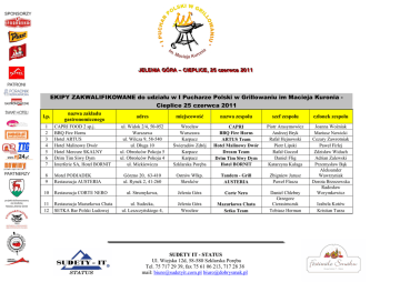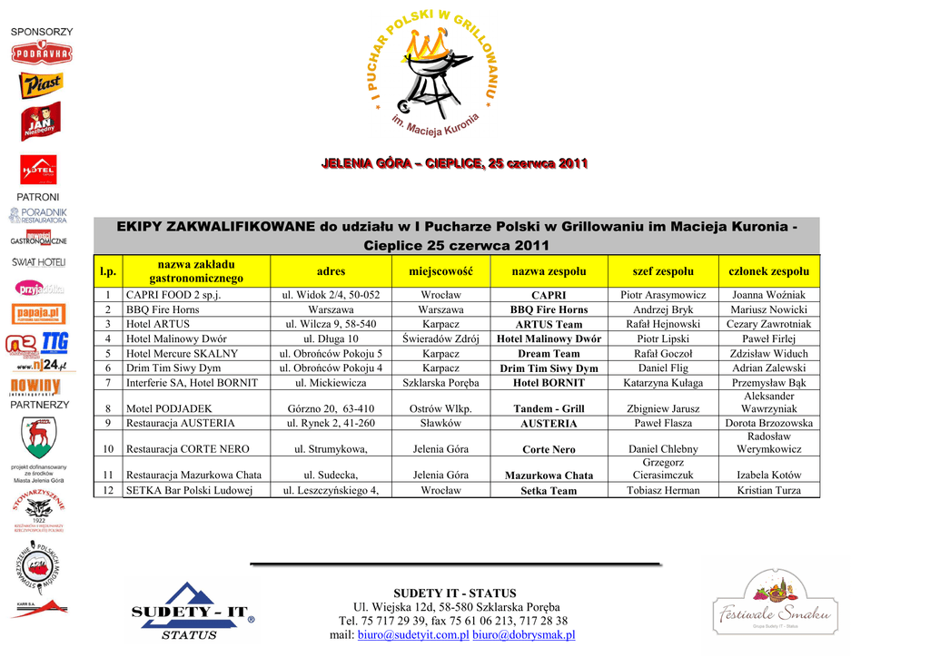 JJEELLEENNIIAA GGÓÓRRAA –– CCIIEEPPLLIICCEE,, 2255 cczzeerrwwccaa 22001111 EKIPY ZAKWALIFIKOWANE do udziału w I Pucharze Polski w Grillowaniu im Macieja Kuronia Cieplice 25 czerwca 2011 l.p. nazwa zakładu gastronomicznego 1 2 3 4 5 6 7 CAPRI FOOD 2 sp.j. BBQ Fire Horns Hotel ARTUS Hotel Malinowy Dwór Hotel Mercure SKALNY Drim Tim Siwy Dym Interferie SA, Hotel BORNIT 8 9 Motel PODJADEK Restauracja AUSTERIA 10 Restauracja CORTE NERO 11 12 Restauracja Mazurkowa Chata SETKA Bar Polski Ludowej adres miejscowość nazwa zespołu szef zespołu członek zespołu ul. Widok 2/4, 50-052 Warszawa ul. Wilcza 9, 58-540 ul. Długa 10 ul. Obrońców Pokoju 5 ul. Obrońców Pokoju 4 ul. Mickiewicza Wrocław Warszawa Karpacz Świeradów Zdrój Karpacz Karpacz Szklarska Poręba CAPRI BBQ Fire Horns ARTUS Team Hotel Malinowy Dwór Dream Team Drim Tim Siwy Dym Hotel BORNIT Piotr Arasymowicz Andrzej Bryk Rafał Hejnowski Piotr Lipski Rafał Goczoł Daniel Flig Katarzyna Kułaga Górzno 20, 63-410 ul. Rynek 2, 41-260 Ostrów Wlkp. Sławków Tandem - Grill AUSTERIA Zbigniew Jarusz Paweł Flasza ul. Strumykowa, Jelenia Góra Corte Nero ul. Sudecka, ul. Leszczyńskiego 4, Jelenia Góra Wrocław Mazurkowa Chata Setka Team Daniel Chlebny Grzegorz Cierasimczuk Tobiasz Herman Joanna Woźniak Mariusz Nowicki Cezary Zawrotniak Paweł Firlej Zdzisław Widuch Adrian Zalewski Przemysław Bąk Aleksander Wawrzyniak Dorota Brzozowska Radosław Werymkowicz SUDETY IT - STATUS Ul. Wiejska 12d, 58-580 Szklarska Poręba Tel. 75 717 29 39, fax 75 61 06 213, 717 28 38 mail: [email protected] [email protected] Izabela Kotów Kristian Turza