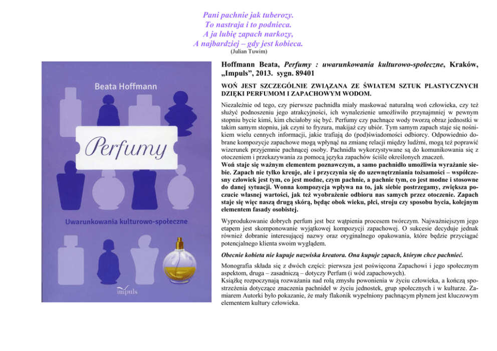 Pani pachnie jak tuberozy. To nastraja i to podnieca. A ja lubię zapach narkozy, A najbardziej – gdy jest kobieca. (Julian Tuwim) Hoffmann Beata, Perfumy : uwarunkowania kulturowo-społeczne, Kraków, „Impuls”, 2013. sygn. 89401 WOŃ JEST SZCZEGÓLNIE ZWIĄZANA ZE ŚWIATEM SZTUK PLASTYCZNYCH DZIĘKI PERFUMOM I ZAPACHOWYM WODOM. Niezależnie od tego, czy pierwsze pachnidła miały maskować naturalną woń człowieka, czy też służyć podnoszeniu jego atrakcyjności, ich wynalezienie umożliwiło przynajmniej w pewnym stopniu bycie kimś, kim chciałoby się być. Perfumy czy pachnące wody tworzą obraz jednostki w takim samym stopniu, jak czyni to fryzura, makijaż czy ubiór. Tym samym zapach staje się nośnikiem wielu cennych informacji, jakie trafiają do (pod)świadomości odbiorcy. Odpowiednio dobrane kompozycje zapachowe mogą wpłynąć na zmianę relacji między ludźmi, mogą też poprawić wizerunek przyjemnie pachnącej osoby. Pachnidła wykorzystywane są do komunikowania się z otoczeniem i przekazywania za pomocą języka zapachów ściśle określonych znaczeń. Woń staje się ważnym elementem poznawczym, a samo pachnidło umożliwia wyrażanie siebie. Zapach nie tylko kreuje, ale i przyczynia się do uzewnętrzniania tożsamości – współczesny człowiek jest tym, co jest modne, czym pachnie, a pachnie tym, co jest modne i stosowne do danej sytuacji. Wonna kompozycja wpływa na to, jak siebie postrzegamy, zwiększa poczucie własnej wartości, jak też wyobrażenie odbioru nas samych przez otoczenie. Zapach staje się więc naszą drugą skórą, będąc obok wieku, płci, stroju czy sposobu bycia, kolejnym elementem fasady osobistej. Wyprodukowanie dobrych perfum jest bez wątpienia procesem twórczym. Najważniejszym jego etapem jest skomponowanie wyjątkowej kompozycji zapachowej. O sukcesie decyduje jednak również dobranie interesującej nazwy oraz oryginalnego opakowania, które będzie przyciągać potencjalnego klienta swoim wyglądem. Obecnie kobieta nie kupuje nazwiska kreatora. Ona kupuje zapach, którym chce pachnieć. Monografia składa się z dwóch części: pierwsza jest poświęcona Zapachowi i jego społecznym aspektom, druga – zasadniczą – dotyczy Perfum (i wód zapachowych). Książkę rozpoczynają rozważania nad rolą zmysłu powonienia w życiu człowieka, a kończą spostrzeżenia dotyczące znaczenia pachnideł w życiu jednostek, grup społecznych i w kulturze. Zamiarem Autorki było pokazanie, że mały flakonik wypełniony pachnącym płynem jest kluczowym elementem kultury człowieka.