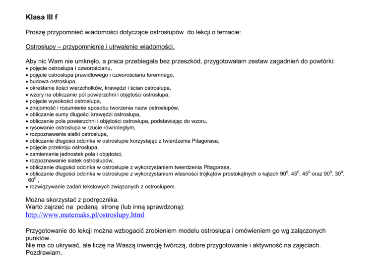 Klasa III f Proszę przypomnieć wiadomości dotyczące ostrosłupów do lekcji o temacie: Ostrosłupy – przypomnienie i utrwalenie wiadomości. Aby nic Wam nie umknęło, a praca przebiegała bez przeszkód, przygotowałam zestaw zagadnień do powtórki: pojęcie ostrosłupa i czworościanu, pojęcie ostrosłupa prawidłowego i czworościanu foremnego, budowa ostrosłupa, określanie ilości wierzchołków, krawędzi i ścian ostrosłupa, wzory na obliczanie pól powierzchni i objętości ostrosłupa, pojęcie wysokości ostrosłupa, znajomość i rozumienie sposobu tworzenia nazw ostrosłupów, obliczanie sumy długości krawędzi ostrosłupa, obliczanie pola powierzchni i objętości ostrosłupa, podstawiając do wzoru, rysowanie ostrosłupa w rzucie równoległym, rozpoznawanie siatki ostrosłupa, obliczanie długości odcinka w ostrosłupie korzystając z twierdzenia Pitagorasa, pojęcie przekroju ostrosłupa, zamienianie jednostek pola i objętości, rozpoznawanie siatek ostrosłupów, obliczanie długości odcinka w ostrosłupie z wykorzystaniem twierdzenia Pitagorasa, obliczanie długości odcinka w ostrosłupie z wykorzystaniem własności trójkątów prostokątnych o kątach 900, 450, 450 oraz 900, 300, 600 , rozwiązywanie zadań tekstowych związanych z ostrosłupem. Można skorzystać z podręcznika. Warto zajrzeć na podaną stronę (lub inną sprawdzoną): http://www.matemaks.pl/ostroslupy.html Przygotowanie do lekcji można wzbogacić zrobieniem modelu ostrosłupa i omówieniem go wg załączonych punktów. Nie ma co ukrywać, ale liczę na Waszą inwencję twórczą, dobre przygotowanie i aktywność na zajęciach. Pozdrawiam.