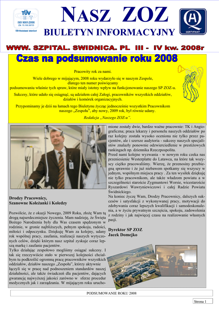 NASZ ZOZ BIULETYN INFORMACYJNY Pracowity rok za nami. Wiele dobrego w mijającym, 2008 roku wydarzyło się w naszym Zespole, dlatego ten numer poświęcamy podsumowaniu właśnie tych spraw, które miały istotny wpływ na funkcjonowanie naszego SP ZOZ-u. Sukcesy, które udało się osiągnąć, są udziałem całej Załogi, pracowników wszystkich oddziałów, działów i komórek organizacyjnych. Przypominamy je dziś na łamach tego Biuletynu życząc jednocześnie wszystkim Pracownikom naszego „Zespołu”, aby nowy, 2009 rok, był równie udany. Redakcja „Naszego ZOZ-u”. mione zostały dwie, bardzo ważne pracownie: TK i Angiograficzna; praca lekarzy i personelu naszych oddziałów po raz kolejny została wysoko oceniona nie tylko przez pacjentów, ale i szersze audytoria - sukcesy naszych specjalistów znalazły ponownie odzwierciedlenie w prestiżowych rankingach np. dziennika Rzeczpospolita. Przed nami kolejne wyzwania - w nowym roku czeka nas przeniesienie Westerplatte do Latawca, na które tak wszyscy ciężko pracowaliśmy. Wierzę, że przenosiny przebiegną sprawnie i że już niebawem spotkamy się wszyscy w jednym, wspólnym miejscu pracy . Za ten wysiłek dziękuję nie tylko pracownikom, ale także władzom powiatu a w szczególności staroście Zygmuntowi Worsie, wicestaroście Ryszardowi Wawryniewiczowi i całej Radzie Powiatu Świdnickiego. Na koniec życzę Wam, Drodzy Pracownicy, dalszych sukDrodzy Pracownicy, cesów i satysfakcji z wykonywanej pracy, motywacji do Szanowne Koleżanki i Koledzy zdobywania coraz lepszych kwalifikacji i samodoskonalenia, a w życiu prywatnym szczęścia, spokoju, zadowolenia Pozwólcie, że z okazji Nowego, 2009 Roku, złożę Wam tą z rodziny i jak najwięcej czasu na realizowanie własnych drogą najserdeczniejsze życzenia. Mam nadzieję, że Święta pasji. Bożego Narodzenia były dla Was czasem spędzonym w rodzinie, w gronie najbliższych, pełnym spokoju, radości, miłości i odpoczynku. Dziękuję Wam za kolejny, udany Dyrektor SP ZOZ rok wspólnej pracy, zaufania, realizacji naszych wytyczo- Jacek Domejko nych celów, dzięki którym nasz szpital zyskuje coraz lepszą markę i zaufanie pacjentów. Tylko działając zespołowo mogliśmy osiągać sukcesy. I tak się rzeczywiście stało w pierwszej kolejności chciałbym tu podkreślić ogromną pracę pracowników wszystkich oddziałów, działów naszego „Zespołu”, którzy aktywnie łączyli się w pracę nad podnoszeniem standardów naszej działalności, ale także świadczeń dla pacjentów, dających gwarancję najwyższej jakości zarówno w sferze procedur medycznych jak i zarządzania. W mijającym roku uruchoPODSUMOWANIE ROKU 2008 Strona 1 I w tym roku przedstawiamy najważniejsze – zdaniem szefów oddziałów- osiągnięcia, jakie stały się w tym roku udziałem załogi naszego szpitala. Nie jest to zwyczajne chwalenie się, lecz podparta konkretnymi, rzetelnymi przykładami informacja pokazująca codzienność pracy lekarzy, pielęgniarek, pracowników administracyjnych, technicznych. Sukcesy prezentujemy wg. daty nadesłanych informacji od szefów. Oddział Otolaryngologiczny, lekarz kierujący– dr Ryszard Czesak, pielęgniarka oddziałowa Ewa Kowalska Leczą skutecznie i szybko i jak zawsze można na nich liczyć — to oni pierwsi odpowiedzieli:) Na tym oddziale przebywa się naprawdę tylko tak długo, jak to konieczne. Zazwyczaj już w dniu przyjęcia wykonywany jest zabieg tak, aby pacjent jak najszybciej mógł wrócić do domu, a co za tym idzie – przeżywać jak najmniej stresu. W dniu wypisu chory od razu otrzymuje kartę informacyjną (wypis ze szpitala). Na oddziale wykonywane są liczne badania. Wśród nich jest badanie BERA czyli rozszerzona diagnostyka słuchu (pozwala ono wykryć niedosłuch, głuchotę zarówno u dzieci, jak i dorosłych). Oddział jest jednym z nielicznych oddziałów na Dolnym Śląsku, wykonującym to badanie u dzieci we śnie fizjologicznym i jedynym wykonującym BERA w znieczuleniu ogólnym. Każdy pacjent po telefonicznym uzgodnieniu z lek. spec. otolaryngologiem Ewą Kubiaczyk zgłasza się na czczo, ze skierowaniem do szpitala w wyznaczonym dniu i godzinie. Po wykonaniu badania BERA, pacjent otrzymuje wynik badania, wypis ze szpitala oraz zalecenia lekarskie i w tym samym dniu wychodzi do domu. Dziękujemy za szybką i sprawną obsługę! Fot. Jan Zieńczuk Oddział Fizjologii i Patologii Noworodka z Pododdziałem Intensywnej Terapii Noworodka, lekarz kierujący – dr Jan Zieńczuk, pielęgniarka oddziałowa Dorota Ahiejczyk Oddział noworodkowy – wśród najlepszych w województwie ! Oddział noworodkowy został przez nadzór kliniczny oraz przez władze wojewódzkie zakwalifikowany jako jeden z 10 oddziałów II stopnia na Dolnym Śląsku. Jest wyposażony w bardzo nowoczesny aparat INFANT FLOV do nieinwazyjnej wentylacji noworodków. - Jesteśmy tym samym jednym z pierwszych i nielicznych oddziałów powiatowych w Polsce, który posiada taki aparat – mówi Jan Zieńczuk, ordynator oddziału. – Pozwoliło to uczestniczyć nam w unikalnym, ogólnopolskim programie wentylacji nieinwazyjnej, który jest jednym z najnowocześniejszych programów w skali Europy. Jak ocenia dr Zieńczuk, mimo bardzo niekorzystnych i restrykcyjnych zmian w poczynaniach NFZ wobec oddziałów noworodkowych - szczególnie w drugim półroczu - oddział nasz utrzymuje się na dodatnim bilansie finansowym. To oznacza nie tylko dobre zarządzanie ale także i fakt, że pacjentki mają zaufanie do tego oddziału i chcą aby właśnie tutaj na świat przychodziły ich pociechy. Dziękujemy za to. Oddział Onkologii Klinicznej — lekarz kierujący dr Ewa Kilar, pielęgniarka oddziałowa Krystyna Jankotowicz Onkologia – przoduje w profilaktyce... Oddział Onkologiczny naszego szpitala kontynuował w mijającym roku realizację badań profilaktycznych i programów, finansowanych przez Ministerstwo Zdrowia oraz zagraniczne o