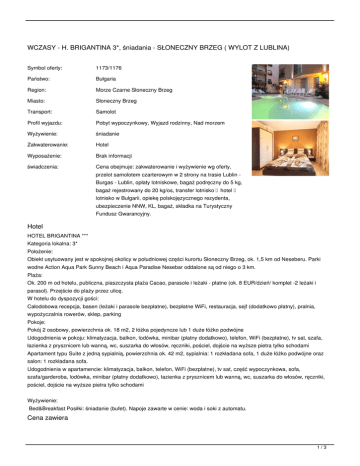 WCZASY - H. BRIGANTINA 3*, śniadania - SŁONECZNY BRZEG ( WYLOT Z LUBLINA) Symbol oferty: 1173/1176 Państwo: Bułgaria Region: Morze Czarne Słoneczny Brzeg Miasto: Słoneczny Brzeg Transport: Samolot Profil wyjazdu: Pobyt wypoczynkowy, Wyjazd rodzinny, Nad morzem Wyżywienie: śniadanie Zakwaterowanie: Hotel Wyposażenie: Brak informacji świadczenia: Cena obejmuje: zakwaterowanie i wyżywienie wg oferty, przelot samolotem czarterowym w 2 strony na trasie Lublin - Burgas - Lublin, opłaty lotniskowe, bagaż podręczny do 5 kg, bagaż rejestrowany do 20 kg/os, transfer lotnisko hotel lotnisko w Bułgarii, opiekę polskojęzycznego rezydenta, ubezpieczenie NNW, KL, bagaż, składka na Turystyczny Fundusz Gwarancyjny. Hotel HOTEL BRIGANTINA *** Kategoria lokalna: 3* Położenie: Obiekt usytuowany jest w spokojnej okolicy w południowej części kurortu Słoneczny Brzeg, ok. 1,5 km od Neseberu. Parki wodne Action Aqua Park Sunny Beach i Aqua Paradise Nesebar oddalone są od niego o 3 km. Plaża: Ok. 200 m od hotelu, publiczna, piaszczysta plaża Cacao, parasole i leżaki - płatne (ok. 8 EUR/dzień/ komplet -2 leżaki i parasol). Przejście do plaży przez ulicę. W hotelu do dyspozycji gości: Całodobowa recepcja, basen (leżaki i parasole bezpłatne), bezpłatne WiFi, restauracja, sejf (dodatkowo płatny), pralnia, wypożyczalnia rowerów, sklep, parking Pokoje: Pokój 2 osobowy, powierzchnia ok. 18 m2, 2 łóżka pojedyncze lub 1 duże łóżko podwójne Udogodnienia w pokoju: klimatyzacja, balkon, lodówka, minibar (płatny dodatkowo), telefon, WiFi (bezpłatne), tv sat, szafa, łazienka z prysznicem lub wanną, wc, suszarka do włosów, ręczniki, pościel, dojście na wyższe pietra tylko schodami Apartament typu Suite z jedną sypialnią, powierzchnia ok. 42 m2, sypialnia: 1 rozkładana sofa, 1 duże łóżko podwójne oraz salon: 1 rozkładana sofa. Udogodnienia w apartamencie: klimatyzacja, balkon, telefon, WiFi (bezpłatne), tv sat, część wypoczynkowa, sofa, szafa/garderoba, lodówka, minibar (płatny dodatkowo), łazienka z prysznicem lub wanną, wc, suszarka do włosów, ręczniki, pościel, dojście na wyższe pietra tylko schodami Wyżywienie: Bed&Breakfast Posiłki: śniadanie (bufet). Napoje zawarte w cenie: woda i soki z automatu. Cena zawiera 1/3 Cena pakietu obejmuje: - przelot samolotem Small Planet na trasie Lublin - Burgas - Lublin - opłaty lotniskowe - bagaż podręczny do 5 kg na osobę - bagaż rejestrowany do 20 kg na osobę - transfer lotnisko - hotel - lotnisko w Bułgarii - zakwaterowanie - wyżywienie wg wybranego wariantu opiekę rezydenta na miejscu ubezpieczenie Signal Iduna (KL 10 000 Euro, NNW 15 000 zł, bagaż 800 zł) - Składka na Turystyczny Fundusz Gwarancyjny Uwagi Godziny przelotów będą potwierdzane na 24 godziny przed wyjazdem. Zbiórka na lotnisku na 2 godziny przed wylotem. Pierwszy i ostatni dzień imprezy przewidziany jest na przelot. TERMINY: od: 2017-06-19 do: 2017-06-26 (8 dni), miejsca: sprawdź miejsca cena od: 1470 PLN od: 2017-06-26 do: 2017-07-03 (8 dni), miejsca: sprawdź miejsca cena od: 1470 PLN od: 2017-07-03 do: 2017-07-10 (8 dni), miejsca: sprawdź miejsca cena od: 1540 PLN od: 2017-07-10 do: 2017-07-17 (8 dni), miejsca: sprawdź miejsca cena od: 1640 PLN od: 2017-07-17 do: 2017-07-24 (8 dni), miejsca: sprawdź miejsca cena od: 1640 PLN od: 2017-07-24 do: 2017-07-31 (8 dni), miejsca: sprawdź miejsca cena od: 1640 PLN od: 2017-07-31 do: 2017-08-07 (8 dni), miejsca: sprawdź miejsca cena od: 1640 PLN od: 2017-08-07 do: 2017-08-14 (8 dni), miejsca: sprawdź miejsca cena od: 1640 PLN od: 2017-08-14 do: 2017-08-21 (8 dni), miejsca: sprawdź miejsca cena od: 1640 PLN od: 2017-08-21 do: 2017-08-28 (8 dni), miejsca: sprawdź miejsca cena od: 1540 PLN od: 2017-08-28 do: 2017-09-04 (8 dni), miejsca: sprawdź miejsca cena od: 1470 PLN od: 2017-09-04 do: 2017-09-11 (8 dni), miejsca: sprawdź miejsca cena od: 1470 PLN CENNIK: Długość pobytu: 8 dni 8 dni 8 dni Grupa cenowa: A8 B8 C8 (*) LUZ-BOJ-LUZ (Lublin - Burgas - Lublin) (-) (-) (-) -200 -200 -300 -300 (-) (-) (-) (-) (-) (-) (-) (-) (-) (-) Transport (obligatoryjny) Inne2 (do wyboru) (*) zniżka za wczesną rezerwację od osoby dorosłej -200 zniżka za wczesną rezerwację od dziecka 2-11.99 -300 Pobyt w obiekcie (do wyboru) (*) apartament dla 4 osób infant ( 0 - 2 lata) (-) (-) Pokój 2-osobowy standardowo dla osób: 2 (-) Pokój 2-osoby + dostawka standardowo dla osób: 3 (-) Pokój 1-osobowy (-) Pobyt w obiekcie (obligatoryjny) 2/3 (*) Brigantina 3* (Słoneczny Brzeg) Inne (opcjonalne) (-) GWARANCJA NIEZMIENNOŚCI CENY WATRA TRAVEL 80 Rodzaj osoby (do wyboru) osoba w apartamencie APP4/ 3 os z BB osoba dorosła w DBL z BB 1990 2030 dziecko 2-11.99 zakwaterowane z 1 os. dorosłą 1710 dziecko 0-2 lat 150 trzecia osoba DBL+1 z BB 1850 dziecko 2-11.99 zakwaterowane z 2 os.dorosłymi 1405 (*) osoba w apartamencie APP4/ 4 os z BB 1840 osoba w apartamecie w APP4/ 2 os z BB 2280 osoba dorosła w SGL z BB 2660 Ubezpieczenie (opcjonalne) ubezpieczenie od kosztów rezygnacji 100% kosztów 3% koszty rezyg. z rozsz. o ch.przewlekłe 100% 7.5 % ubezpieczenie od kosztów rezygnacji 80% 2.5 % ubezpieczenie od chorób przewlekłych 70 Ub.kosztów rezyg. z rozsz.o choroby przewlekłe 80% 6.5 % Inne (obligatoryjne) (*) Pakiet świadczeń wg oferty Inne (obligatoryjne) (-) (*) składka na Turystyczny Fundusz Gwarancyjny (-) (-) (-) 80 80 1850 1760 1840 1720 1620 1560 150 150 1710 1630 1405 1405 1740 1670 2080 1930 2280 2050 3% 3% 7.5 % 7.5 % 2.5 % 2.5 % 70 70 6.5 % 6.5 % (-) (-) (-) (-) Waluta: PLN Aktualne ceny z systemu S.A.R.T. (-) - cena usługi, podatku kalkulowana przy osobie lub gratis (*) - kwota wliczona w cenę standardową 3/3