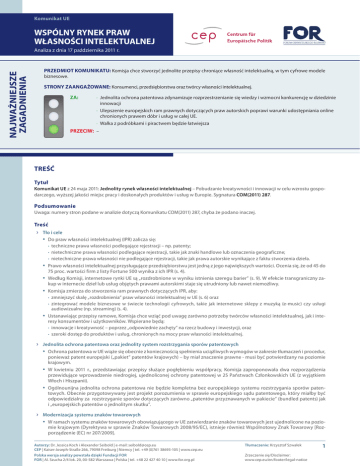 Komunikat UE WSPÓLNY RYNEK PRAW WŁASNOŚCI INTELEKTUALNEJ Analiza z dnia 17 października 2011 r. NAJWAŻNIEJSZE ZAGADNIENIA PRZEDMIOT KOMUNIKATU: Komisja chce stworzyć jednolite przepisy chroniące własność intelektualną, w tym cyfrowe modele biznesowe. STRONY ZAANGAŻOWANE: Konsumenci, przedsiębiorstwa oraz twórcy własności intelektualnej. ZA: ∙ Jednolita ochrona patentowa zdynamizuje rozprzestrzenianie się wiedzy i wzmocni konkurencję w dziedzinie innowacji ∙ Ulepszenie europejskich ram prawnych dotyczących praw autorskich poprawi warunki udostępniania online chronionych prawem dóbr i usług w całej UE. ∙ Walka z podróbkami i piractwem będzie łatwiejsza PRZECIW: – TREŚĆ Tytuł Komunikat UE z 24 maja 2011: Jednolity rynek własności intelektualnej – Pobudzanie kreatywności i innowacji w celu wzrostu gospodarczego, wyższej jakości miejsc pracy i doskonałych produktów i usług w Europie. Sygnatura COM(2011) 287. Podsumowanie Uwaga: numery stron podane w analizie dotyczą Komunikatu COM(2011) 287, chyba że podano inaczej. Treść ›› Tło i cele • Do praw własności intelektualnej (IPR) zalicza się: • techniczne prawa własności podlegające rejestracji – np. patenty; • nietechniczne prawa własności podlegające rejestracji, takie jak znaki handlowe lub oznaczenia geograficzne; • nietechniczne prawa własności nie podlegające rejestracji, takie jak prawa autorskie wynikające z faktu stworzenia dzieła. • Prawo własności intelektualnej przysługujące przedsiębiorstwu jest jedną z jego największych wartości. Ocenia się, że od 45 do 75 proc. wartości firm z listy Fortune 500 wynika z ich IPR (s. 4). • Według Komisji, internetowe rynki UE są „rozdrobnione w wyniku istnienia szeregu barier” (s. 9). W efekcie transgraniczny zakup w internecie dzieł lub usług objętych prawami autorskimi staje się utrudniony lub nawet niemożliwy. • Komisja zmierza do stworzenia ram prawnych dotyczących IPR, aby: • zmniejszyć skalę „rozdrobnienia” praw własności intelektualnej w UE (s. 6) oraz • zintegrować modele biznesowe w świecie technologii cyfrowych, takie jak internetowe sklepy z muzyką (e-music) czy usługi audiowizualne (np. streaming) (s. 4). • Ustanawiając przepisy ramowe, Komisja chce wziąć pod uwagę zarówno potrzeby twórców własności intelektualnej, jak i interesy konsumentów i użytkowników. Wspierane będą: • innowacje i kreatywność – poprzez „odpowiednie zachęty” na rzecz budowy i inwestycji, oraz • szeroki dostęp do produktów i usług, chronionych na mocy praw własności intelektualnej. ›› Jednolita ochrona patentowa oraz jednolity system rozstrzygania sporów patentowych • Ochrona patentowa w UE wiąże się obecnie z koniecznością spełnienia uciążliwych wymogów w zakresie tłumaczeń i procedur, ponieważ patent europejski („pakiet” patentów krajowych) – by miał znaczenie prawne - musi być potwierdzany na poziomie krajowym. • W kwietniu 2011 r., przedstawiając przepisy służące pogłębieniu współpracy, Komisja zaproponowała dwa rozporządzenia przewidujące wprowadzenie niedrogiej, ujednoliconej ochrony patentowej w 25 Państwach Członkowskich UE (z wyjątkiem Włoch i Hiszpanii). • Ogólnounijna jednolita ochrona patentowa nie będzie kompletna bez europejskiego systemu rozstrzygania sporów patentowych. Obecnie przygotowywany jest projekt porozumienia w sprawie europejskiego sądu patentowego, który miałby być odpowiedzialny za rozstrzyganie sporów dotyczących zarówno „patentów przyznawanych w pakiecie” (bundled patents) jak i „europejskich patentów o jednolitym skutku”. ›› Modernizacja systemu znaków towarowych • W ramach systemu znaków towarowych obowiązującego w UE zatwierdzanie znaków towarowych jest ujednolicone na poziomie krajowym (Dyrektywa w sprawie Znaków Towarowych 2008/95/EC), istnieje również Wspólnotowy Znak Towarowy [Rozporządzenie (EC) nr 207/2009]. Autorzy: Dr. Jessica Koch i Alexander Seibold | e-mail: [email protected] CEP | Kaiser-Joseph-Straße 266, 79098 Freiburg | Niemcy | tel. +49 (0)761 38693-105 | www.cep.eu Polska wersja analizy powstała dzięki Fundacji FOR FOR | Al. Szucha 2/4 lok. 20, 00-582 Warszawa | Polska | tel. +48 22 427 40 10 | www.for.org.pl Tłumaczenie: Krzysztof Szwałek Zrzeczenie się/Disclaimer: www.cep.eu/en/footer/legal-notice 1 Komunikat UE WSPÓLNY RYNEK PRAW WŁASNOŚCI INTELEKTUALNEJ Analiza z dnia 17 października 2011 r. • W drugiej połowie 2011 r. Komisja chciałaby zaproponować poprawki do wymienionych wyżej przepisów, tak by system znaków towarowych stał się „bardziej efektywny, skuteczny i spójny jako całość” (s. 9). ›› Modernizacja unijnych ram prawnych dotyczących praw autorskich • W drugiej połowie 2011 r. Komisja zamierza przedstawić europejskie ramy prawne na rzecz „zbiorowego zarządzania prawami autorskimi”. Mają one uregulować - również w przypadku cyfrowych modeli biznesowych: • licencjonowanie praw autorskich umożliwiające przyznawanie licencji ponadnarodowych oraz licencji ogólnoeuropejskich; • podział przychodów z praw autorskich; • utworzenie europejskich „maklerów praw autorskich”, upoważnionych do licencjonowania światowych zasobów muzycznych na poziomie ponadnarodowym (s. 11). • W 2012 r. Komisja zamierza zbadać możliwość stworzenia „Europejskiego Kodeksu Praw Autorskich”, opartego na unijnych dyrektywach dotyczących tej dziedziny. Celem Komisji jest to, by w większym stopniu „zharmonizować i skonsolidować” uprawnienia gwarantowane przez przepisy dotyczące praw autorskich i pokrewnych na szczeblu UE (s. 11). W szczególności Komisja chciałaby sprawdzić: • czy warto wprowadzić możliwość uzyskiwania „jednolitego” europejskiego tytułu prawnego do praw autorskich, uzupełniającego tytuły prawne do praw autorskich w poszczególnych Państwach Cz