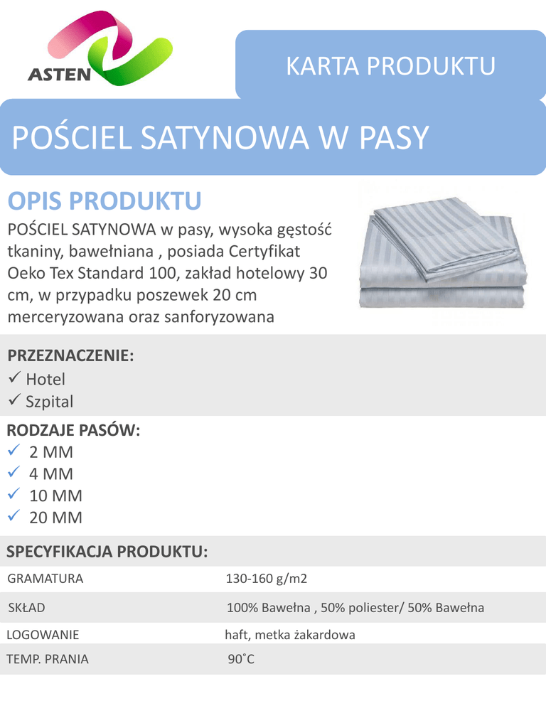KARTA PRODUKTU ASTEN POŚCIEL SATYNOWA W PASY OPIS PRODUKTU POŚCIEL SATYNOWA w pasy, wysoka gęstość tka i y, baweł ia a , posiada Certyfikat Oeko Tex Standard 100, zakład hotelowy 3 cm, w przypadku poszewek 20 cm merceryzowana oraz sanforyzowana PRZEZNACZENIE: Hotel Szpital RODZAJE PASÓW: 2 MM 4 MM 10 MM 20 MM SPECYFIKACJA PRODUKTU: GRAMATURA SKŁAD 130-160 g/m2 % Baweł a , 5 % poliester/ 5 % Baweł a LOGOWANIE haft, TEMP. PRANIA 9 ˚C etka żakardowa